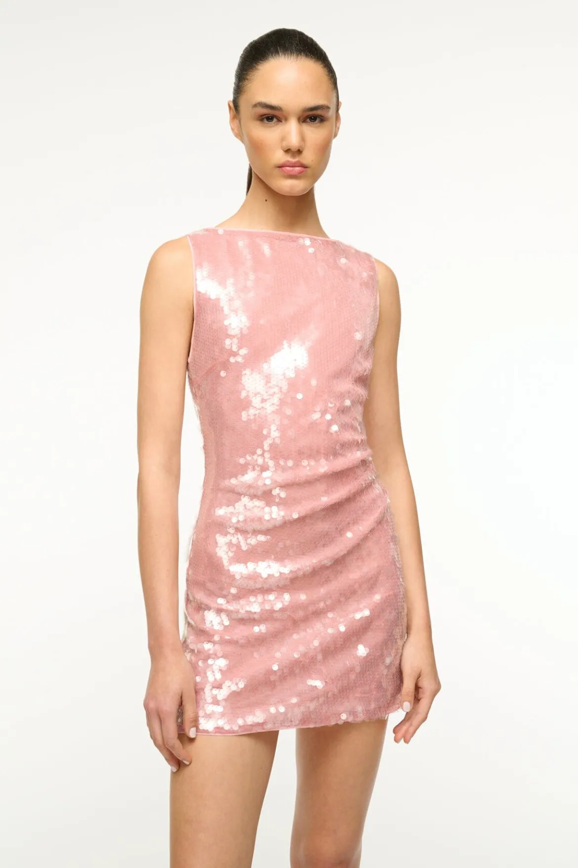 The Eton Dress is a boatneck mini dress with asymmetric draping at the waist and a hidden center back zipper.
