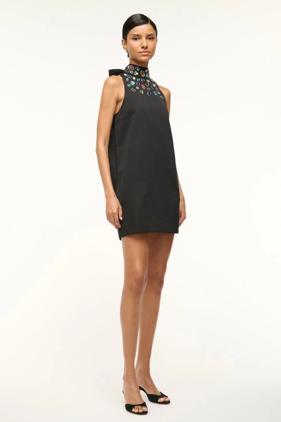 The Finn Dress is inspired by our Mini Ilana, this mini dress is the perfect cocktail dress with multicolored beading and cabachons at the neck.