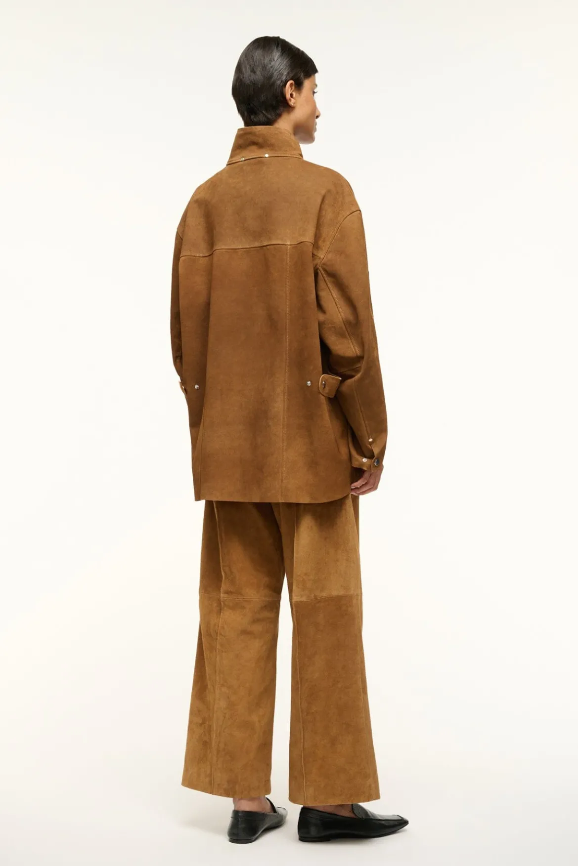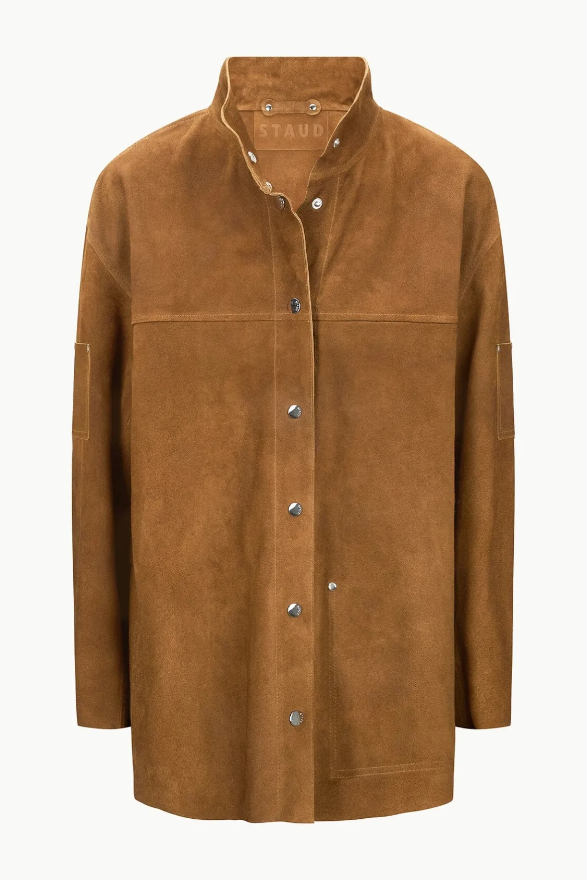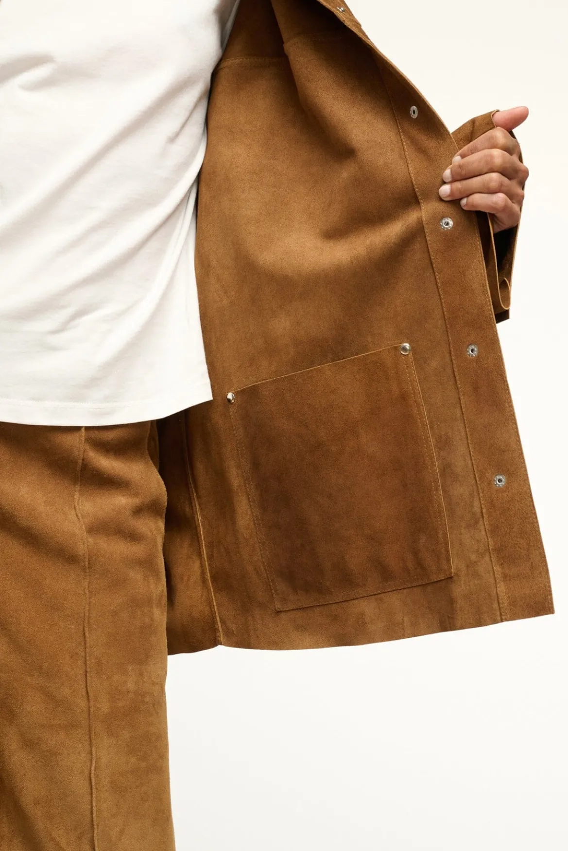 The Foundation Jacket is a suede oversized boxy fitting coat with a standing collar, a center front metal logo snap closure and adjustable tabs at the sides. It features an interior pocket and metal rivet details throughout.