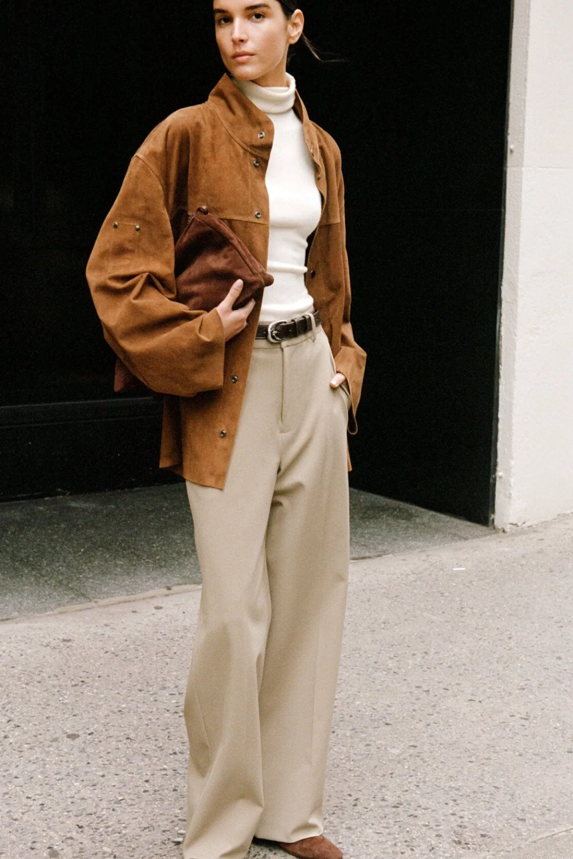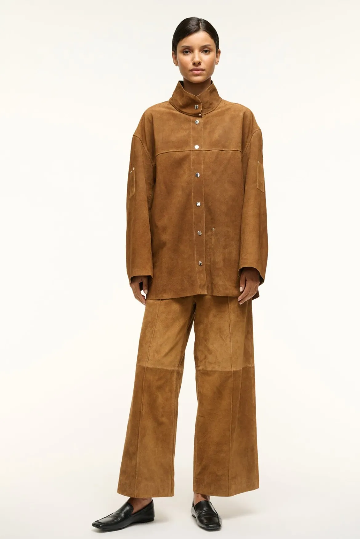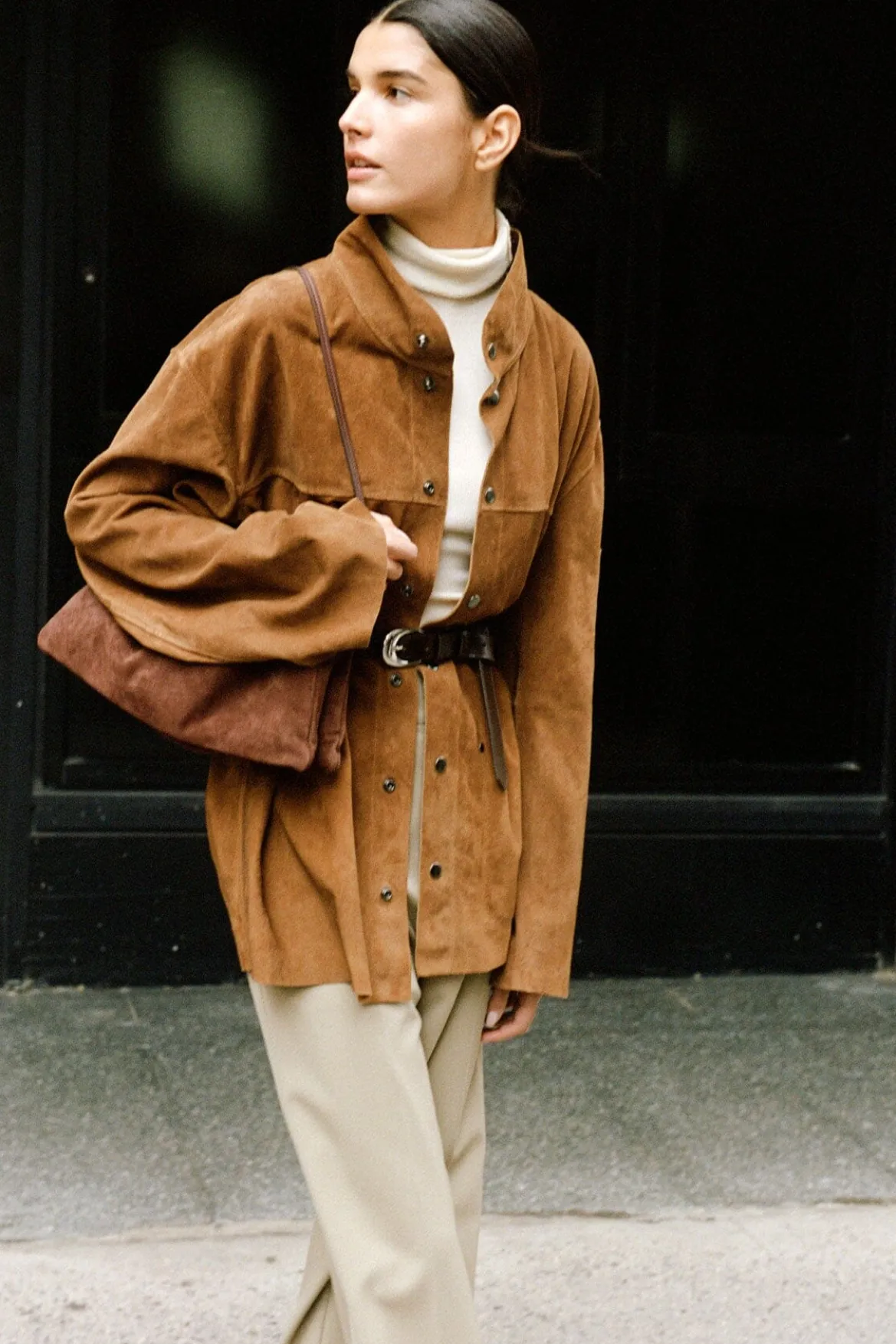 The Foundation Jacket is a suede oversized boxy fitting coat with a standing collar, a center front metal logo snap closure and adjustable tabs at the sides. It features an interior pocket and metal rivet details throughout.