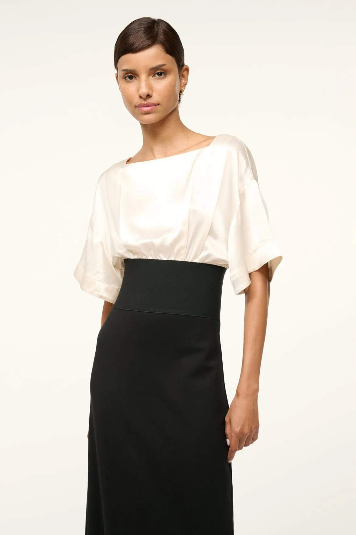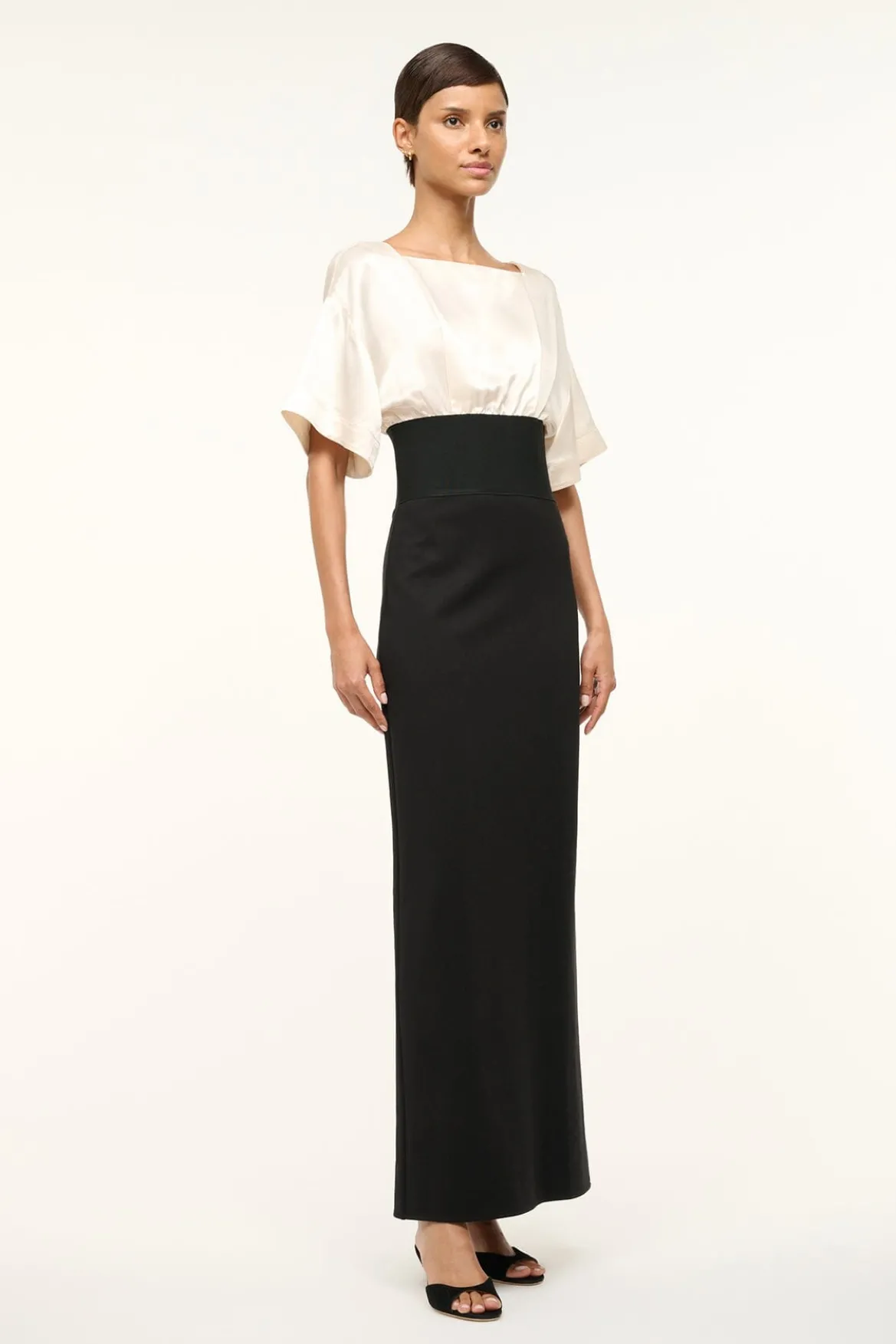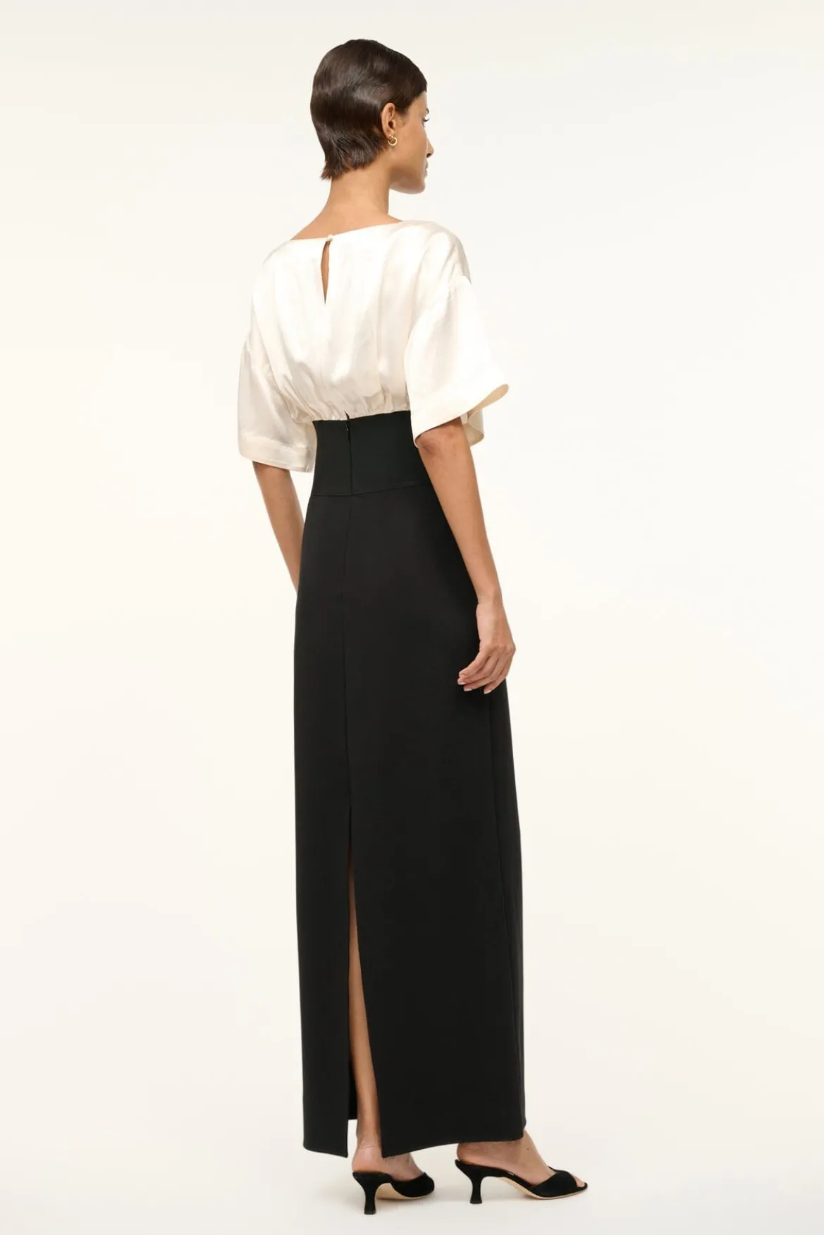 The Garnet Dress is a maxi length satin evening gown with a wide square neck, short oversized sleeves, and a fitted waist.