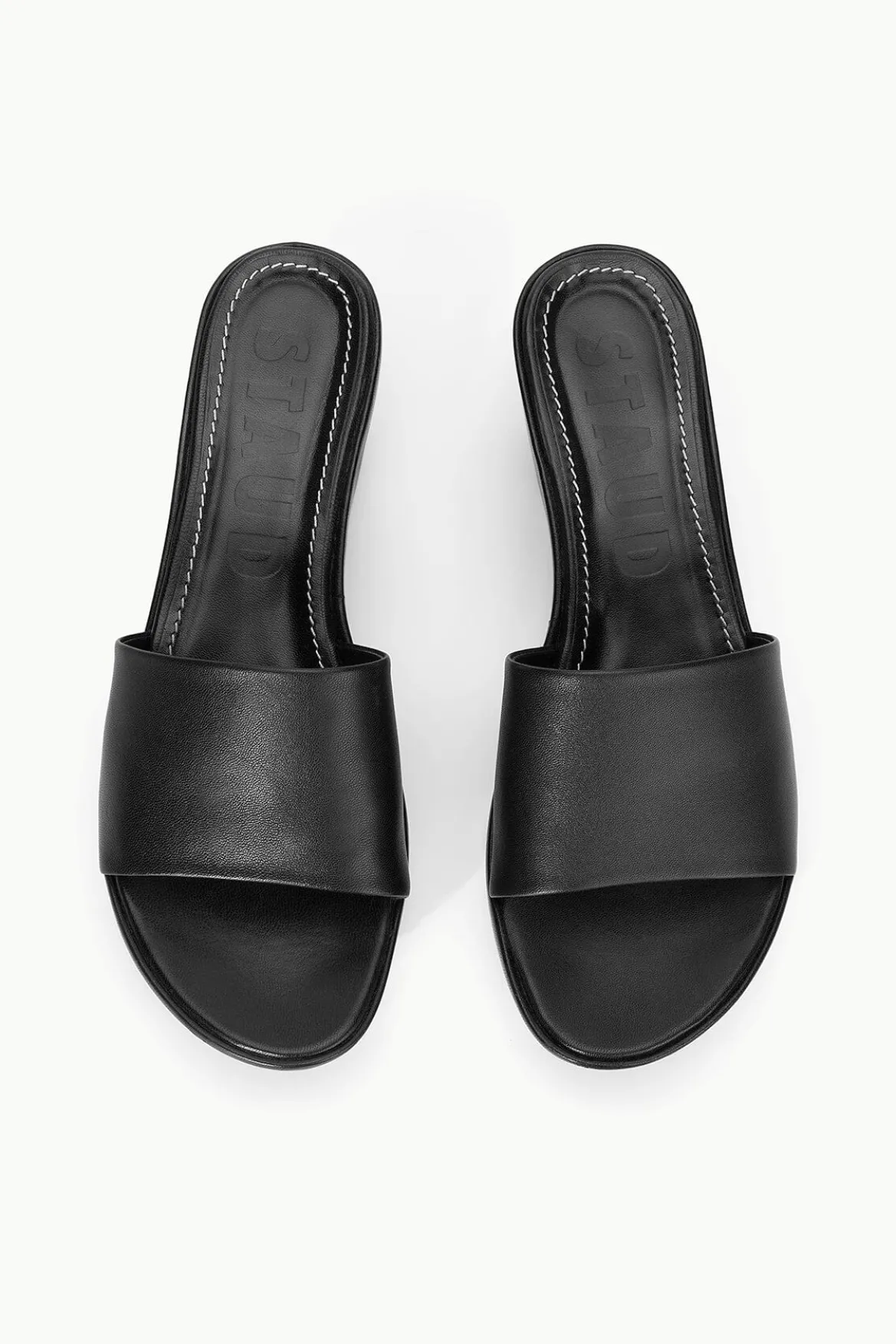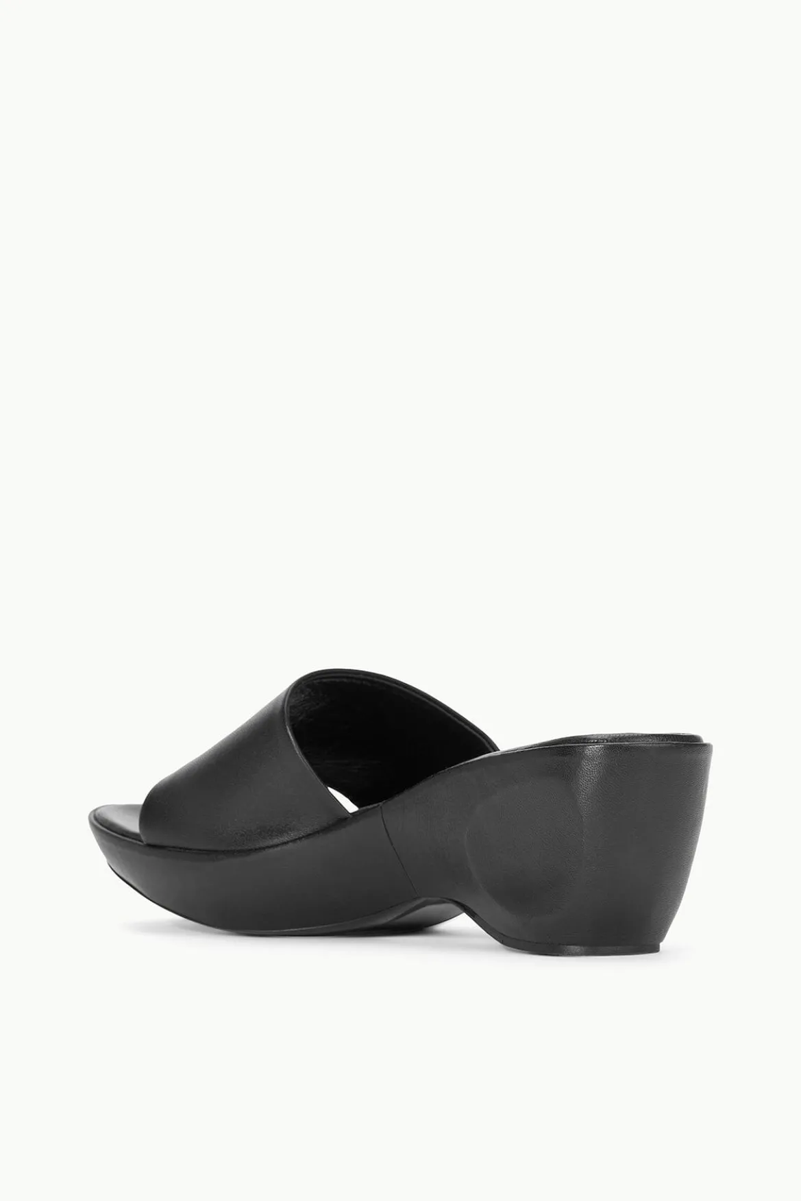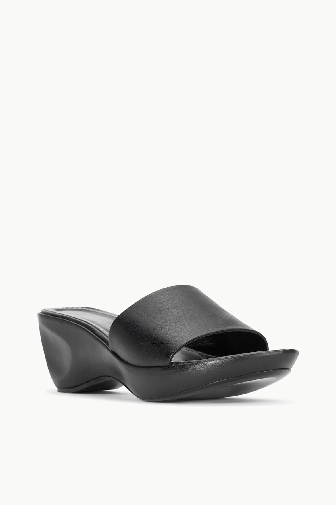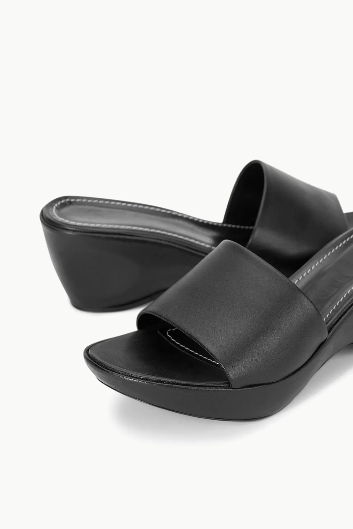 The Ginny Wedge is a platform slide, featuring a leather-wrapped wedge, a rounded toe, and a sleek leather band upper.