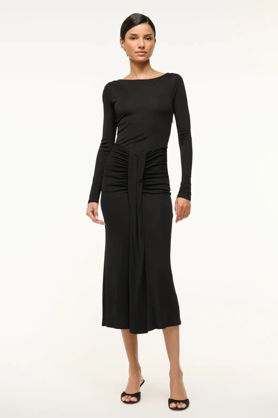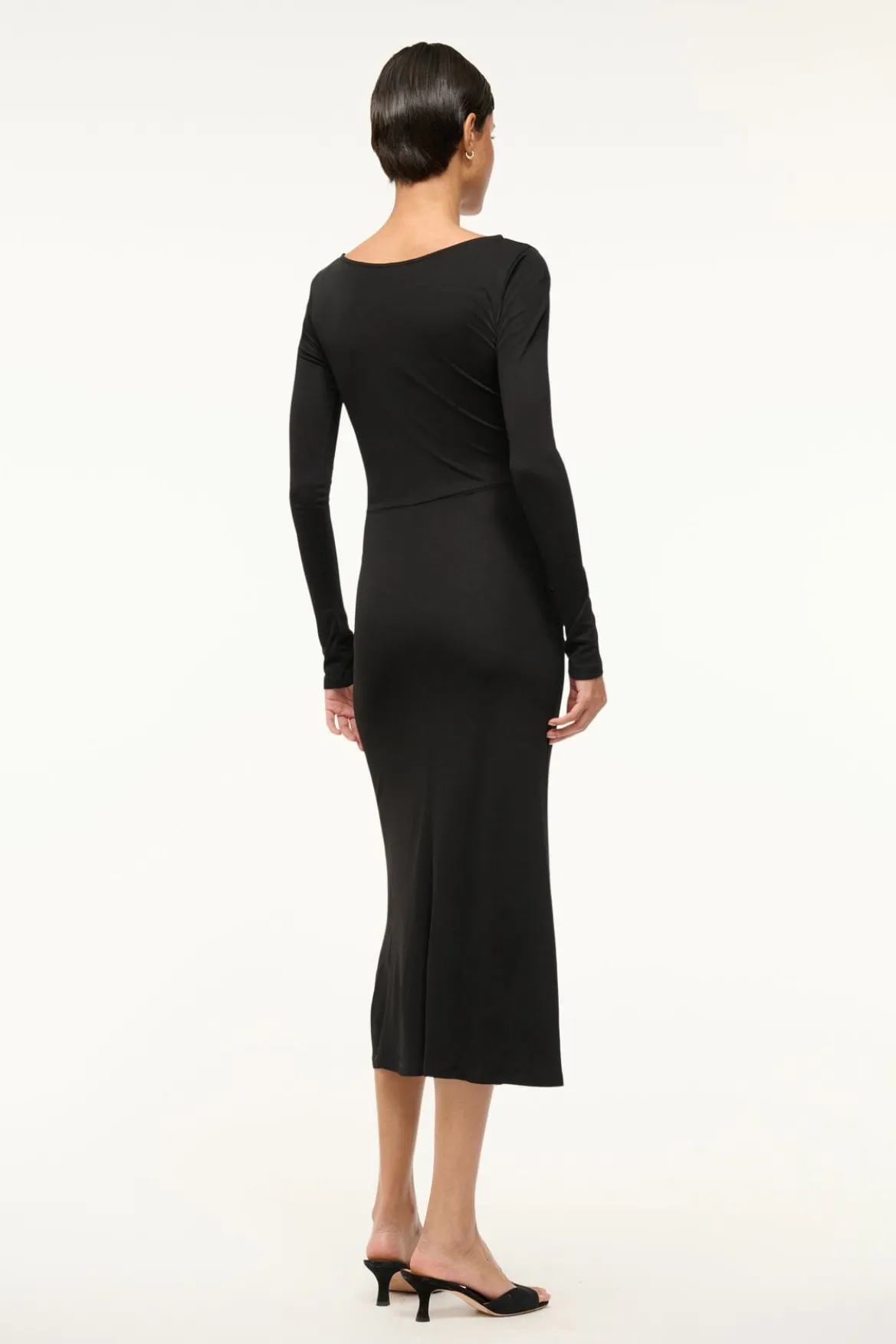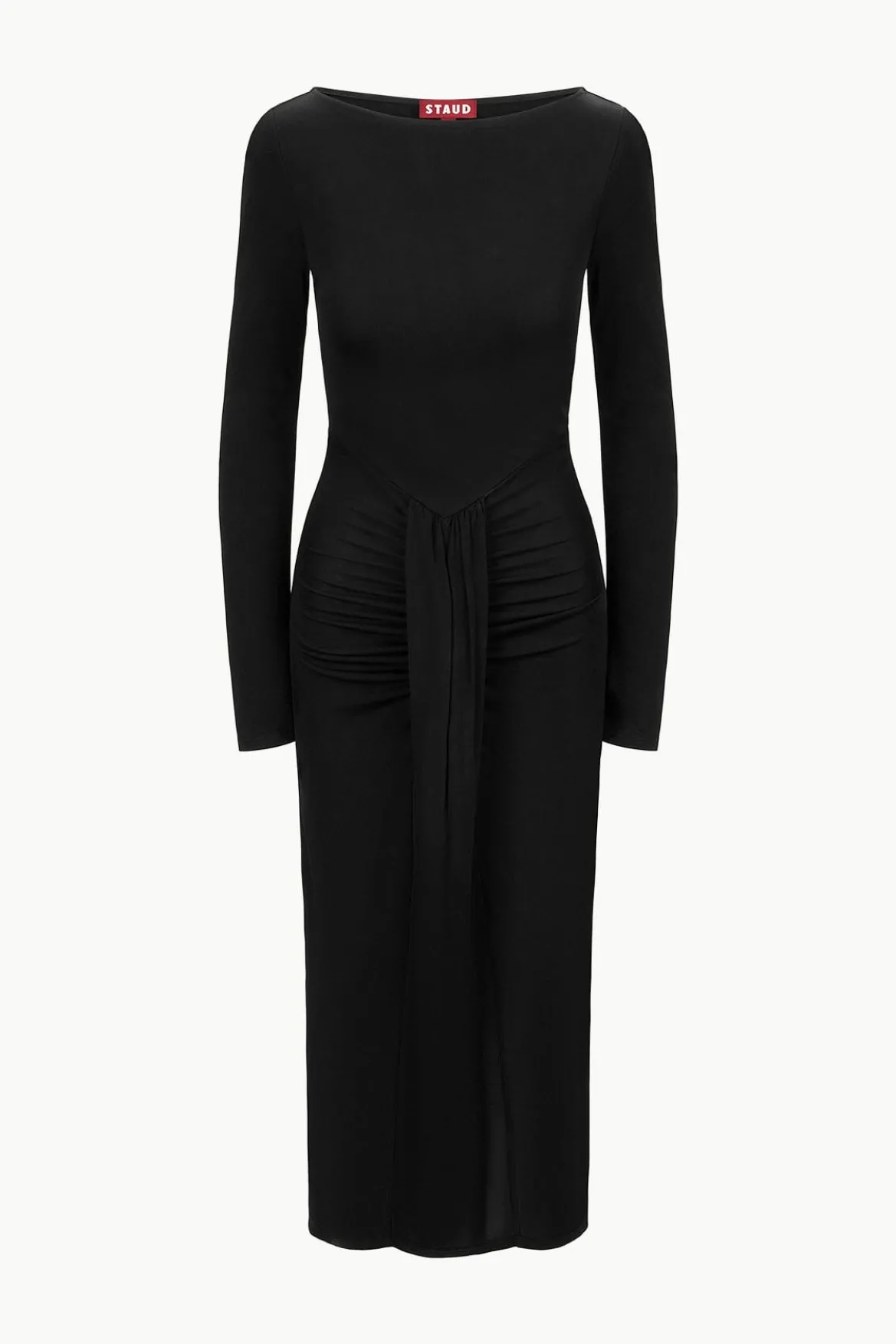 The Gres Dress is a boatneck long sleeve jersey dress with a ruched midi length skirt. This dress features a hidden side zipper for ease.