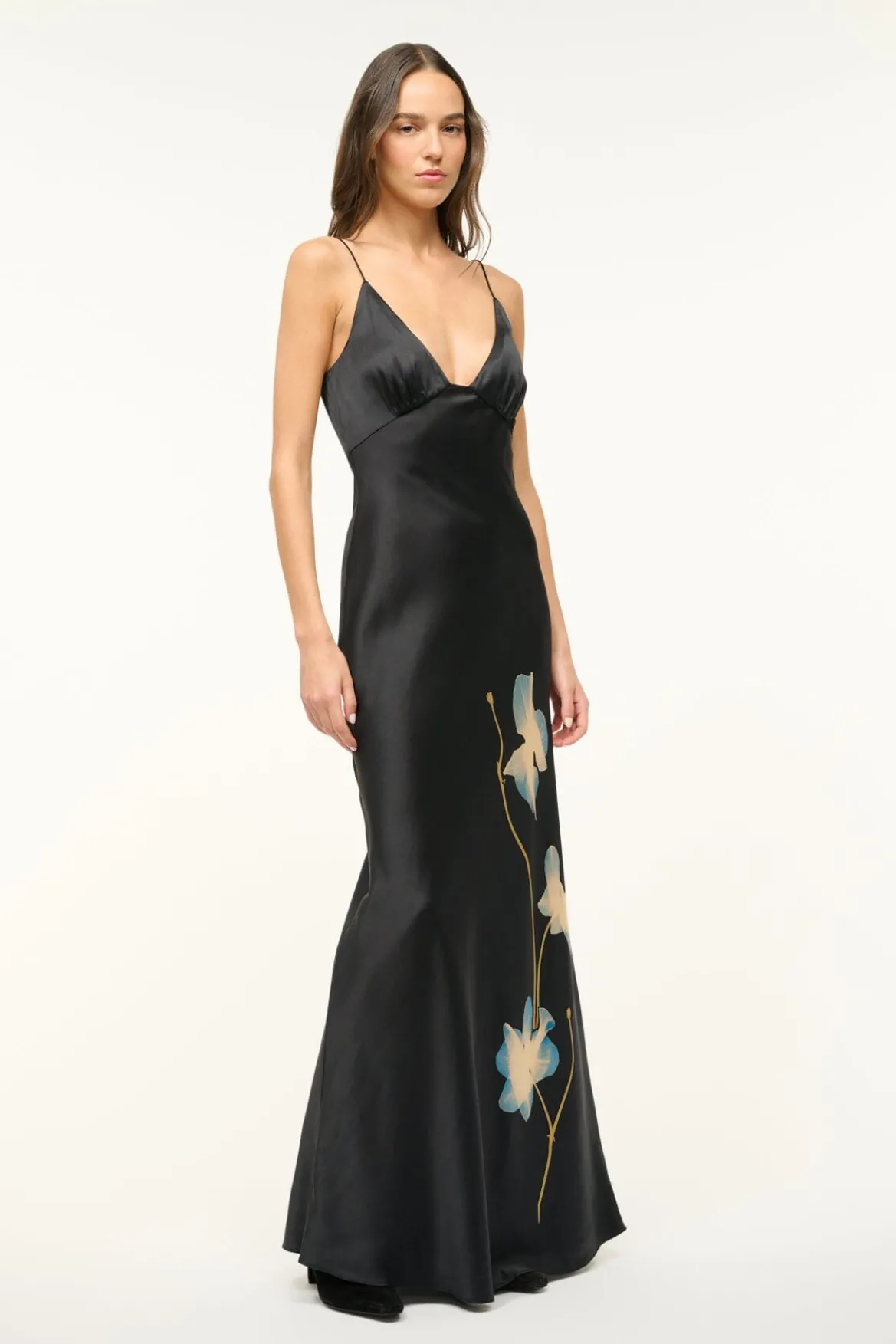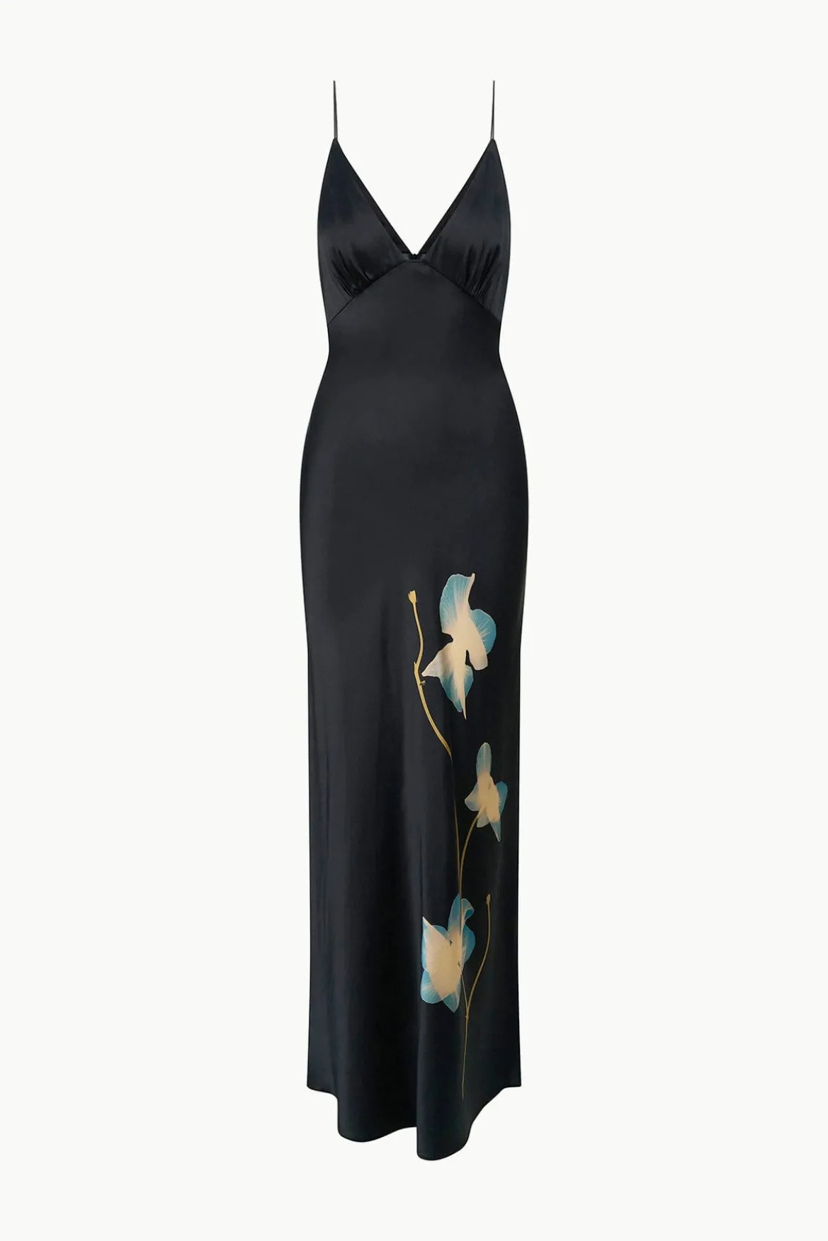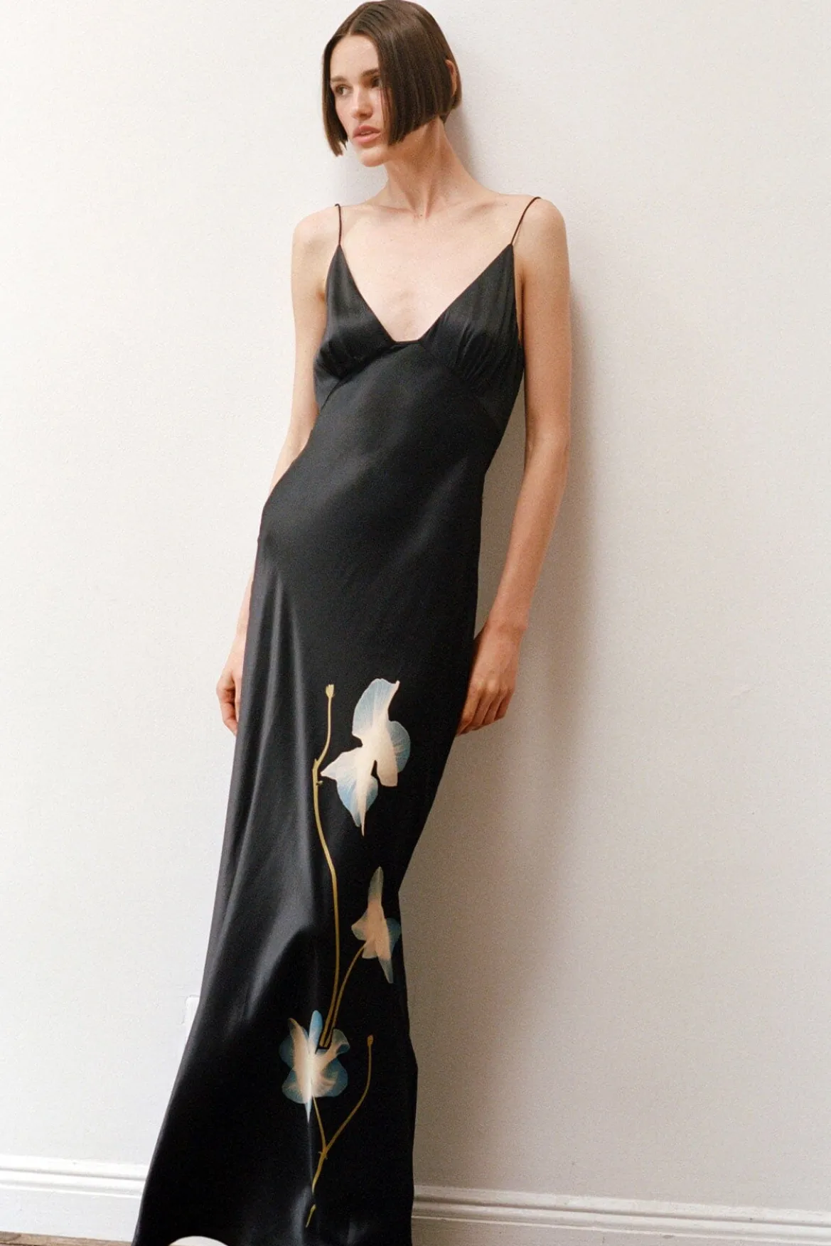 A maxi dress crafted in silk satin, the Hank features classic slip dress details in a v-neckline and spaghetti straps.