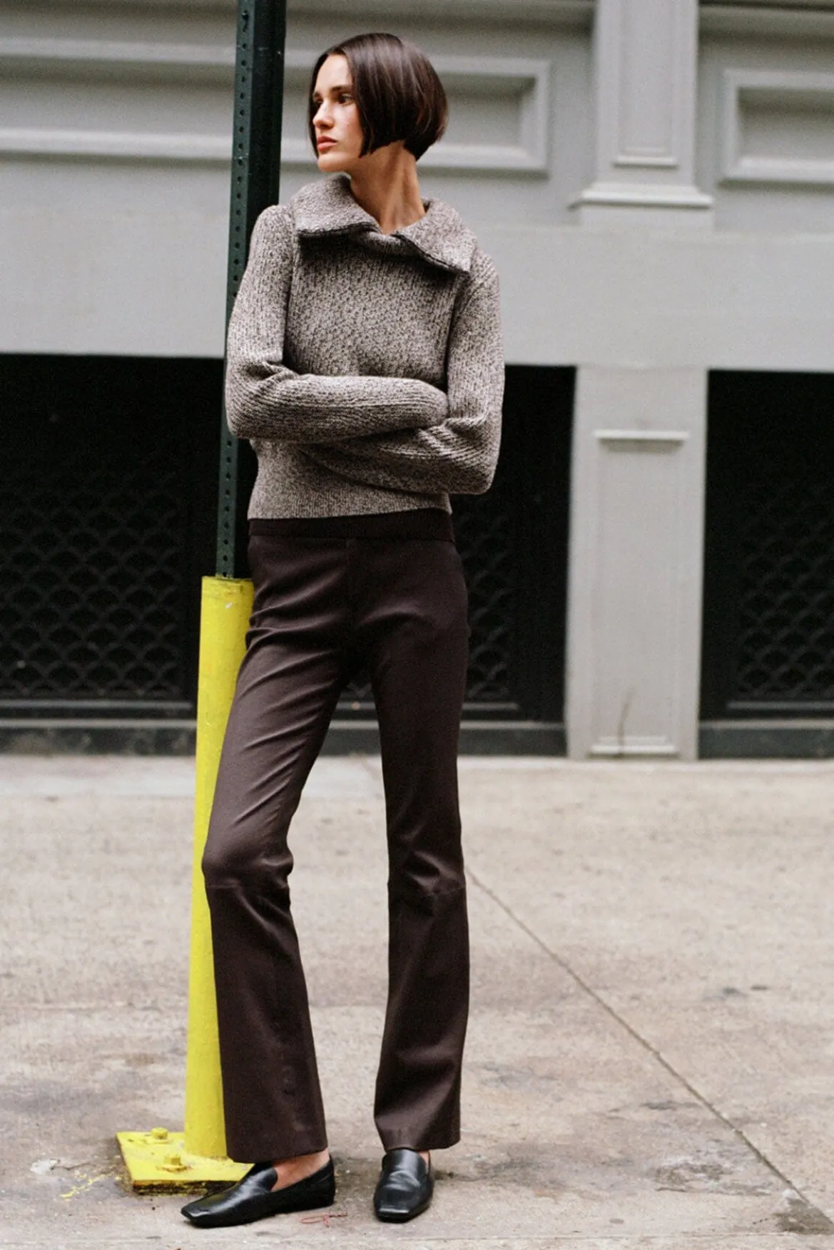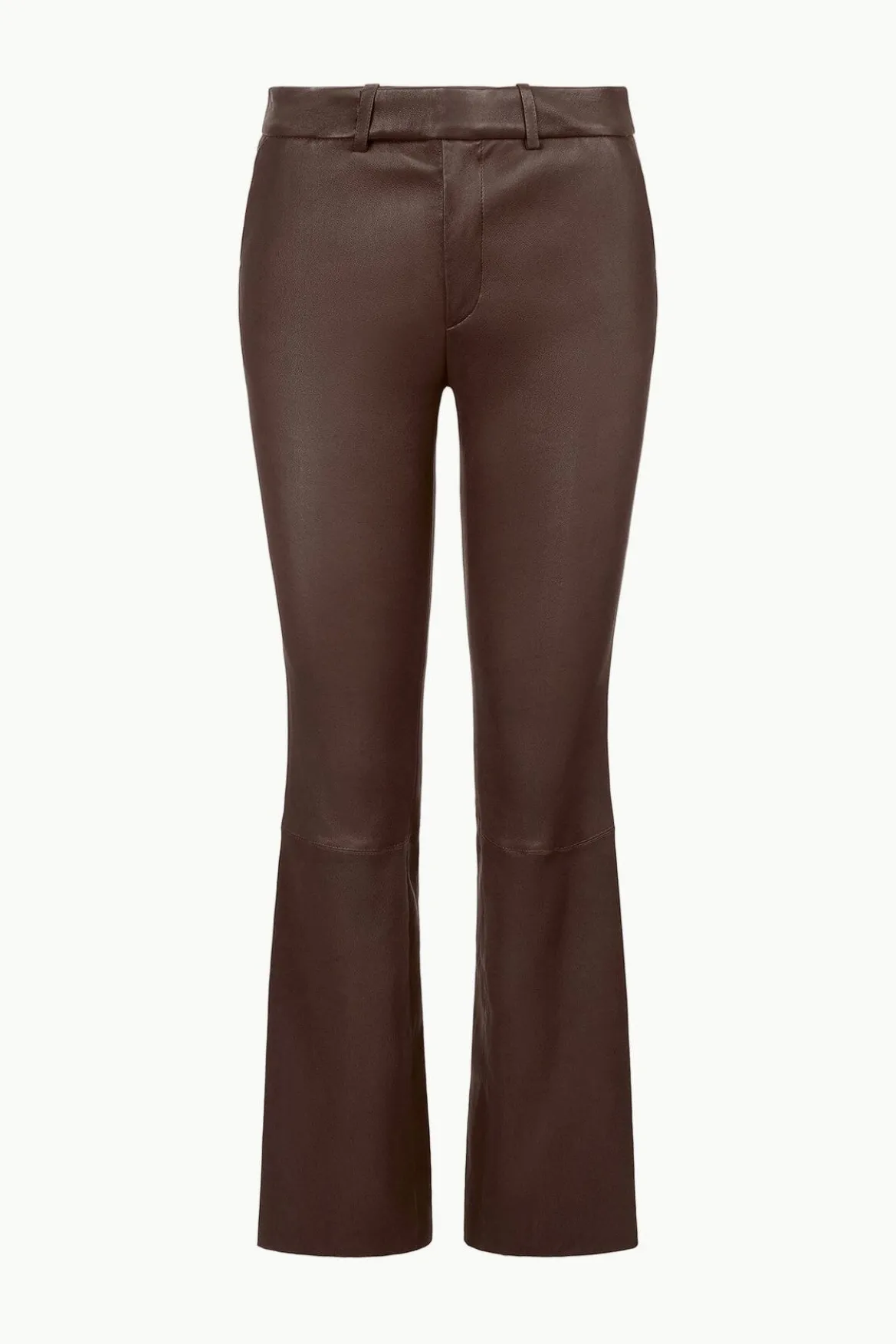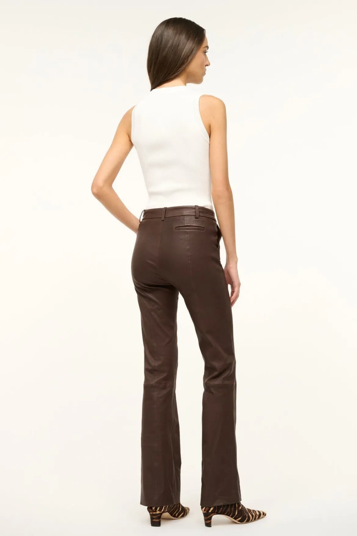 A boot cut trouser crafted from a soft, stretchy lamb leather. The Hanover features a mid rise with zipper fly and back welt pocket.