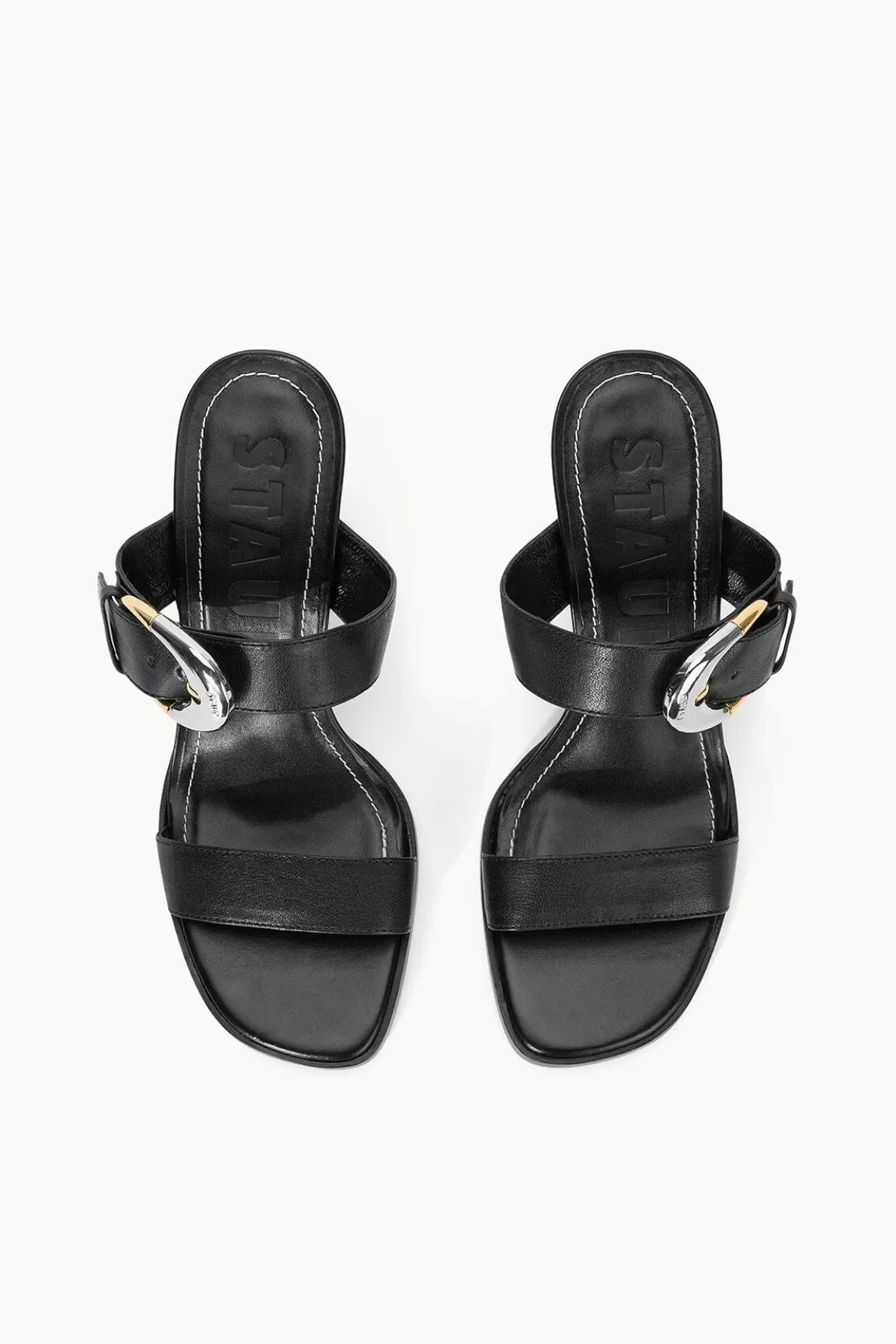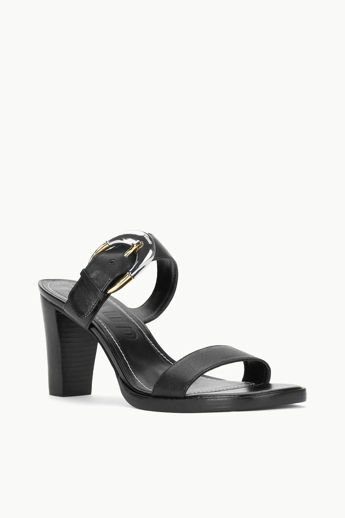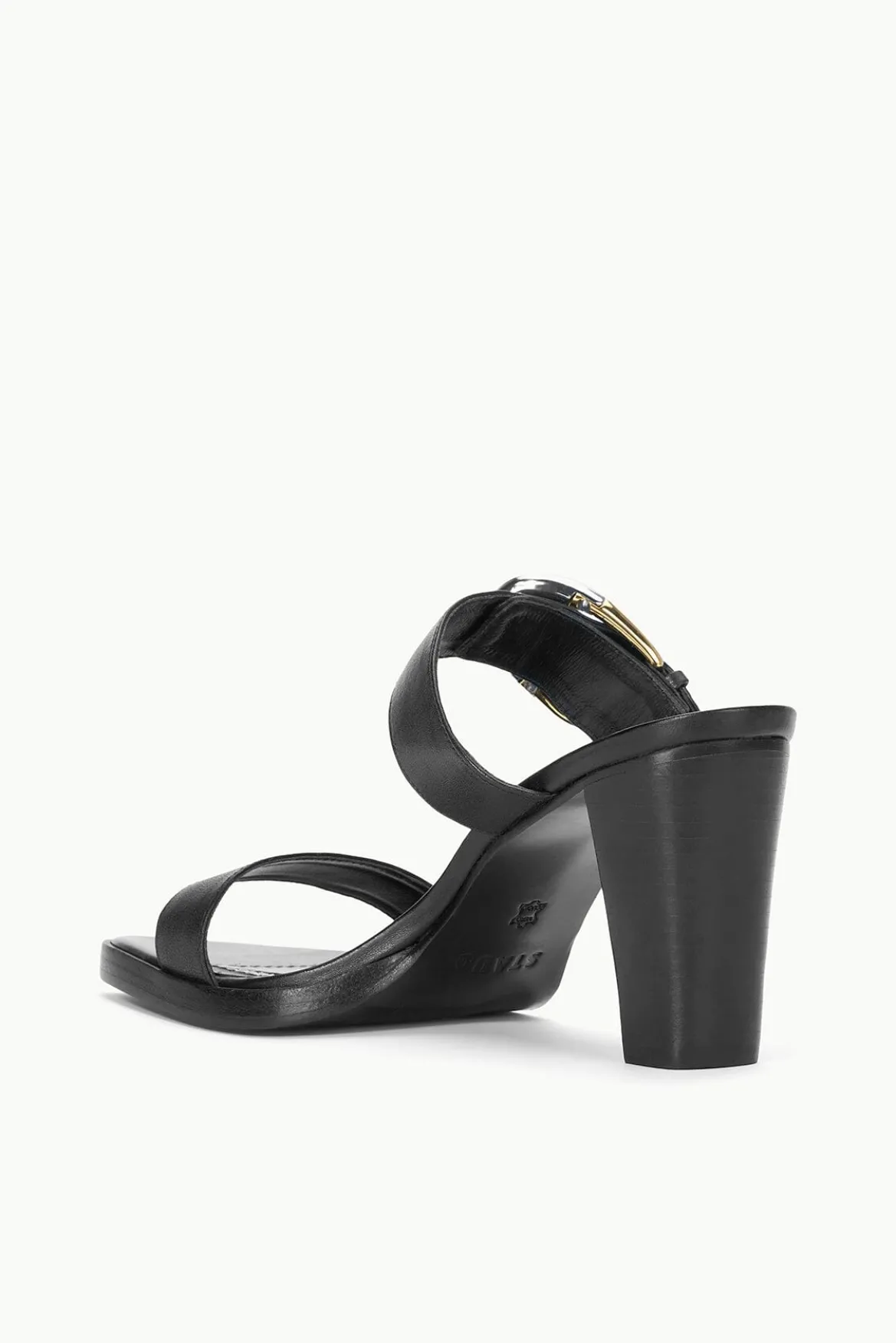 A stacked leather heel with double strap upper, the Harlow High Heel features moon buckle details on adjustable leather straps and leather lining for added comfort.