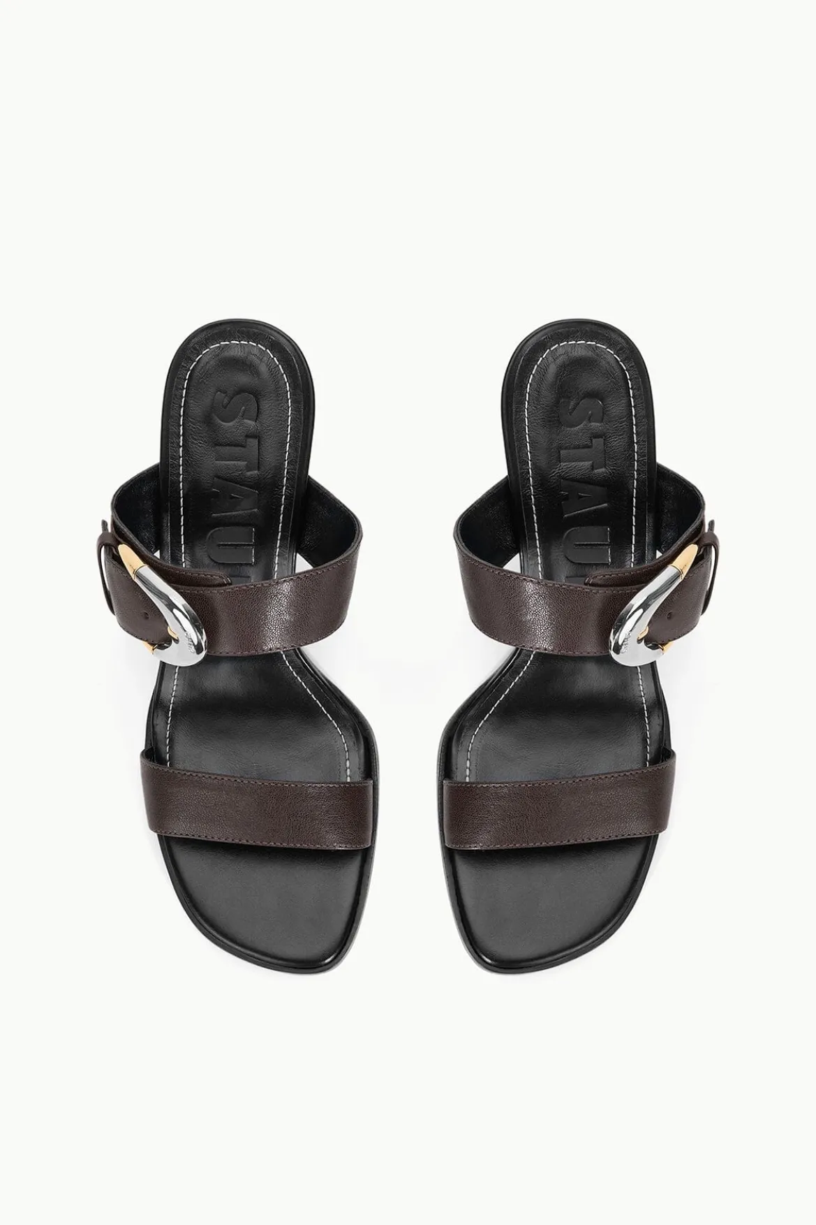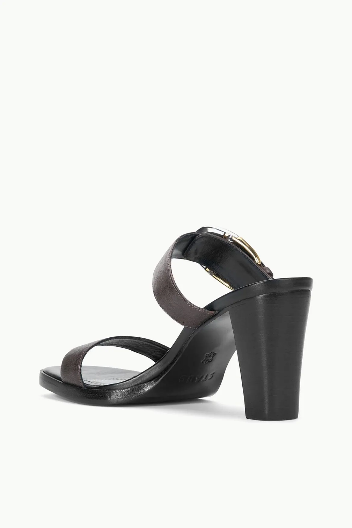 A stacked leather heel with double strap upper, the Harlow High Heel features moon buckle details on adjustable leather straps and leather lining for added comfort.