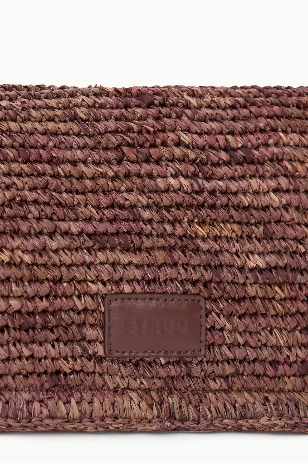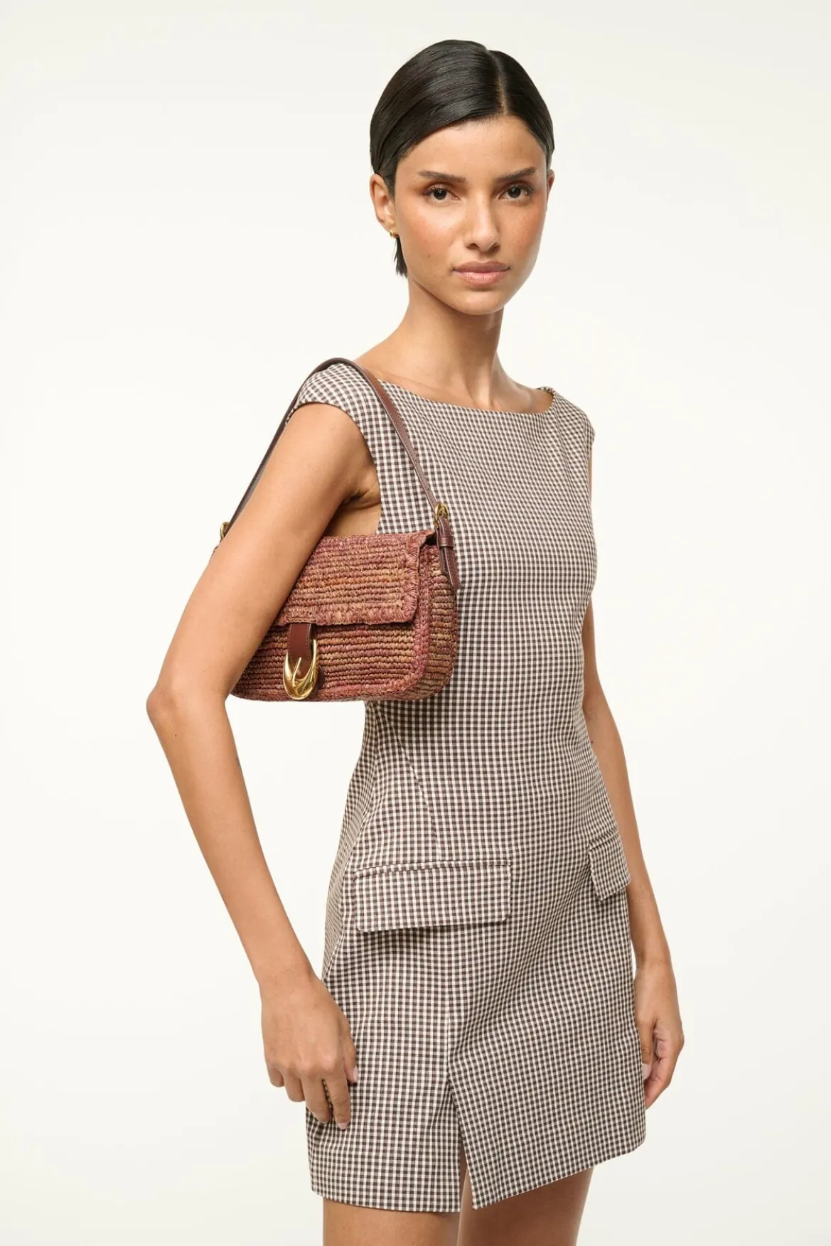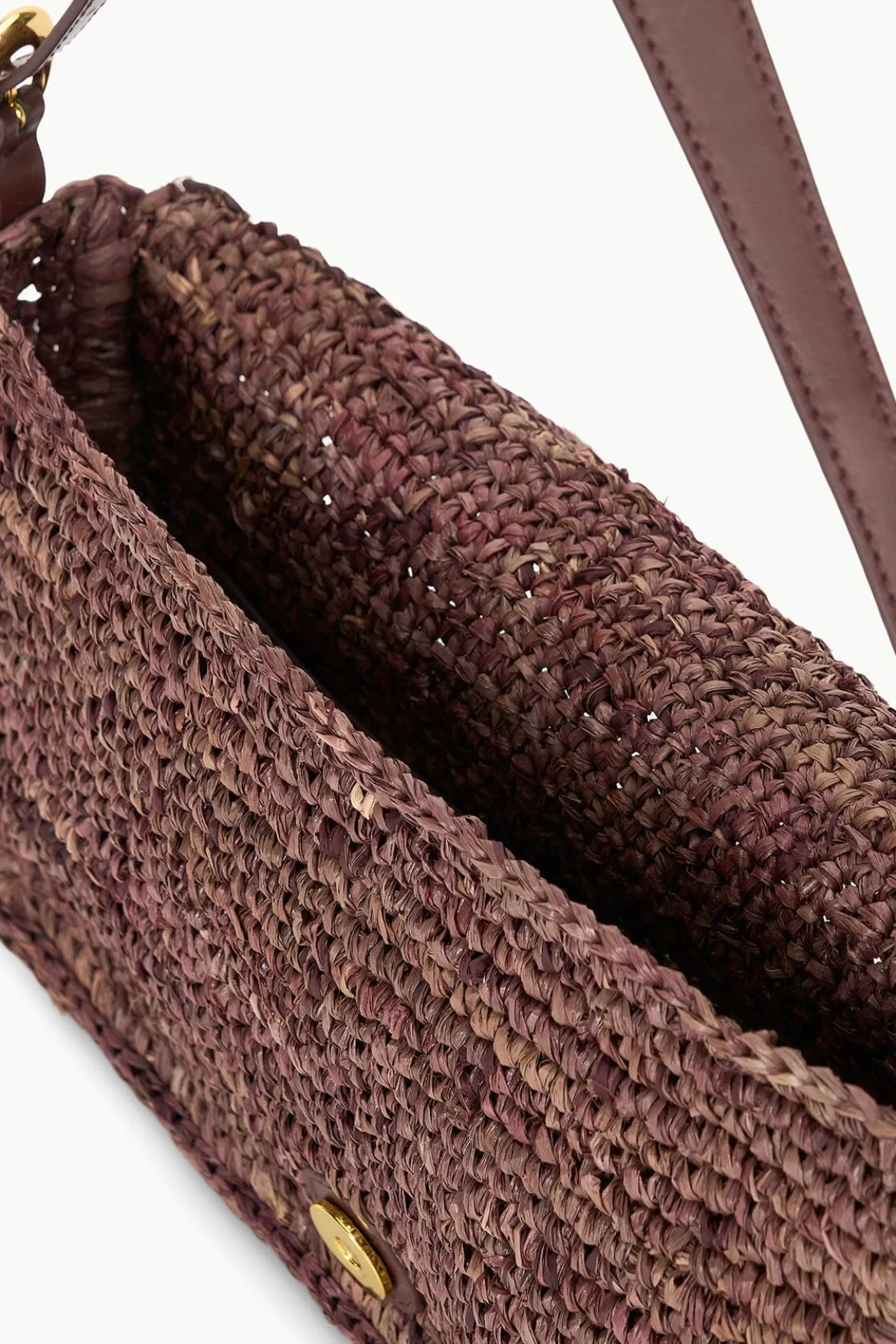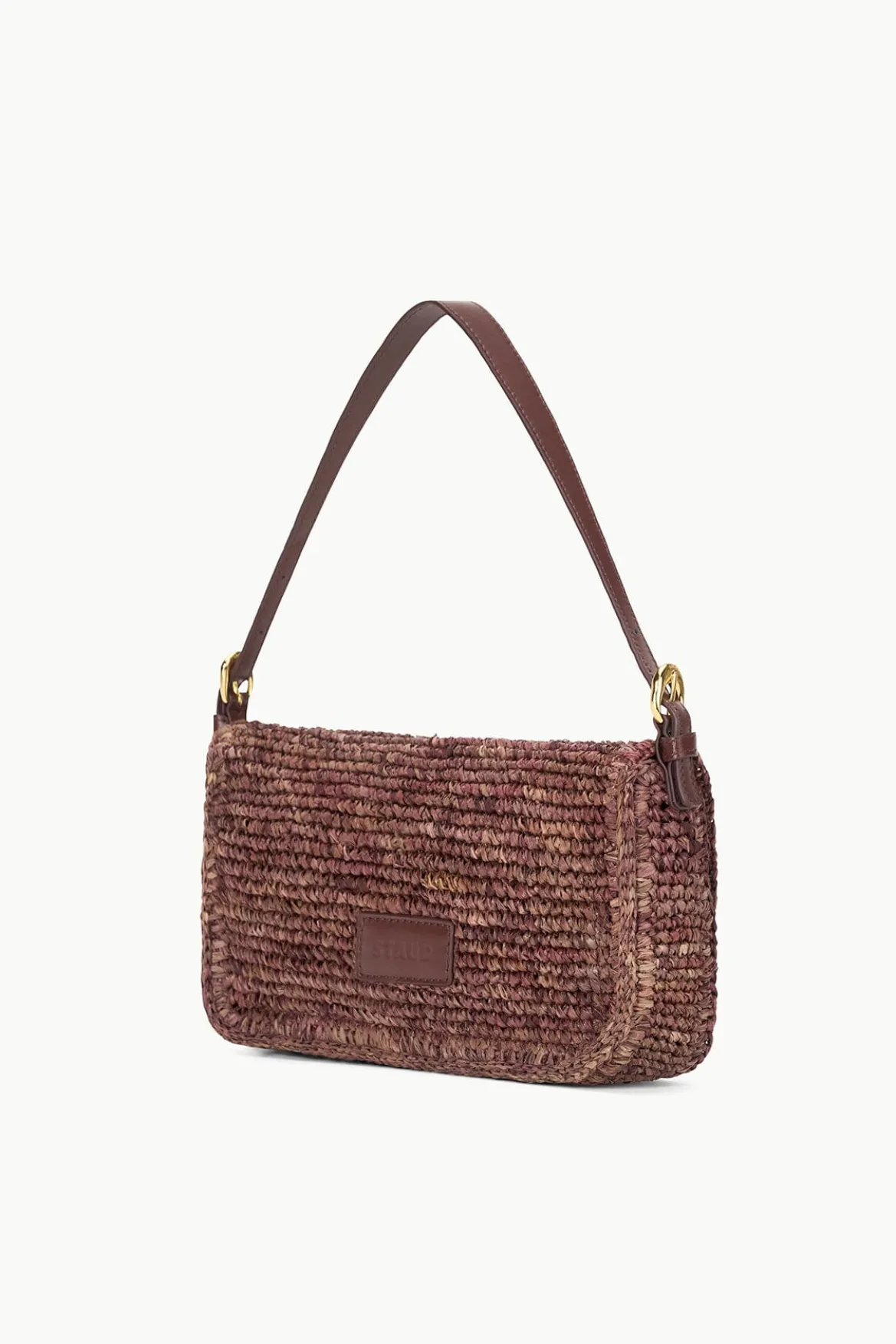 The Harlow Bag in raffia features our signature Moon buckle hardware, a snap closure and an interior pocket.