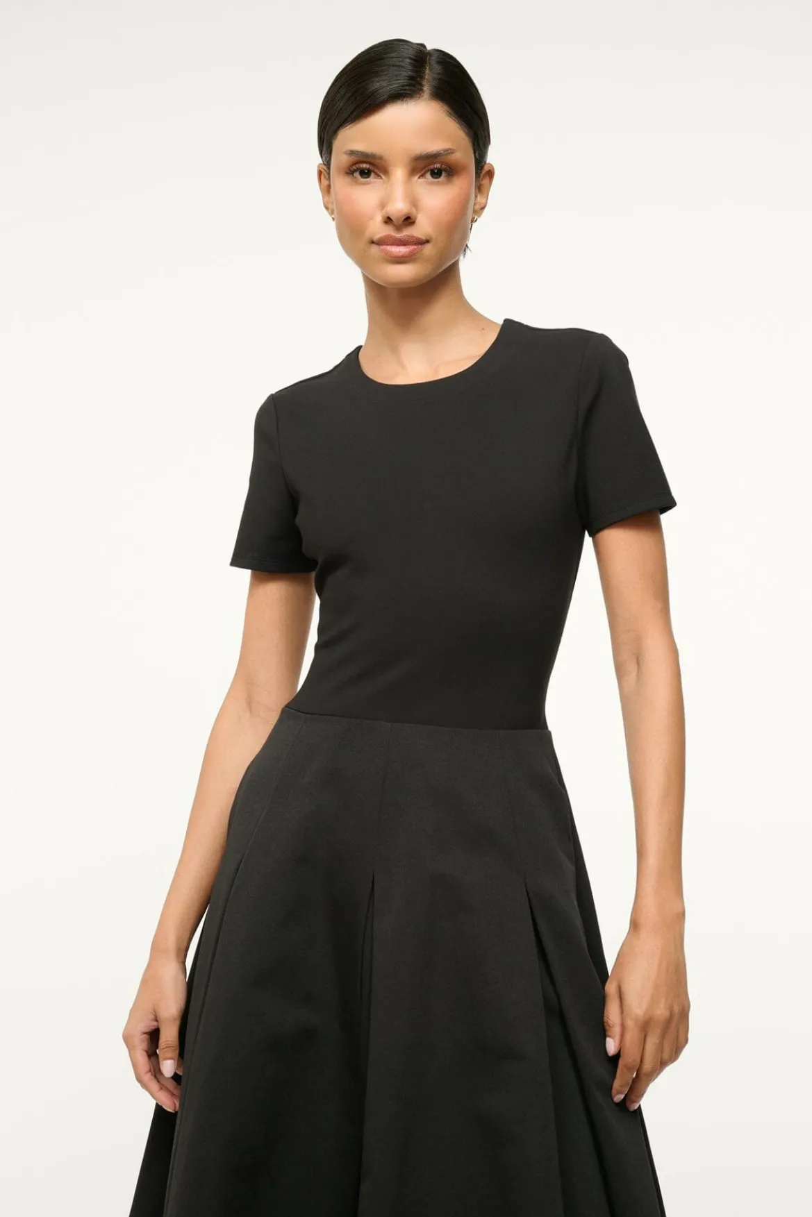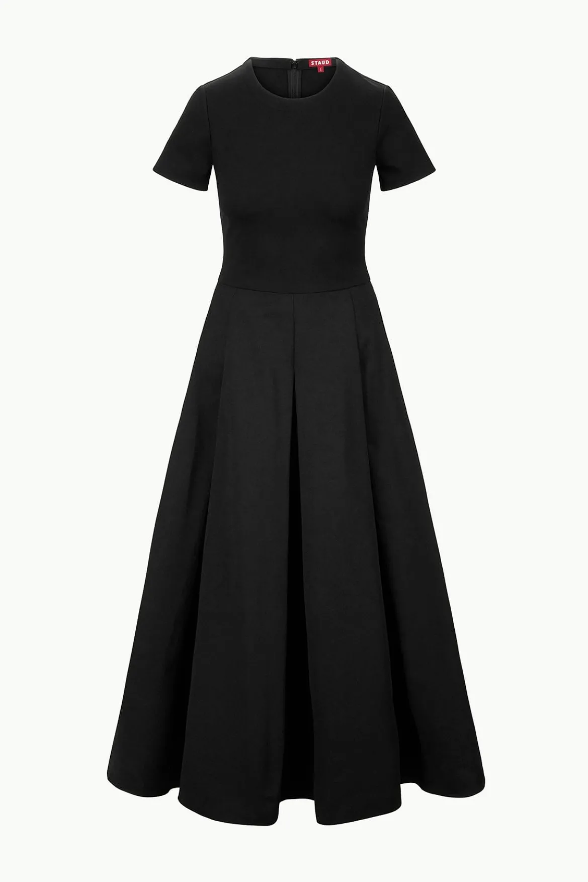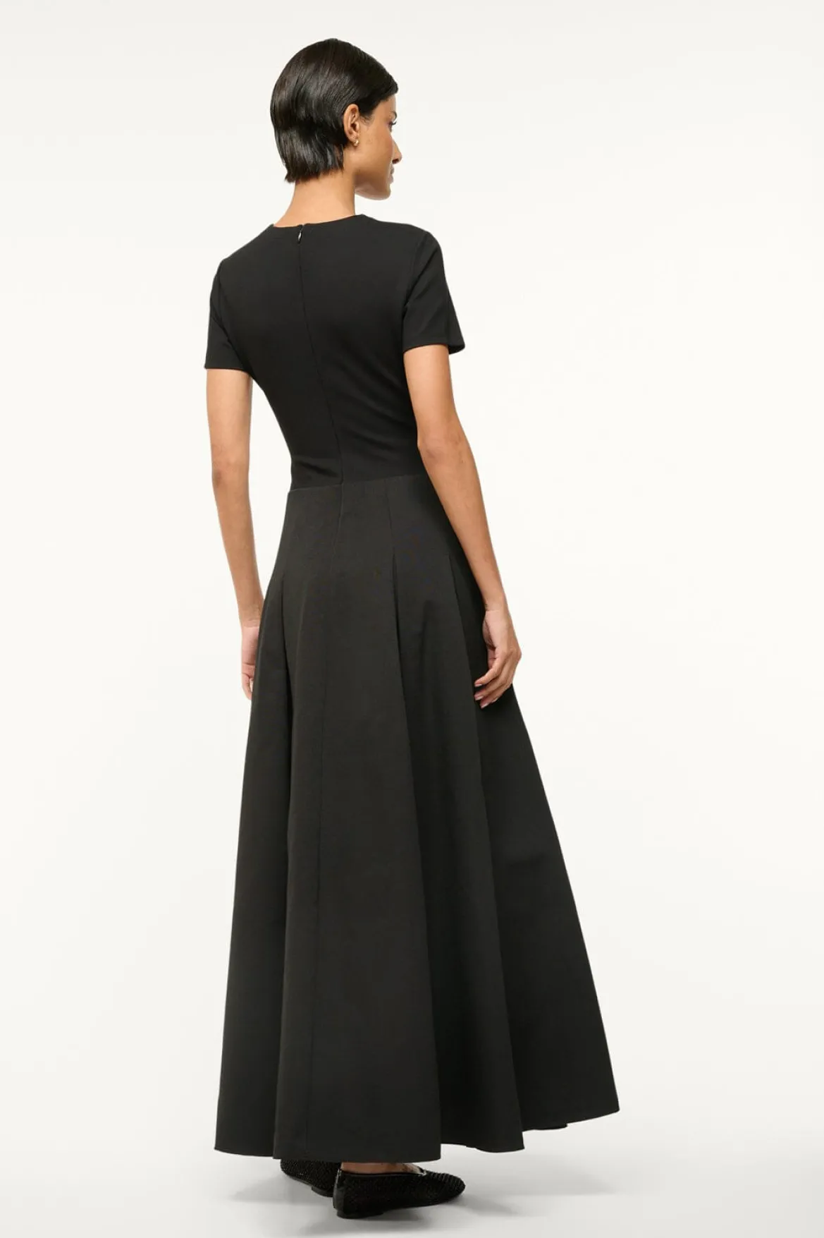 A mixed media gown with ponte tee bodice into sweeping A line contrast skirt crafted from grosgrain. The Hopper features wide box pleats and a hidden zipper closure down the back.