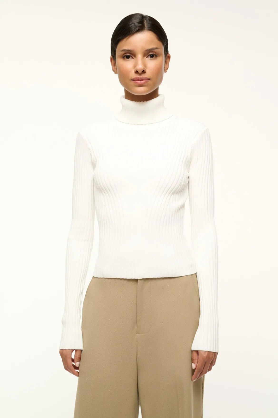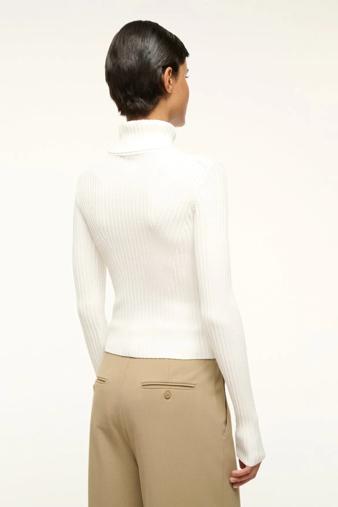 A fitted, long sleeve turtleneck, the Jace Top offers an essential layering piece for any seasonal transition. This style is made out of a rib knit fabric with fully fashioned directional pattern.