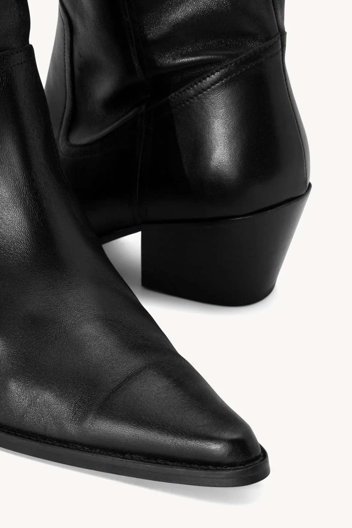 New for the season, the June is a true pointed toe cowboy boot made from soft leather. This style features western seaming and cuban heel.