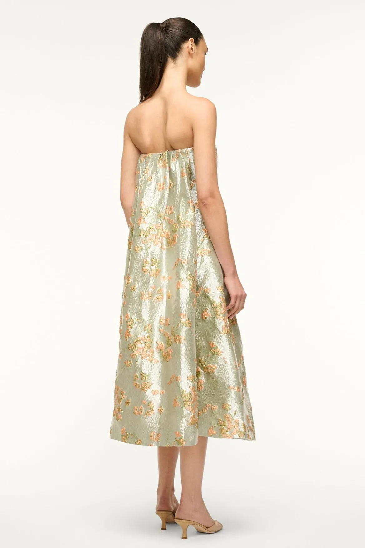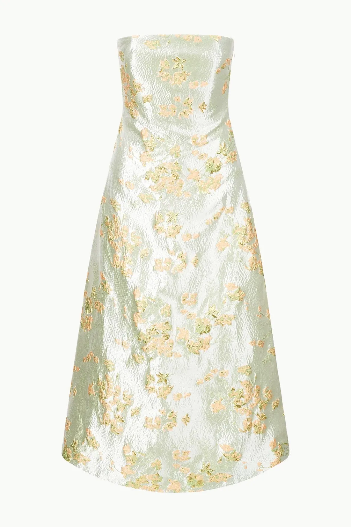 This is a strapless midi length gown with an interior corset and a pleated train at the back. The Kennedy is crafted from a metallic brocade fabric making it perfect for a special occasion.