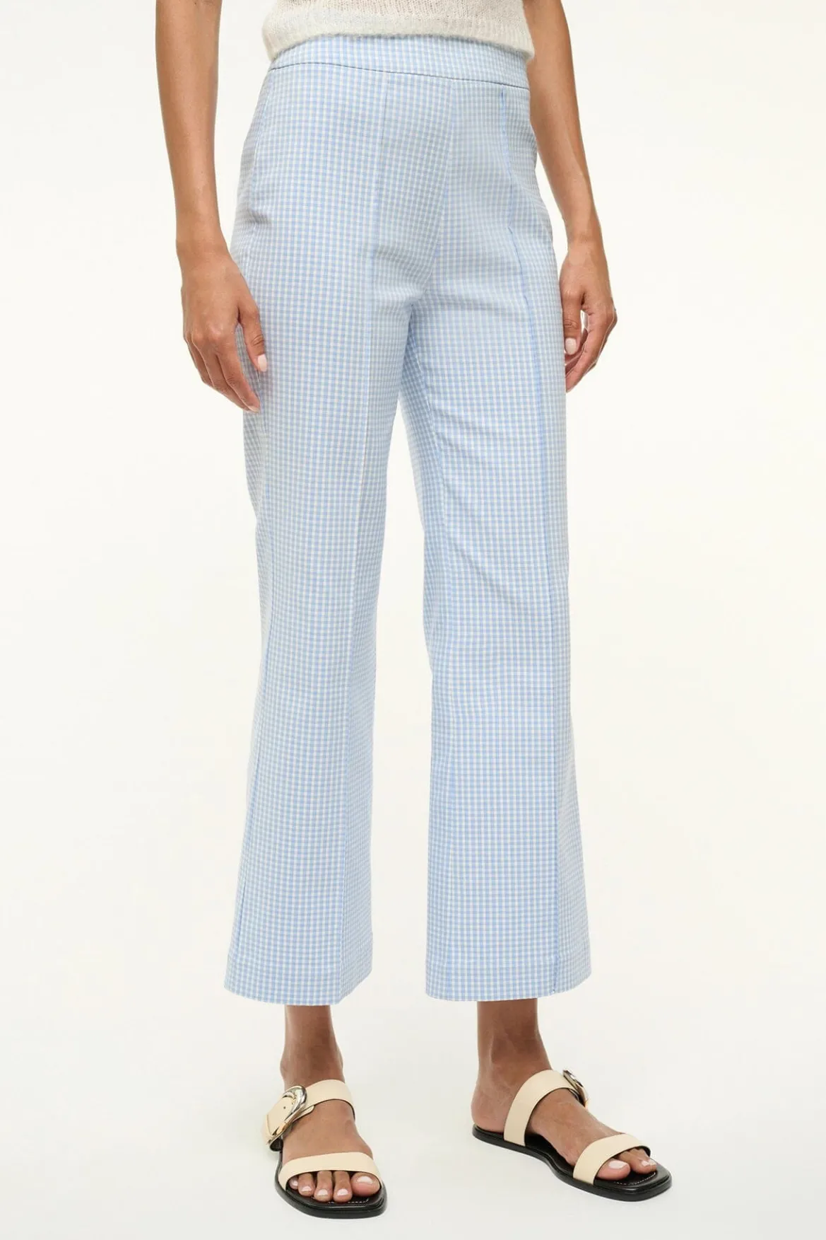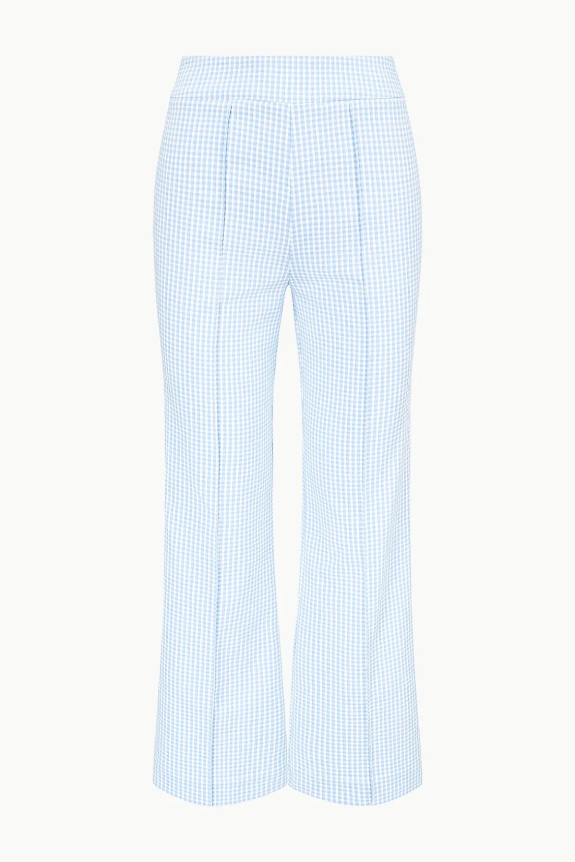 An ankle length pant made out of a stretch suiting fabric with princess seams at the front and a center back zipper.