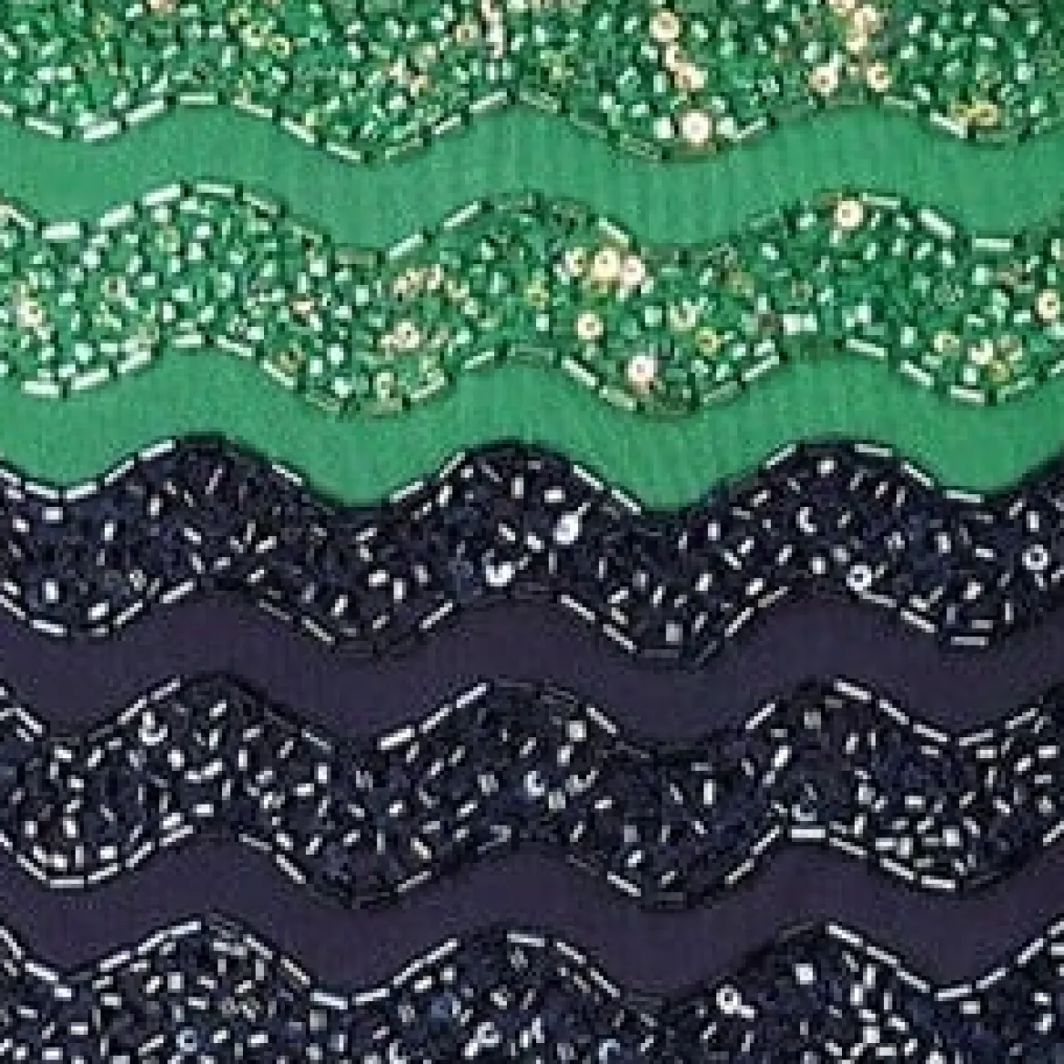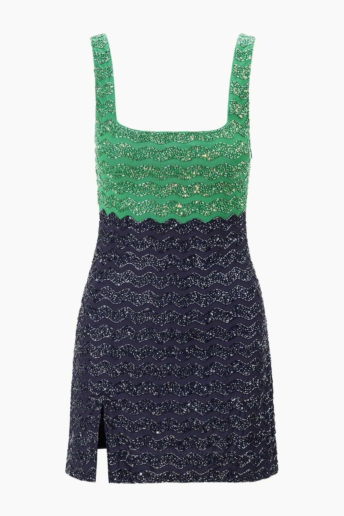 Our best-selling hand-beaded mini dress has been updated for Summer in a new color block print. This style is fully beaded in a wave-inspire motif and features a side slit and a hidden side zipper.