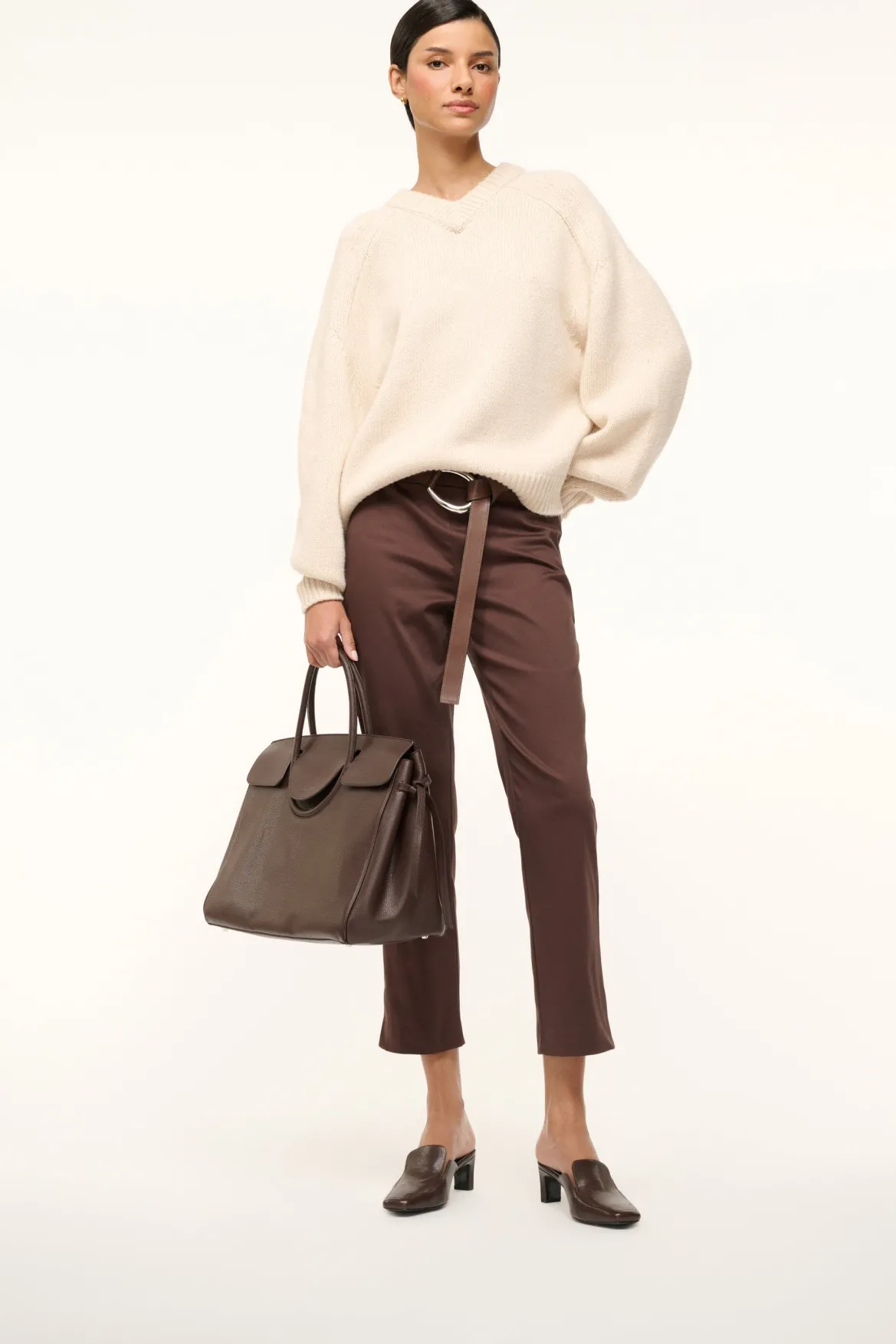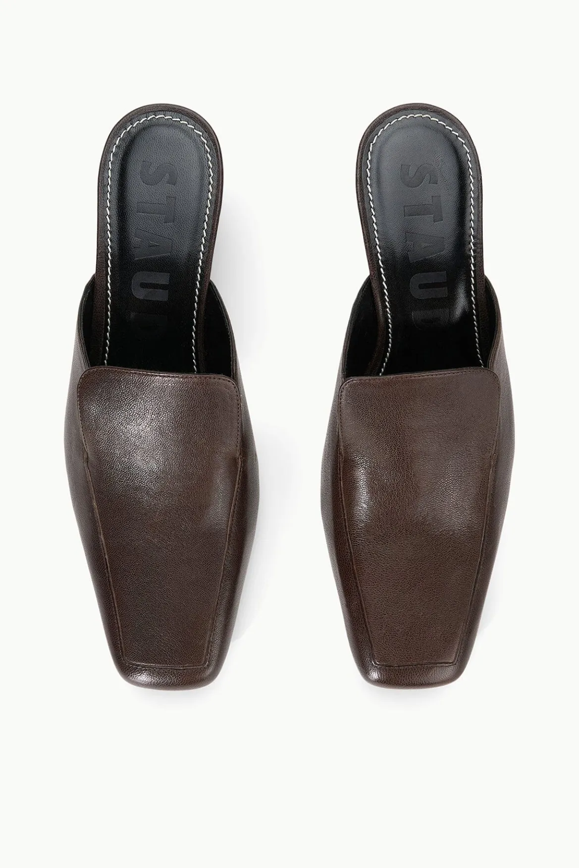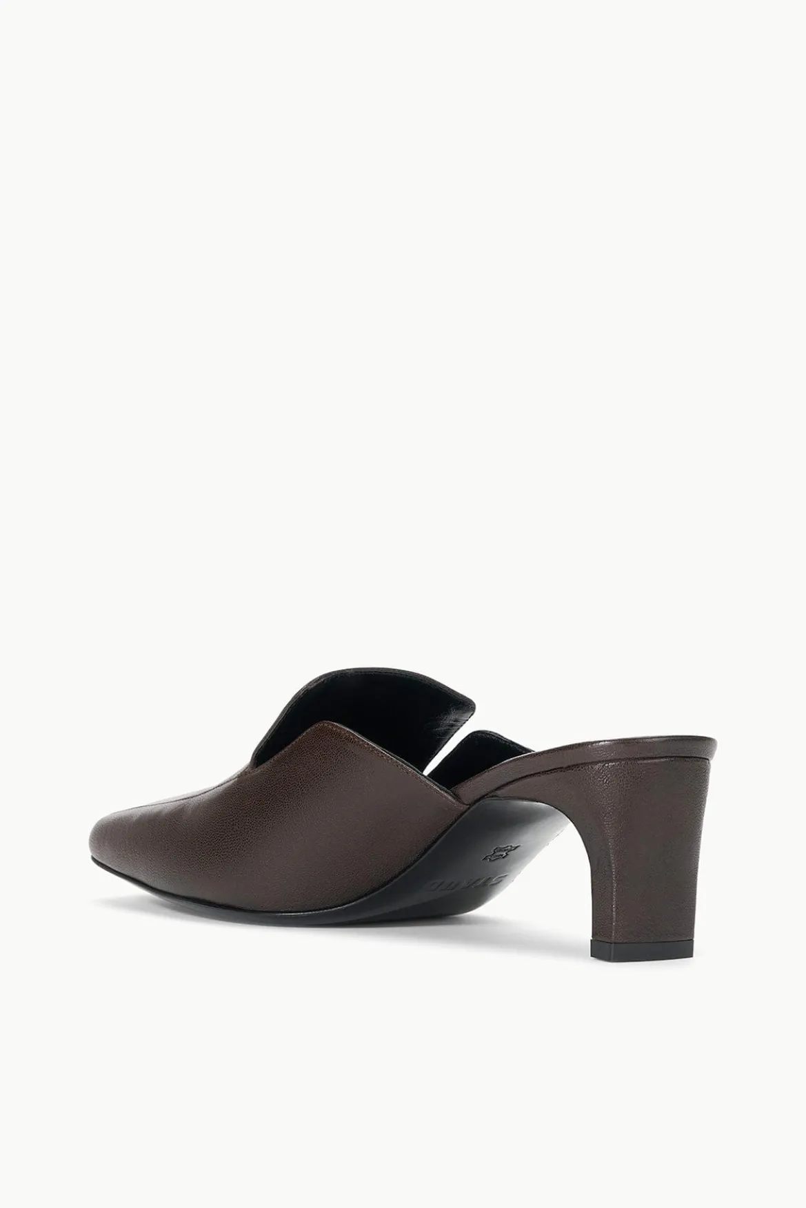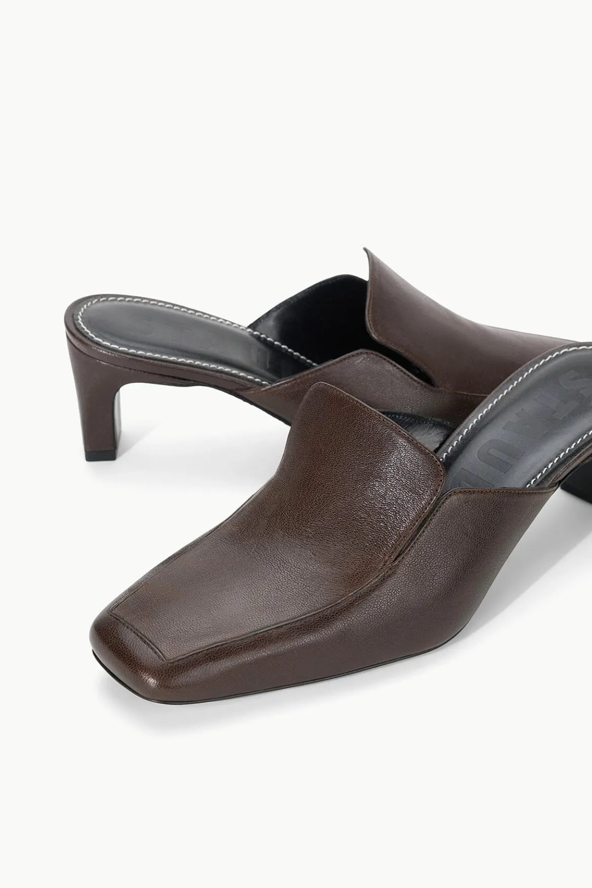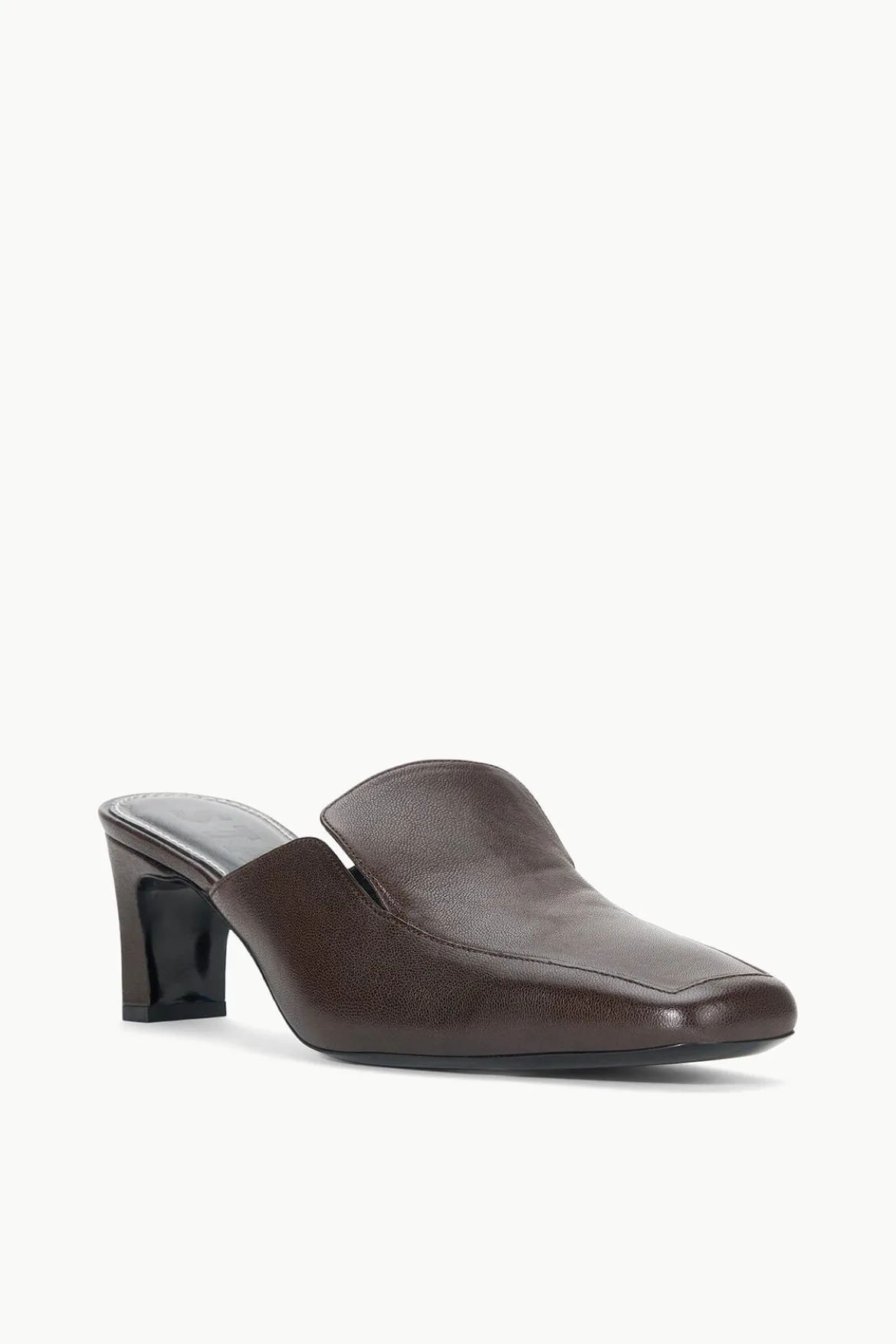 The Lee Loafer Mule is a heeled mule with a mixed satin and leather upper. It features a wide kitten heel and a subtle square toe.