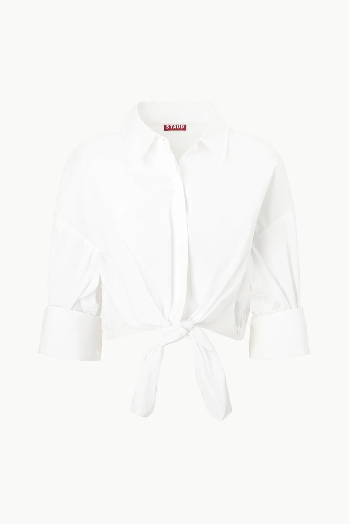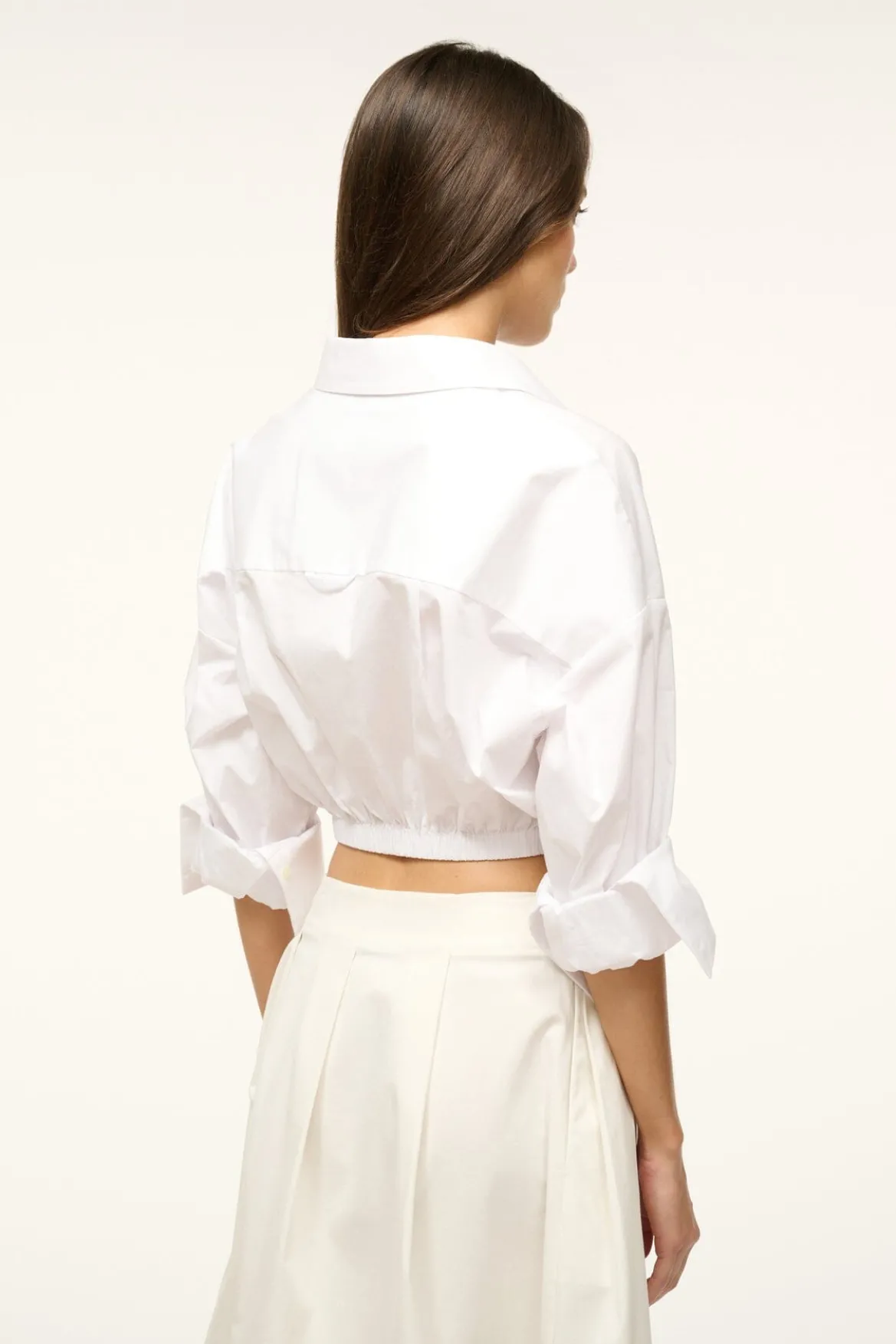 The Lisa Top is a cropped button down shirt with a center front tie and elasticated waistband. This styles features fixed 3/4 length sleeves for ease.