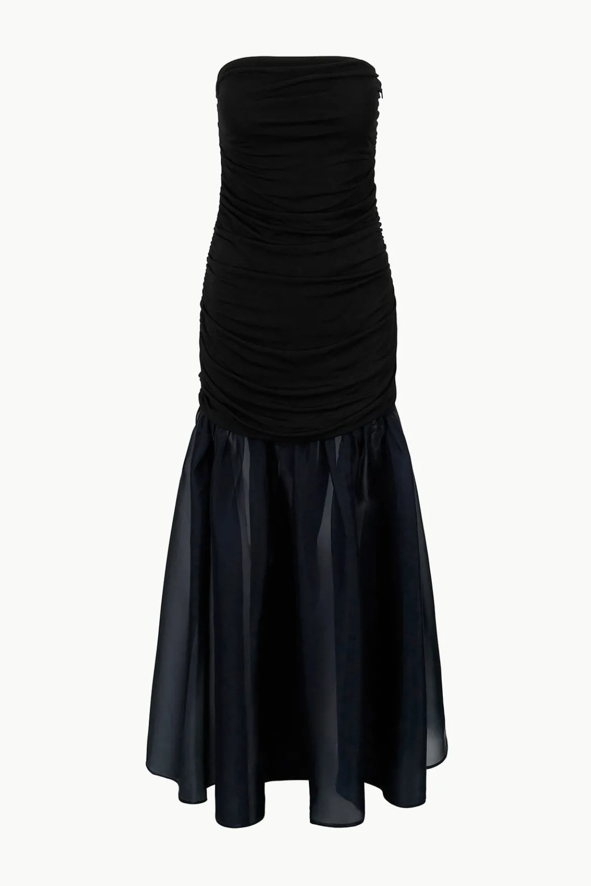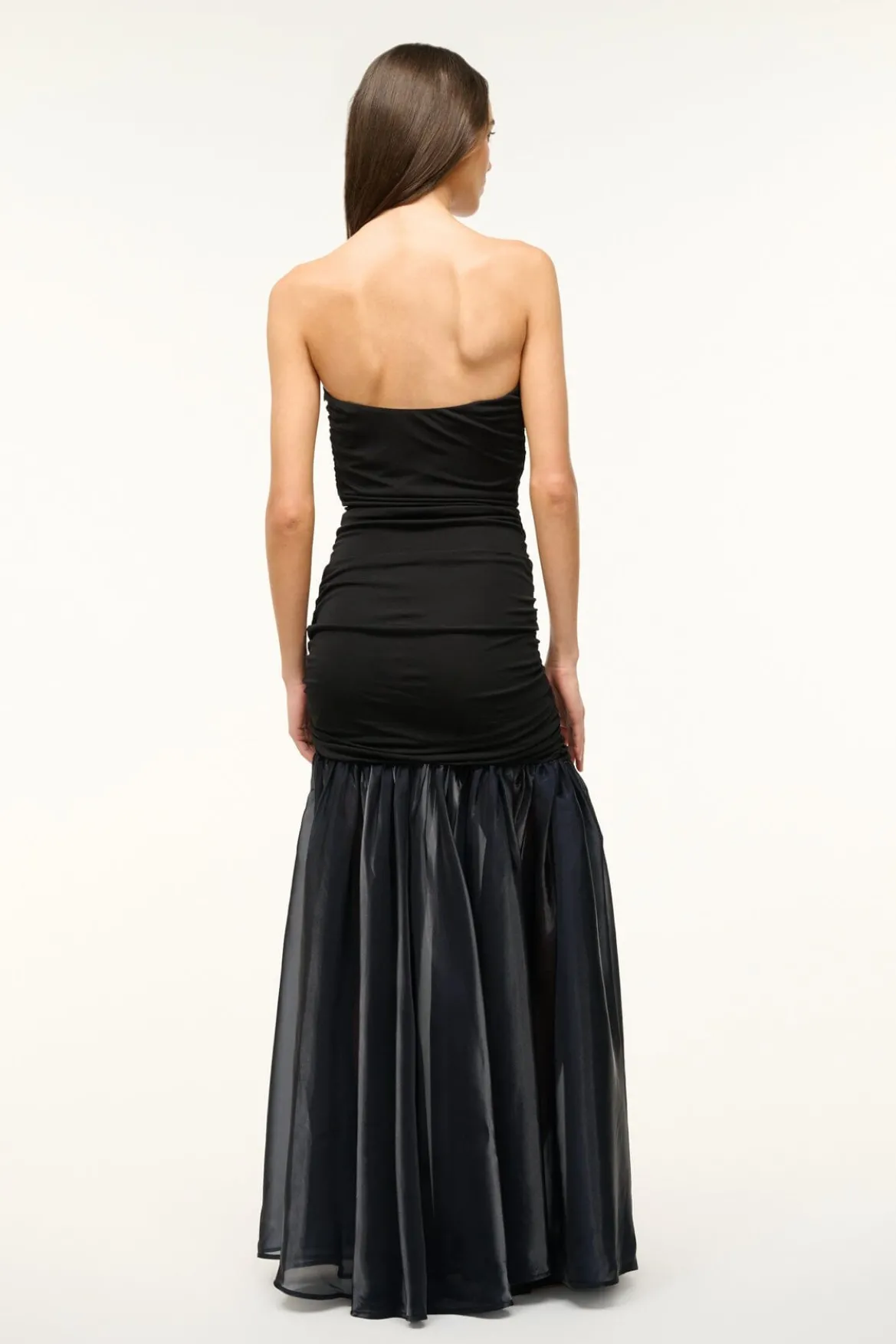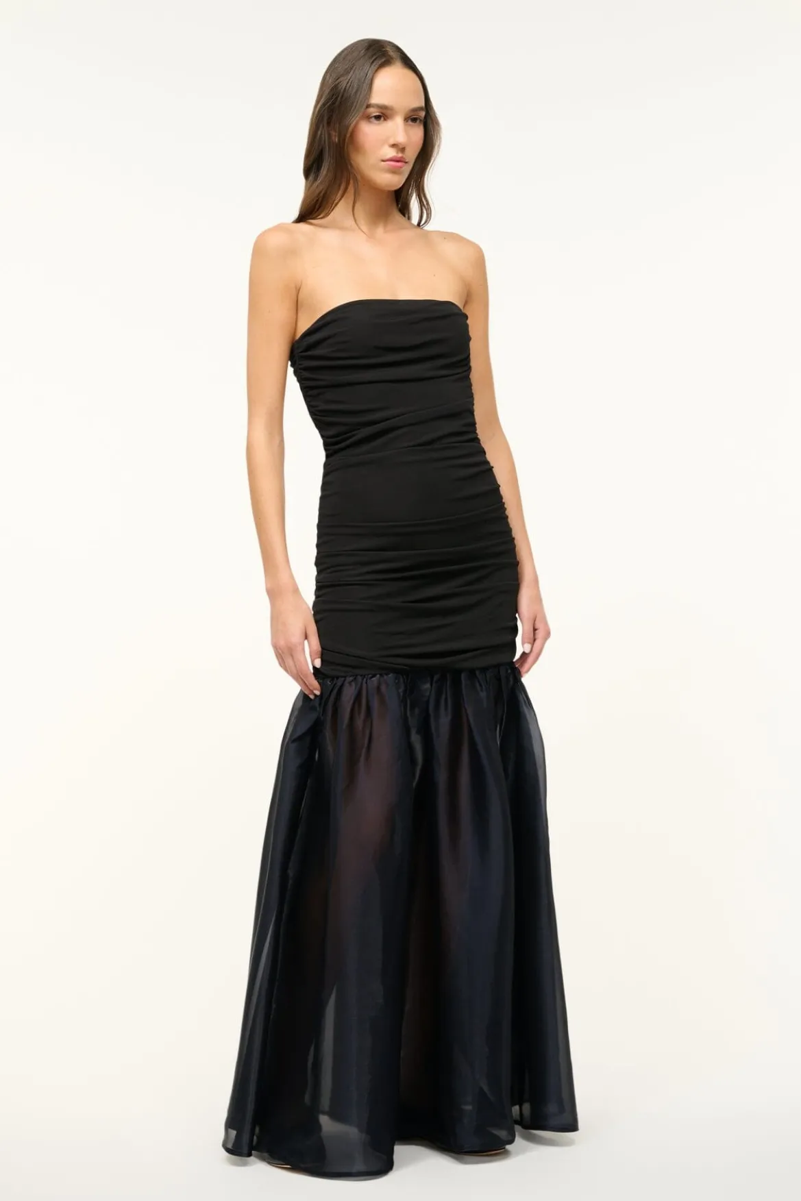 The Liya Dress is a strapless fitted dress, crafted in a gathered jersey throughout the bodice and features a sheer irridescent organza full skirt.