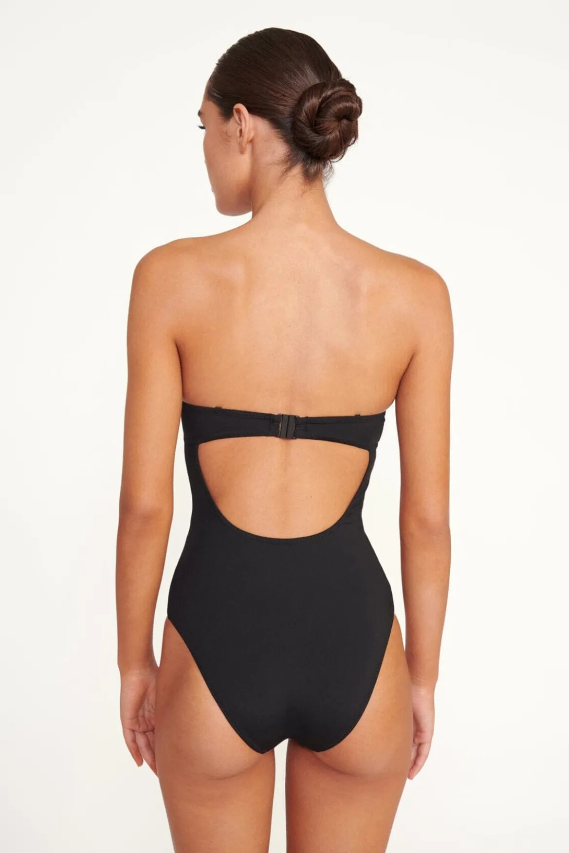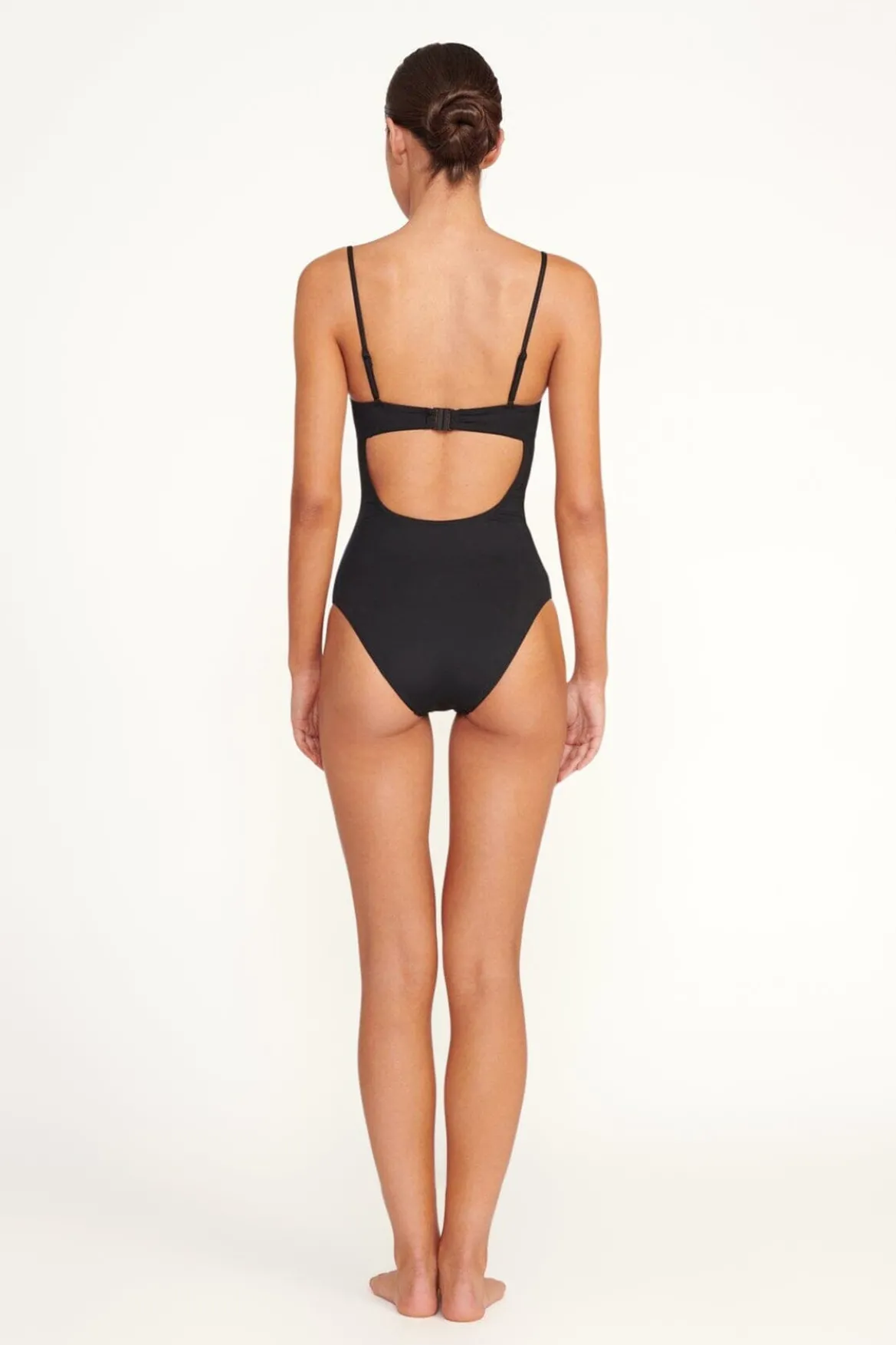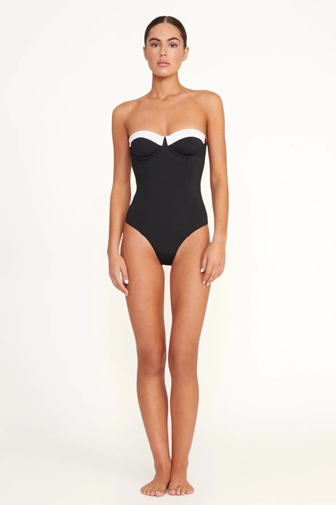 The Maeve One Piece features a bustier inspired bodice with a contrast trim at the bust. This style has removable spaghetti straps and a low back.