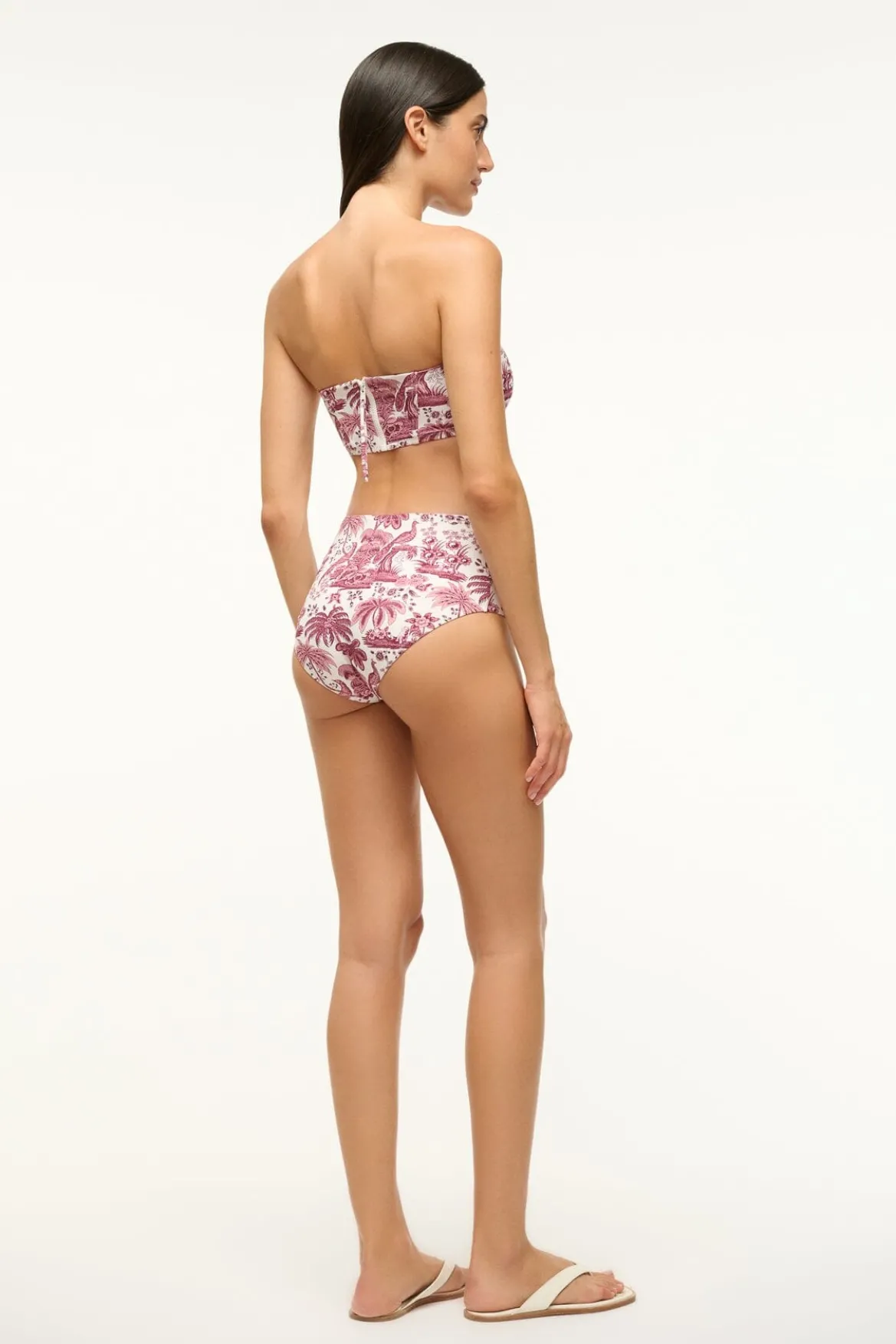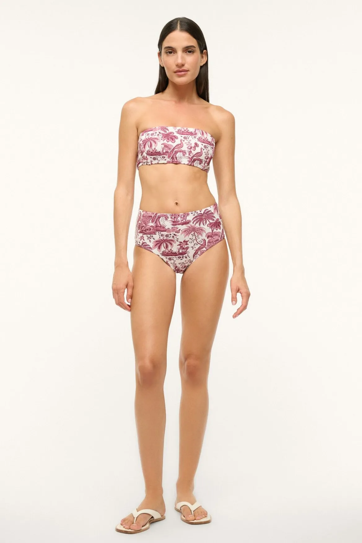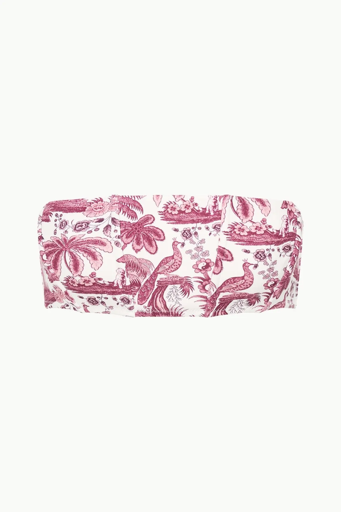 The Mala Bikini Top is a strapless bandeau bikini top with a back zip closure. This style features boning throughout the chest for a structured, corset-inspired look.
