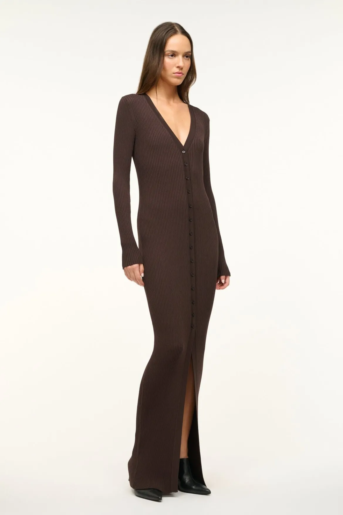 An ankle-length version of our signature rib knit dress, the Maxi Shoko is a stretchy button down style that can be worn open as a layering piece or closed on its own.