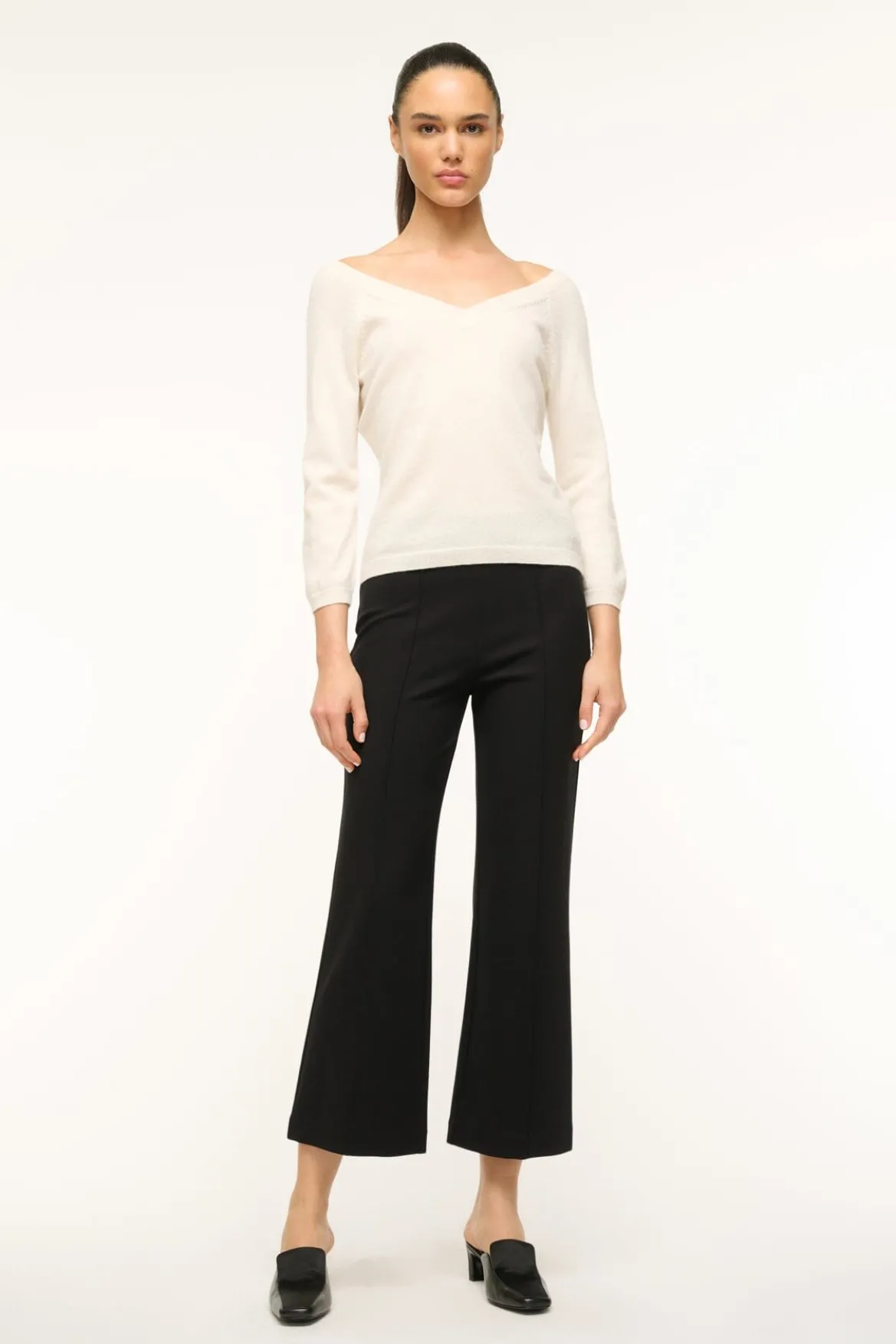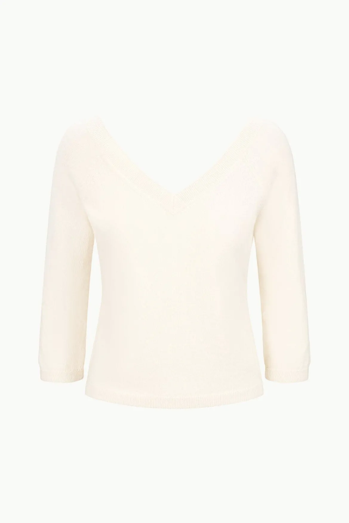 This is a fitted cashmere sweater with a wide v-neckline and 3/4 length sleeves.