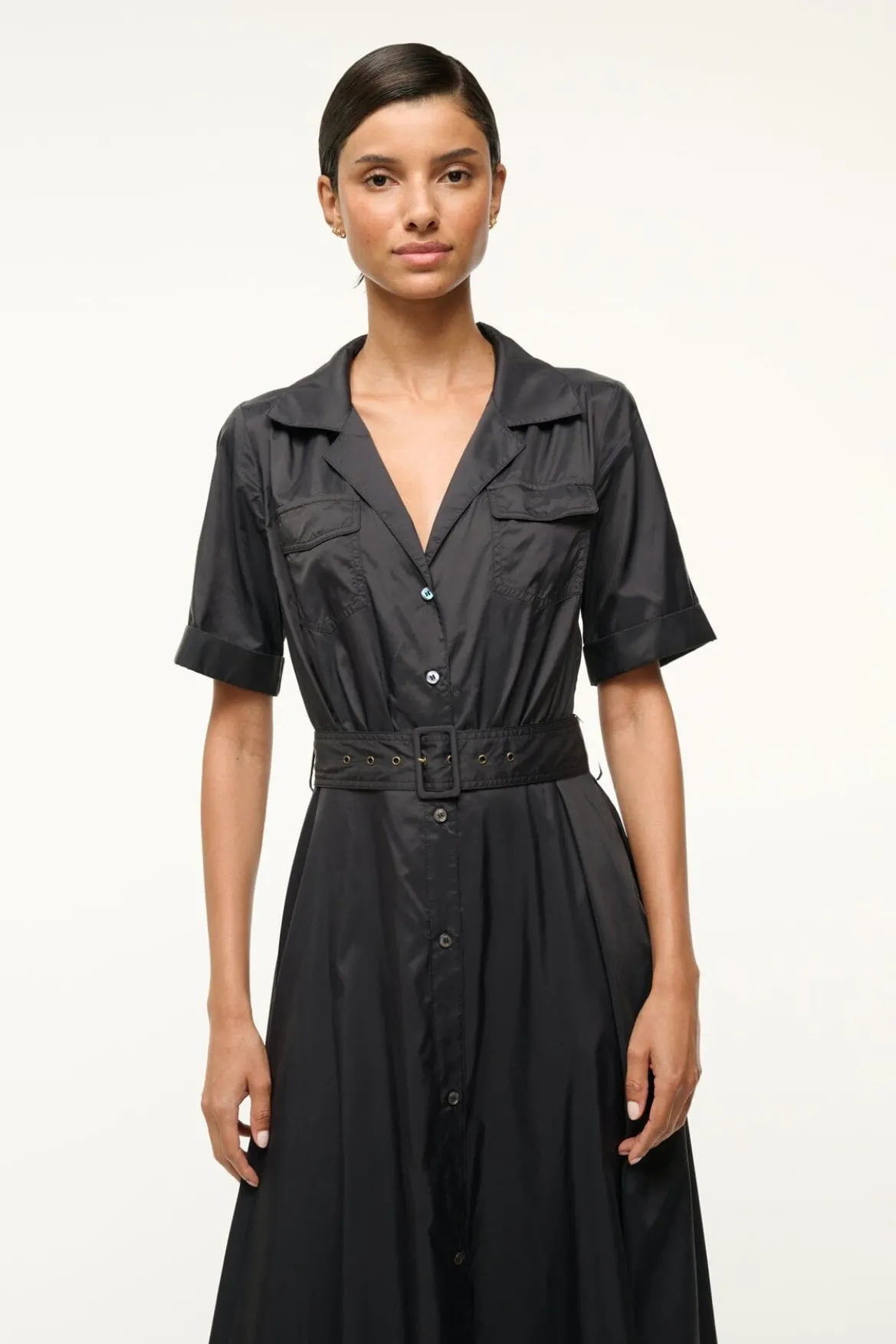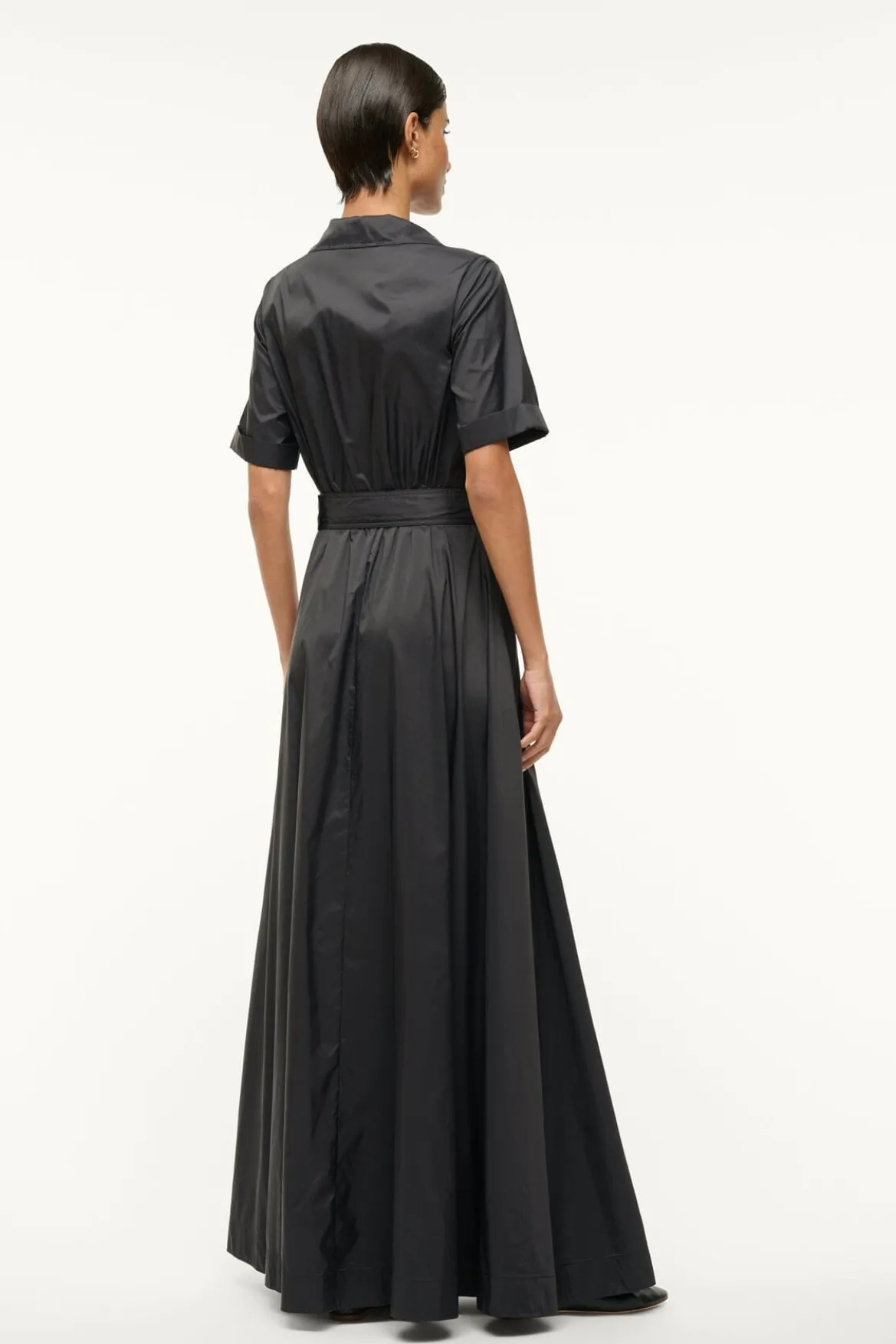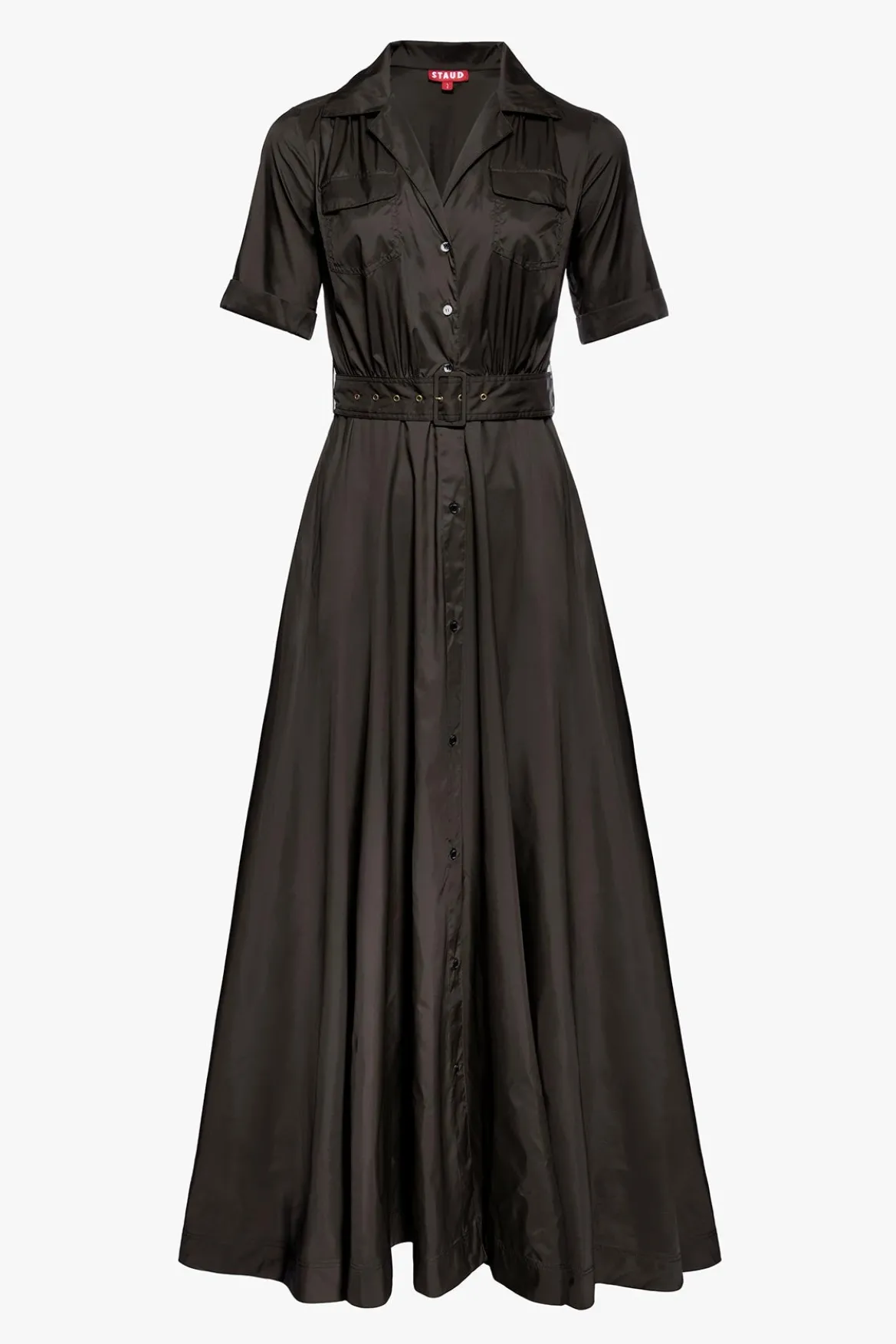 The Millie is a full length dress made out of our sustainable recycled tissue nylon. This dress features two front pockets, a button down front and matching belt.
