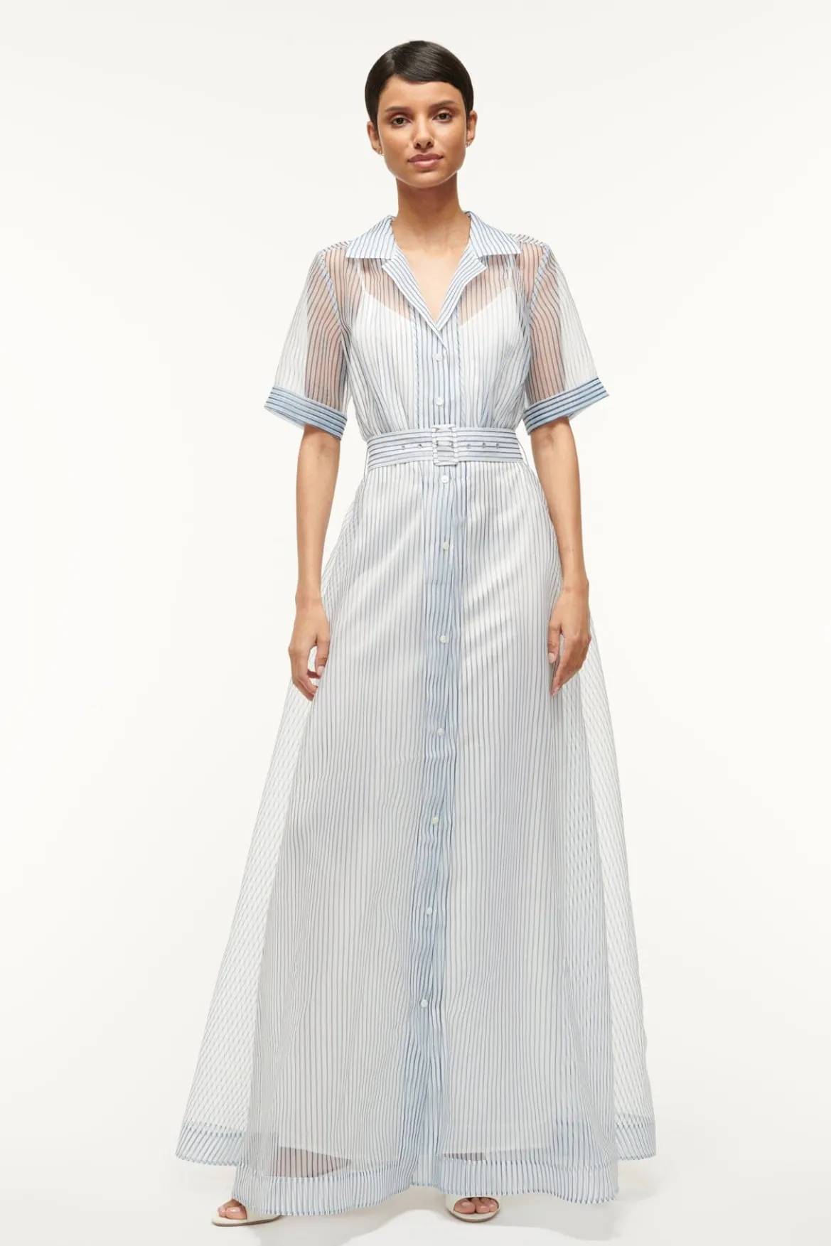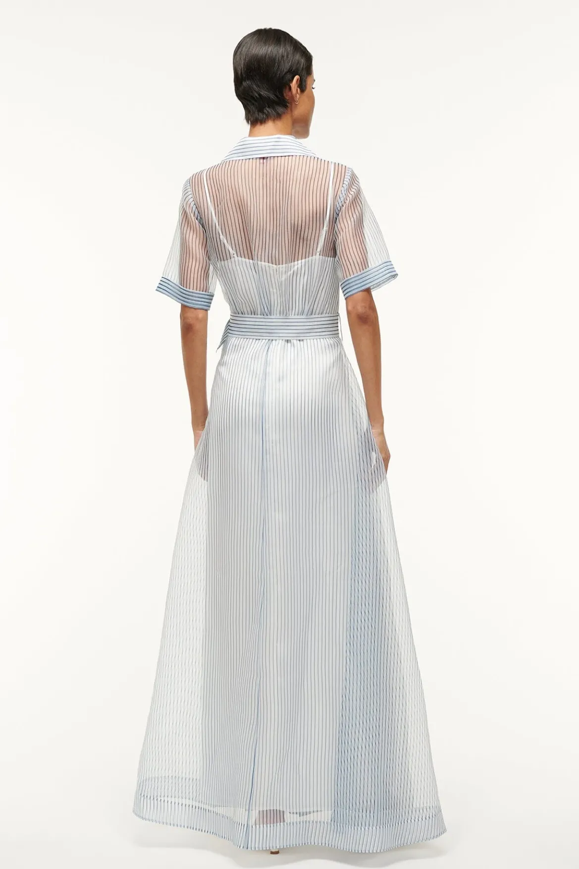 A full length, short sleeve dress with buttons down the front, this seasonal update to our classic wear-everywhere dress is made out of a striped organza and comes with a slip.