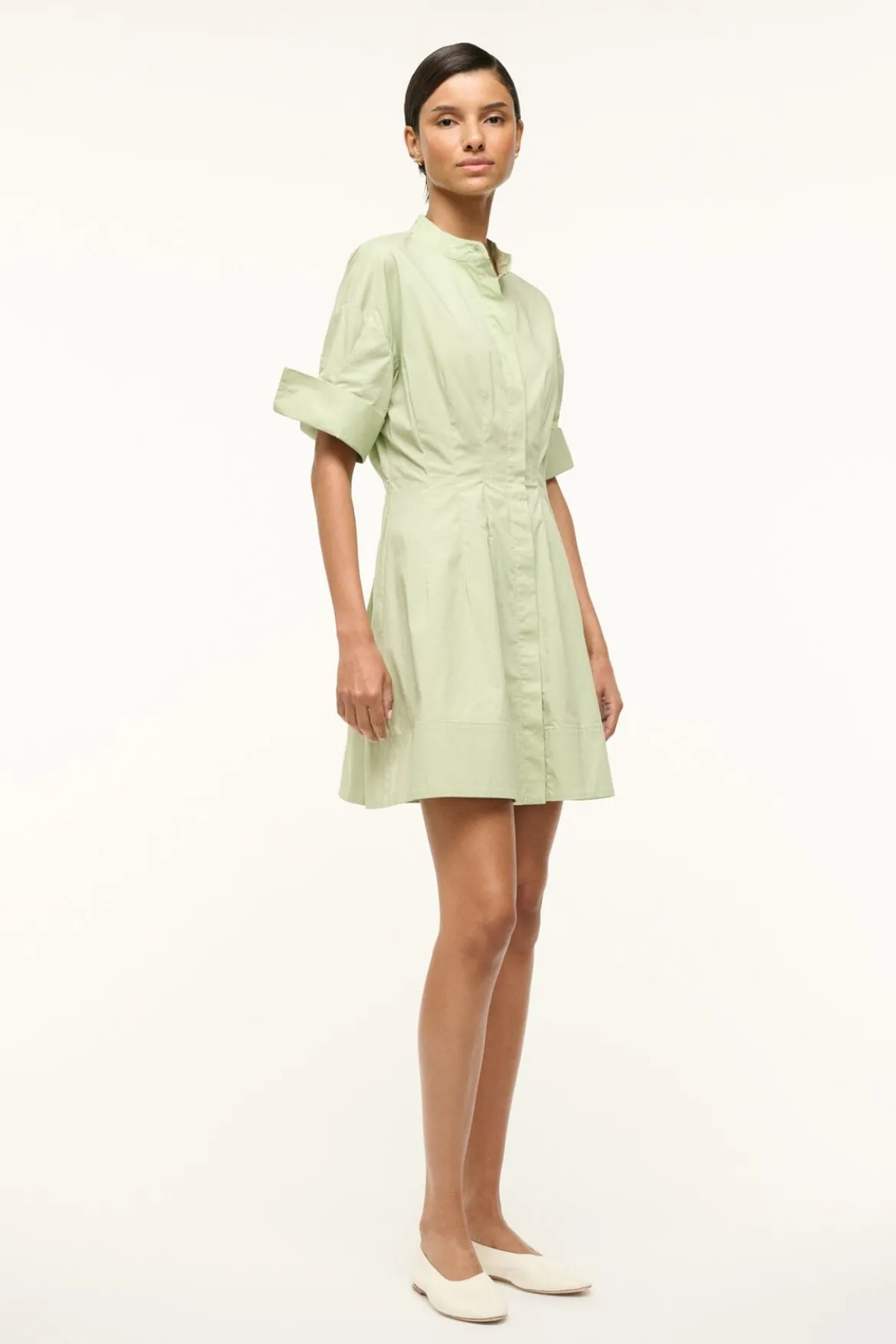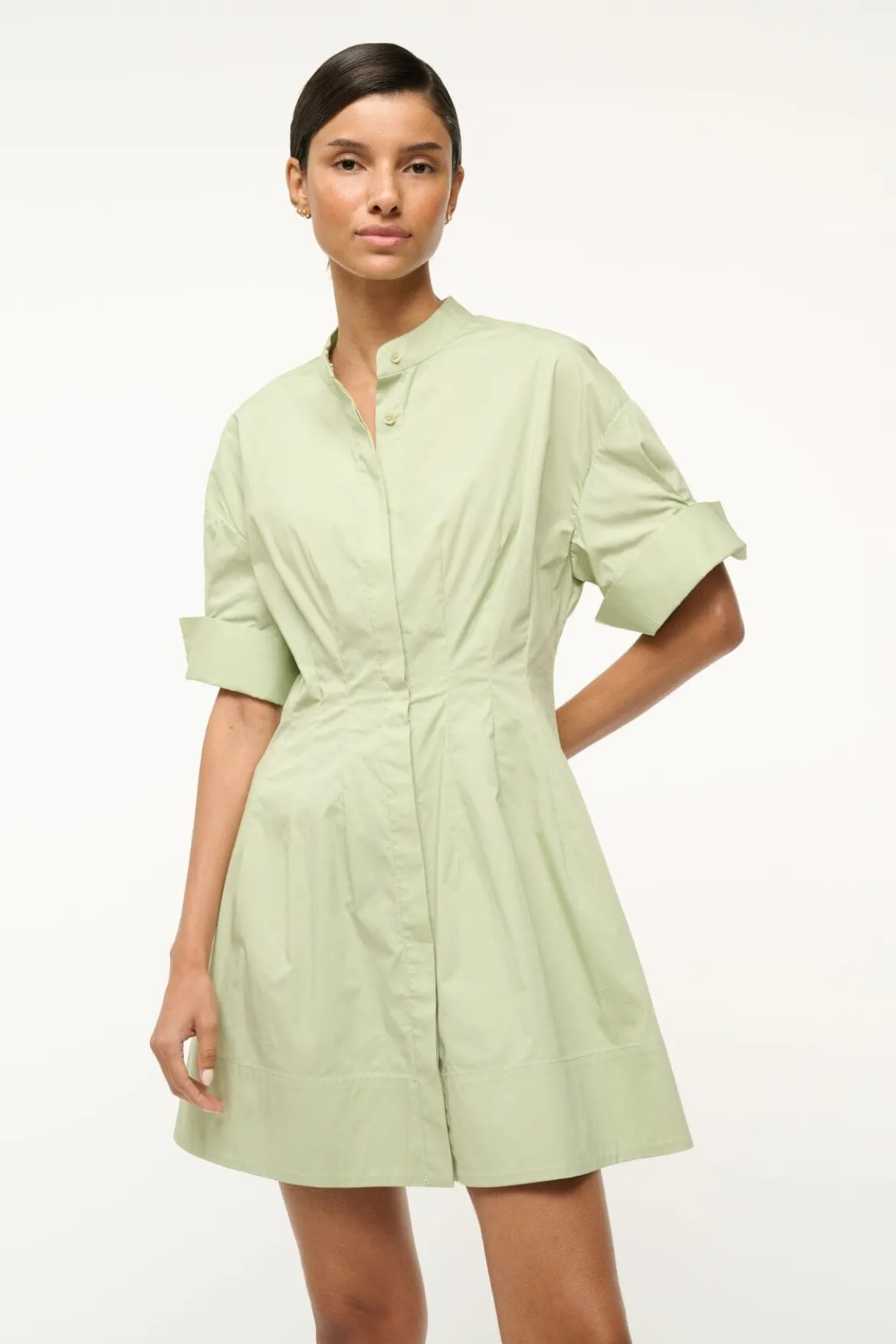 The Mini Lorenza is a button-up dress with an A-line mini skirt and fixed half-length sleeves. It features a fitted waist with an elastic detail at the back for comfort.