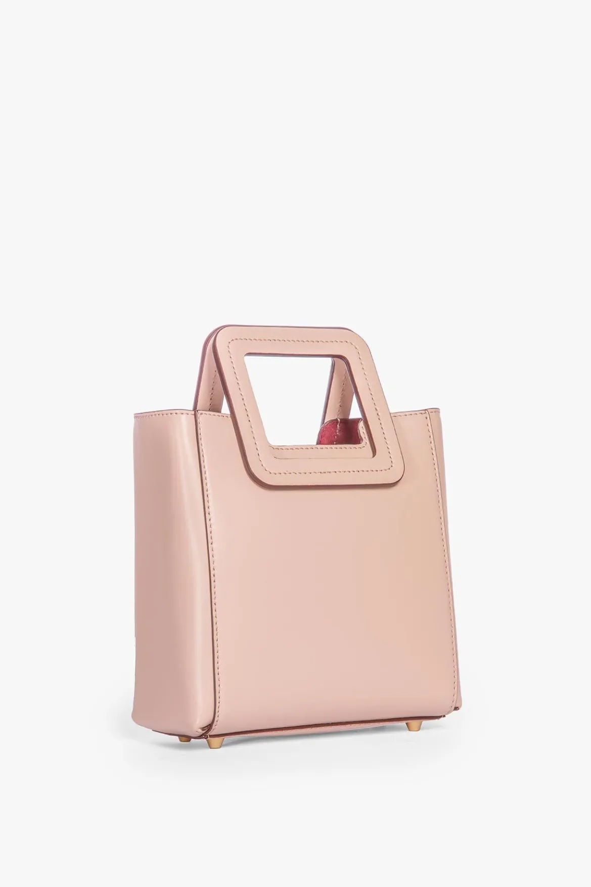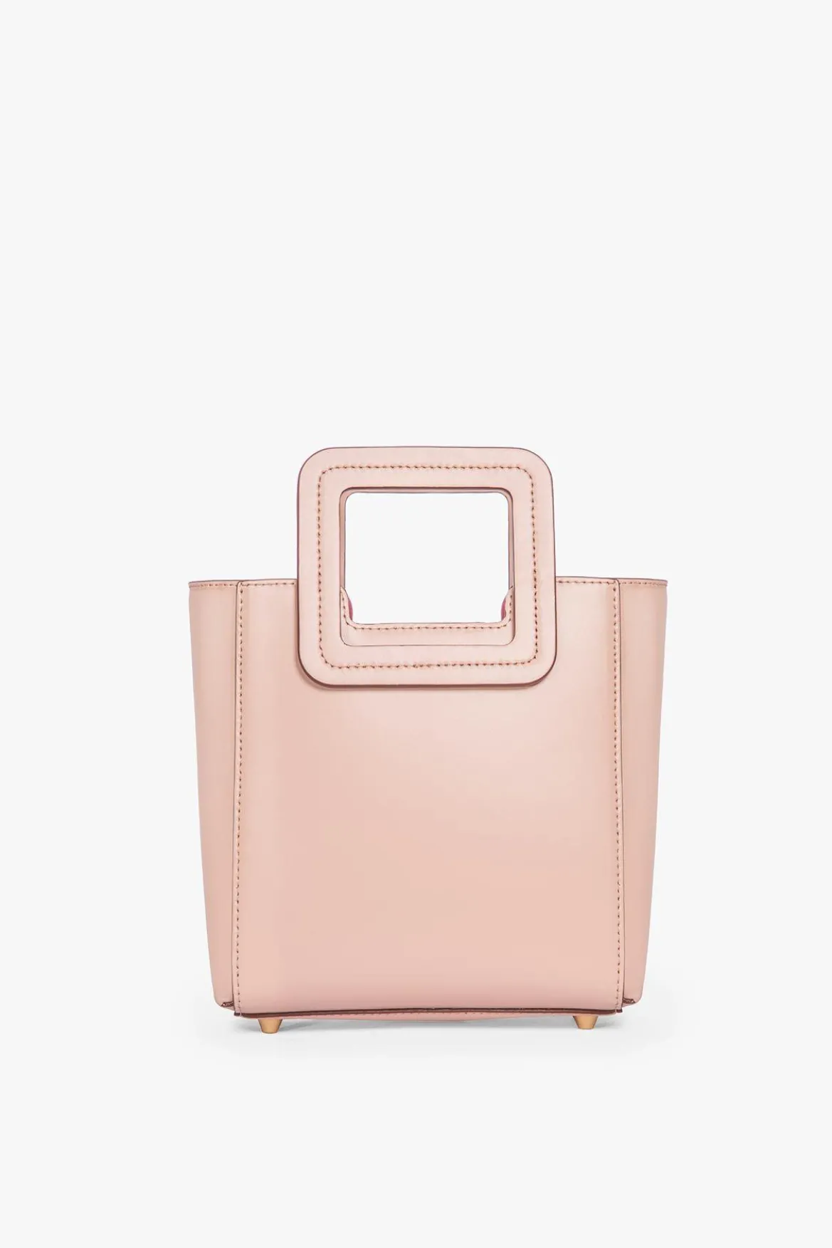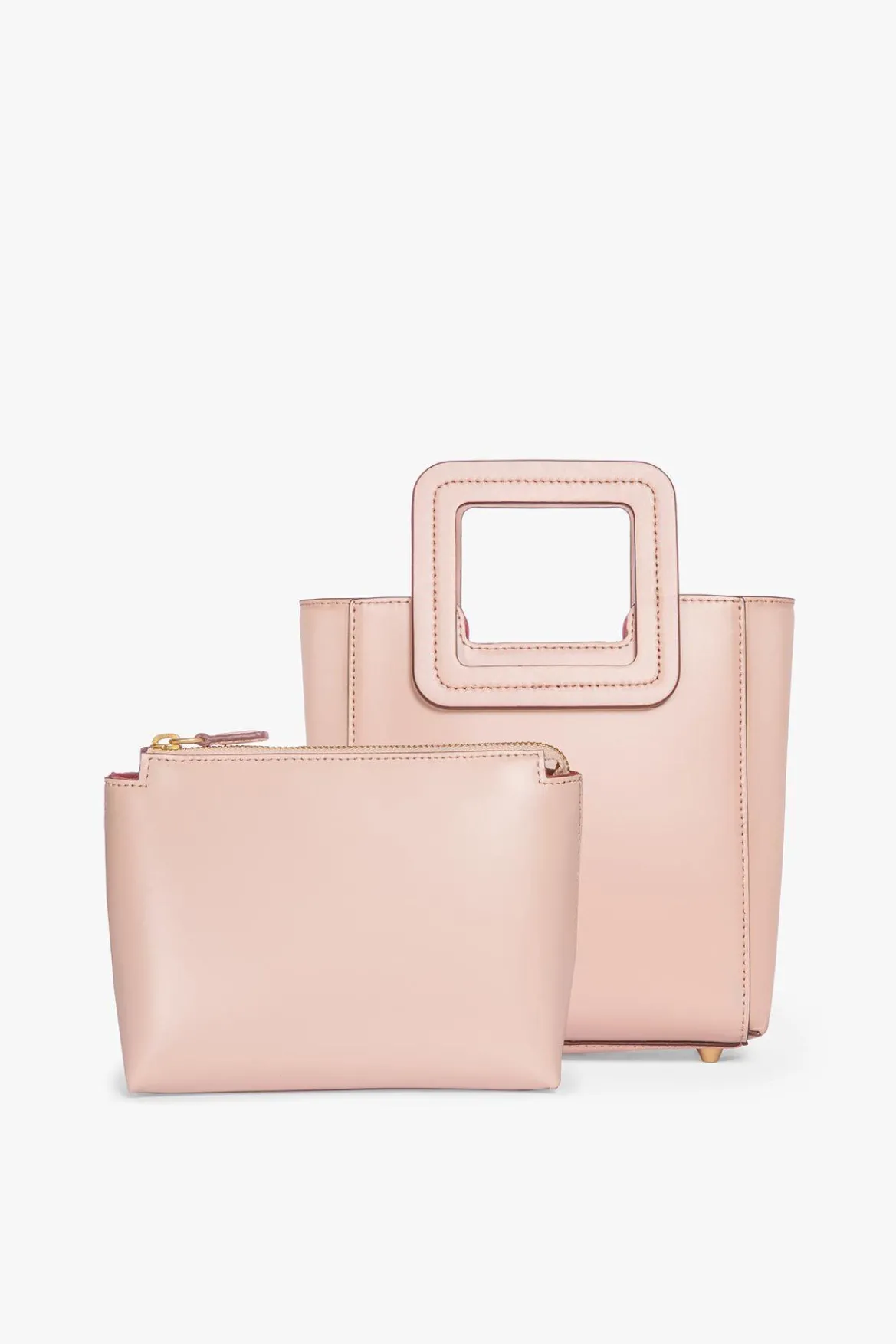 The Mini Shirley Bag in leather is a small tote that can be carried by the top handle or with the adjustable removable crossbody strap. This style features a removable inner zip pouch.