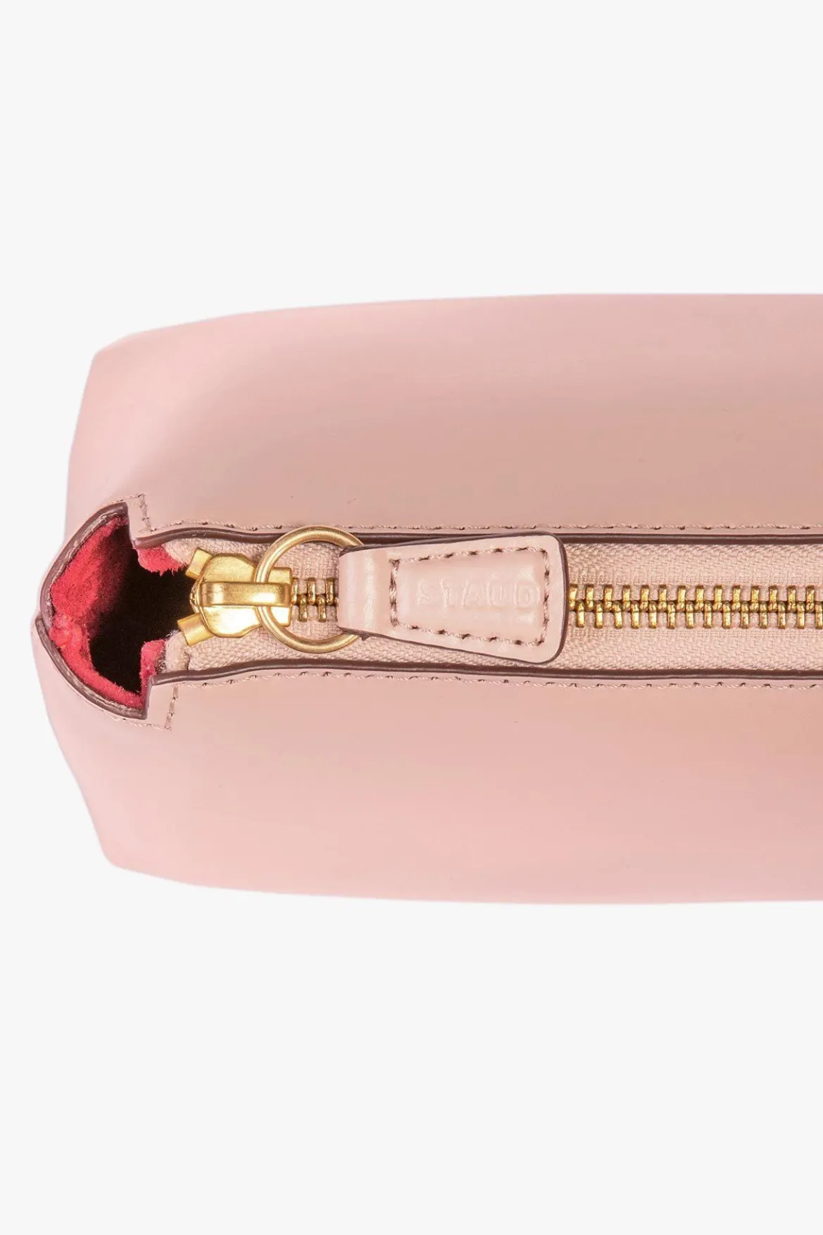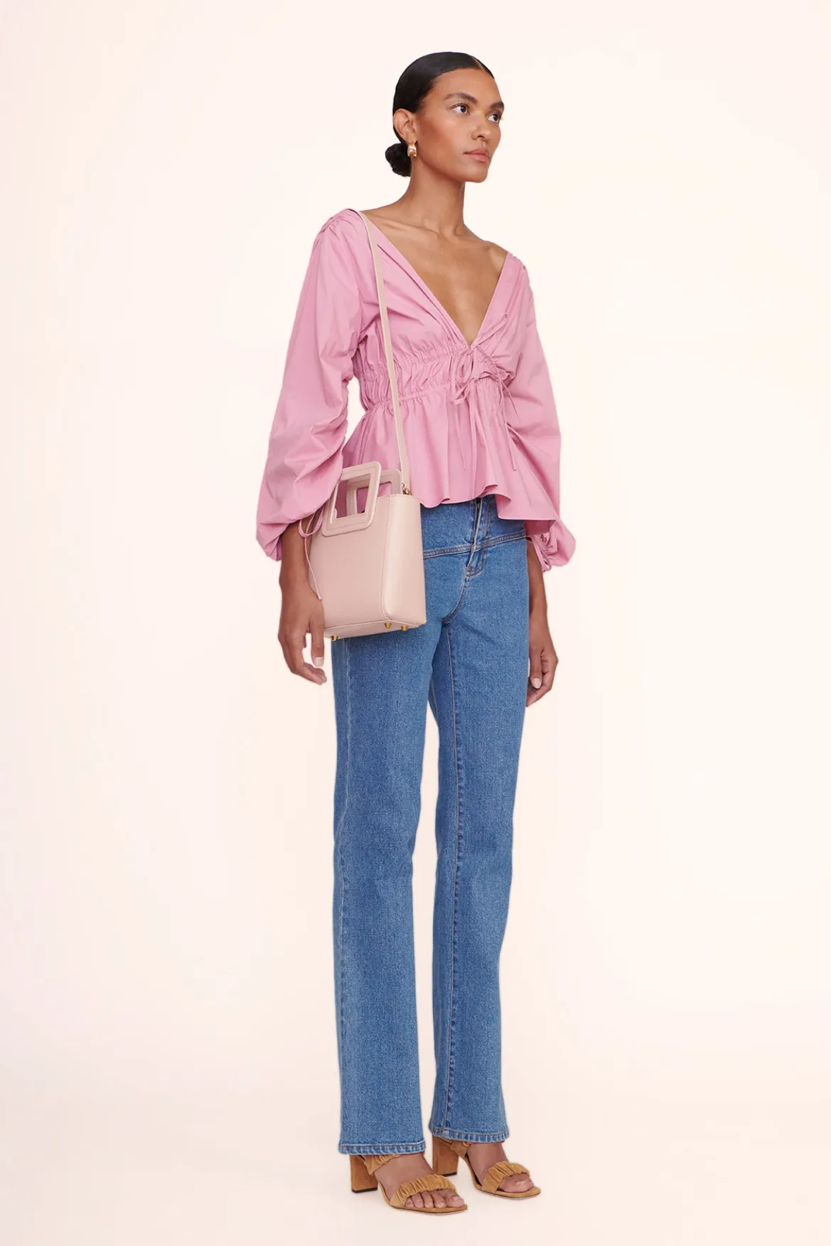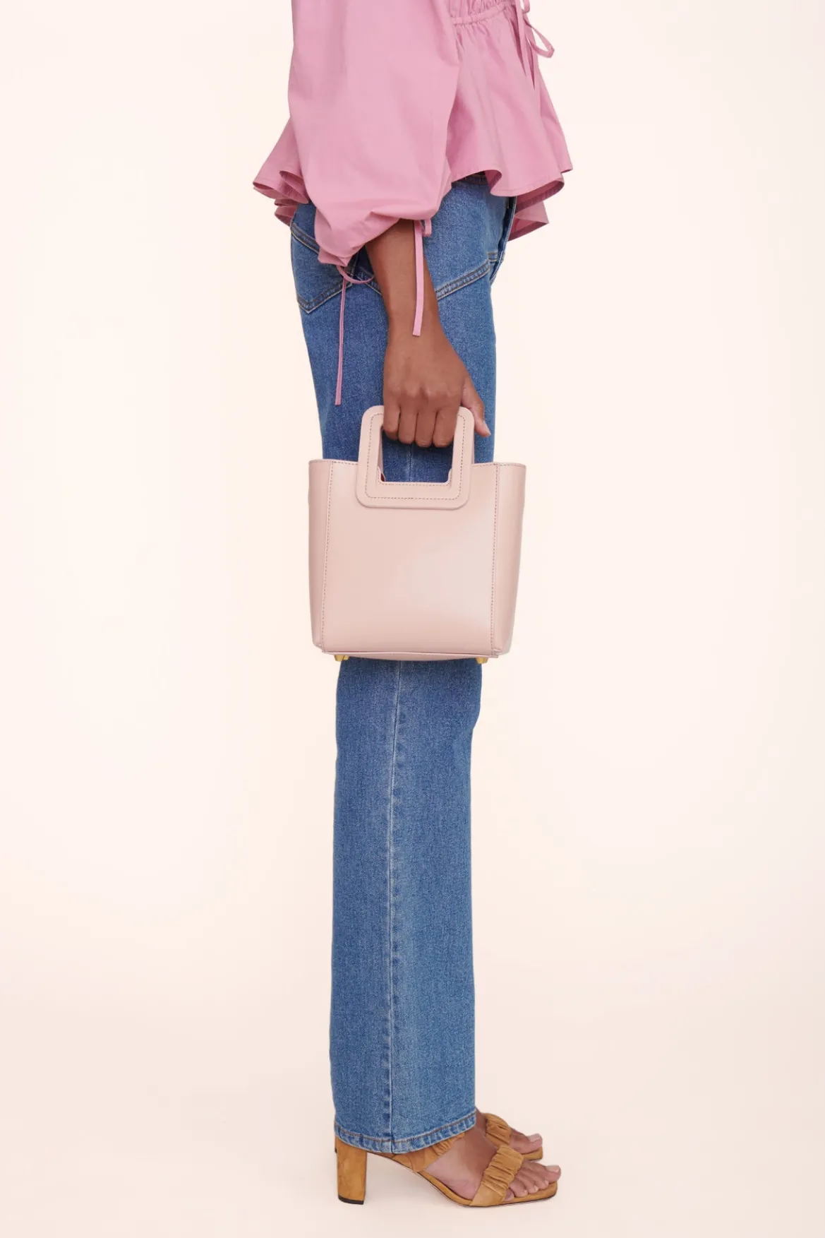 The Mini Shirley Bag in leather is a small tote that can be carried by the top handle or with the adjustable removable crossbody strap. This style features a removable inner zip pouch.
