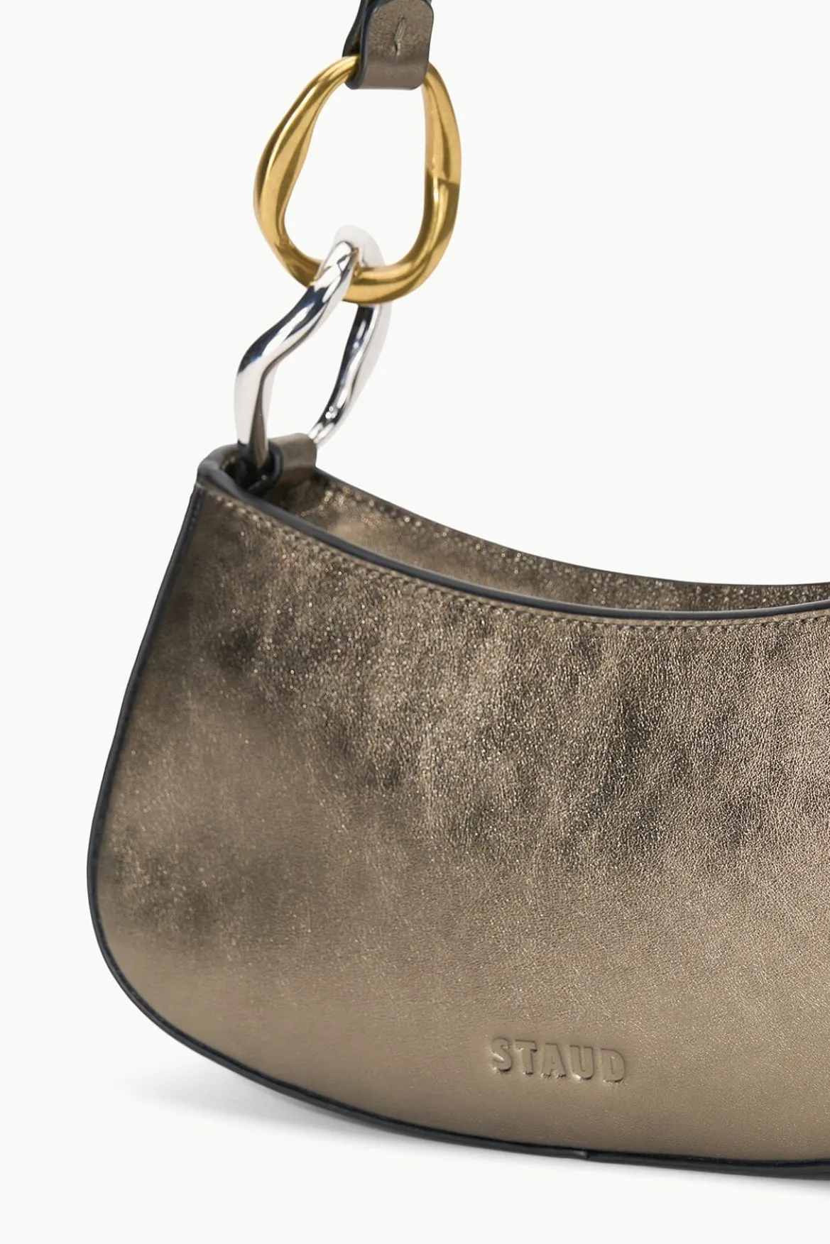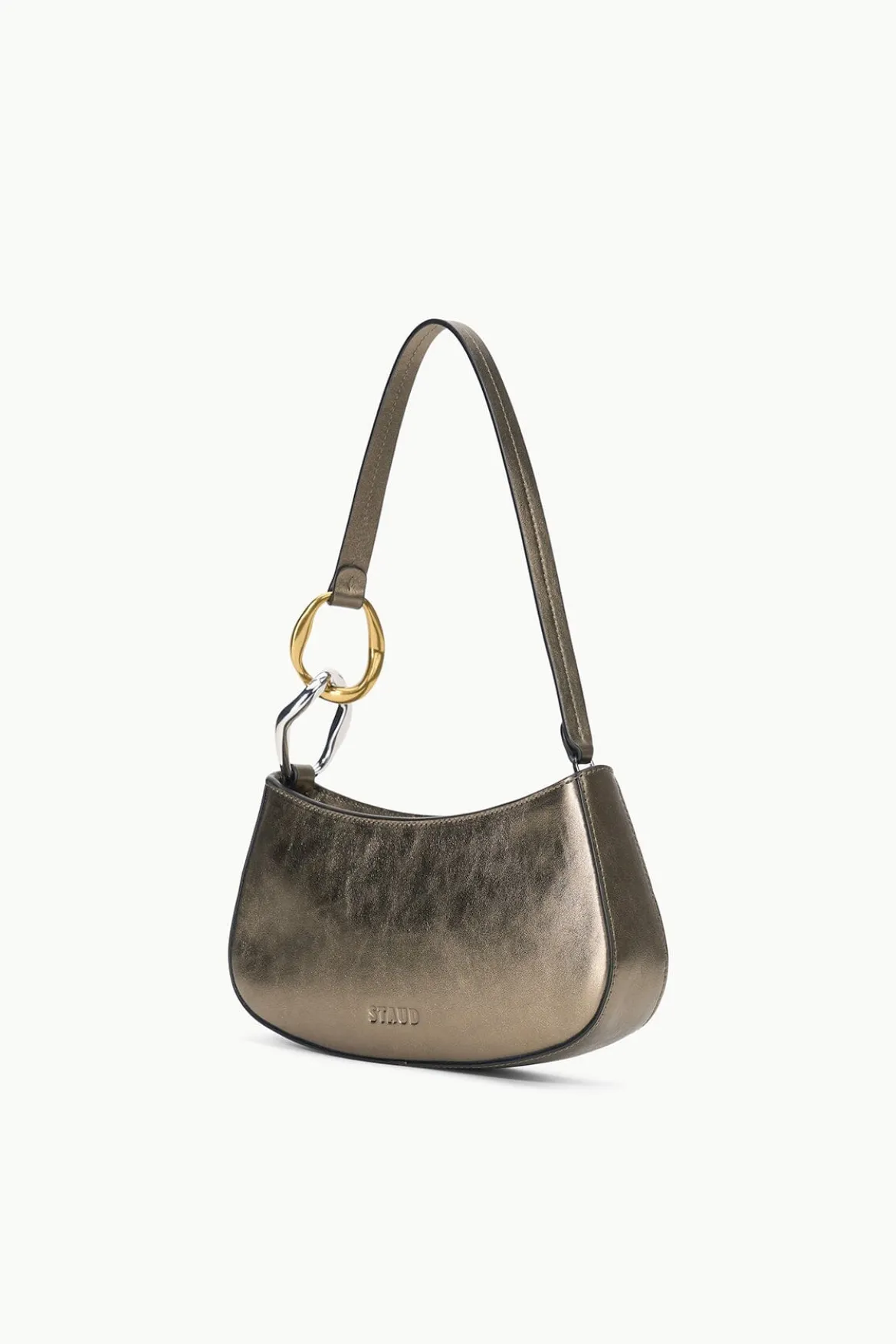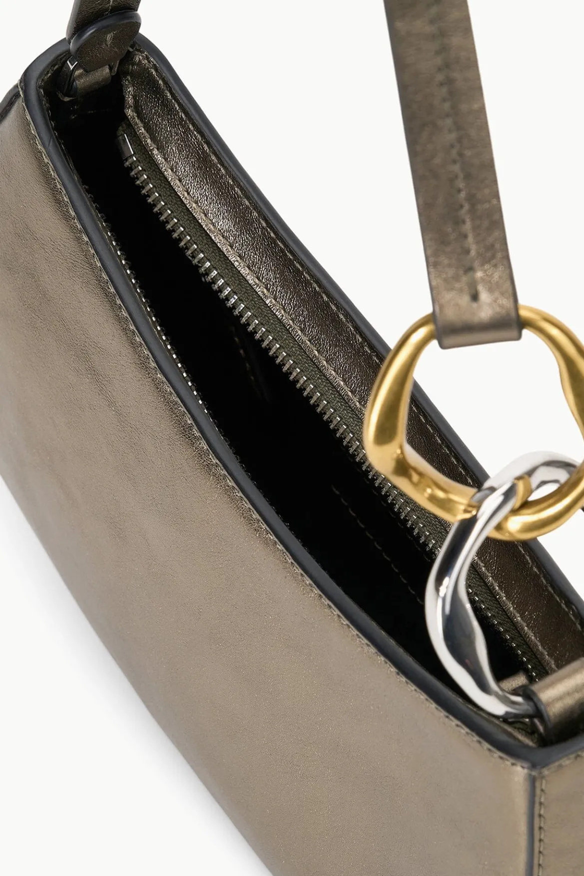 The Ollie Bag is a mini shoulder bag made out of polished leather. This style features a hardware design on the strap and a zip closure.