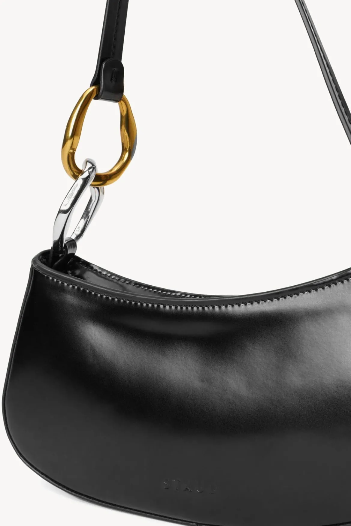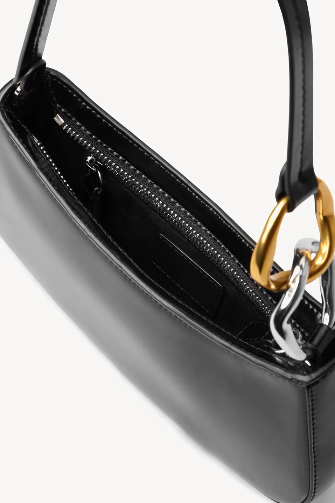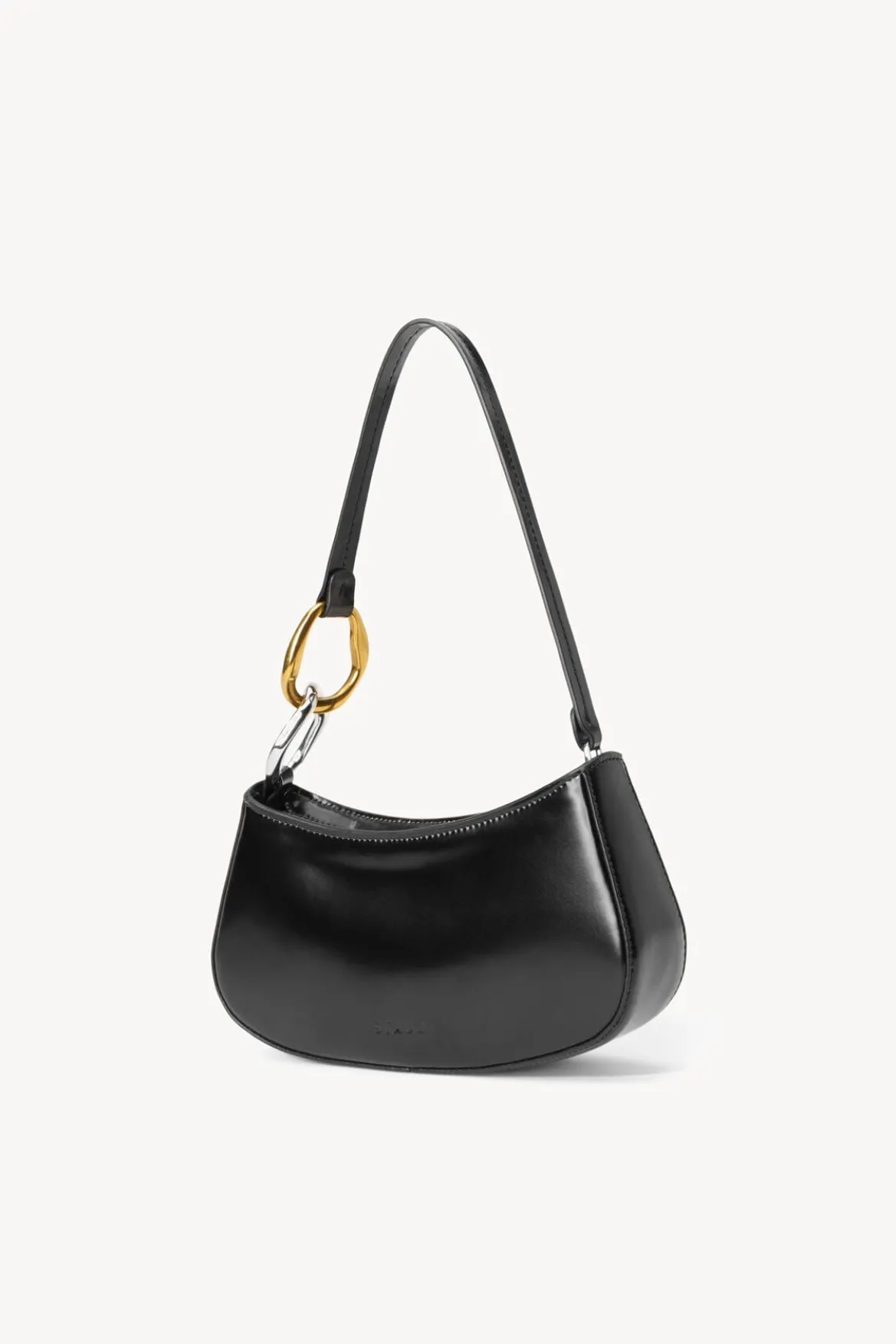 The Ollie Bag is a mini shoulder bag made out of polished leather. This style features a two-tone hardware design on the strap and a zip closure.