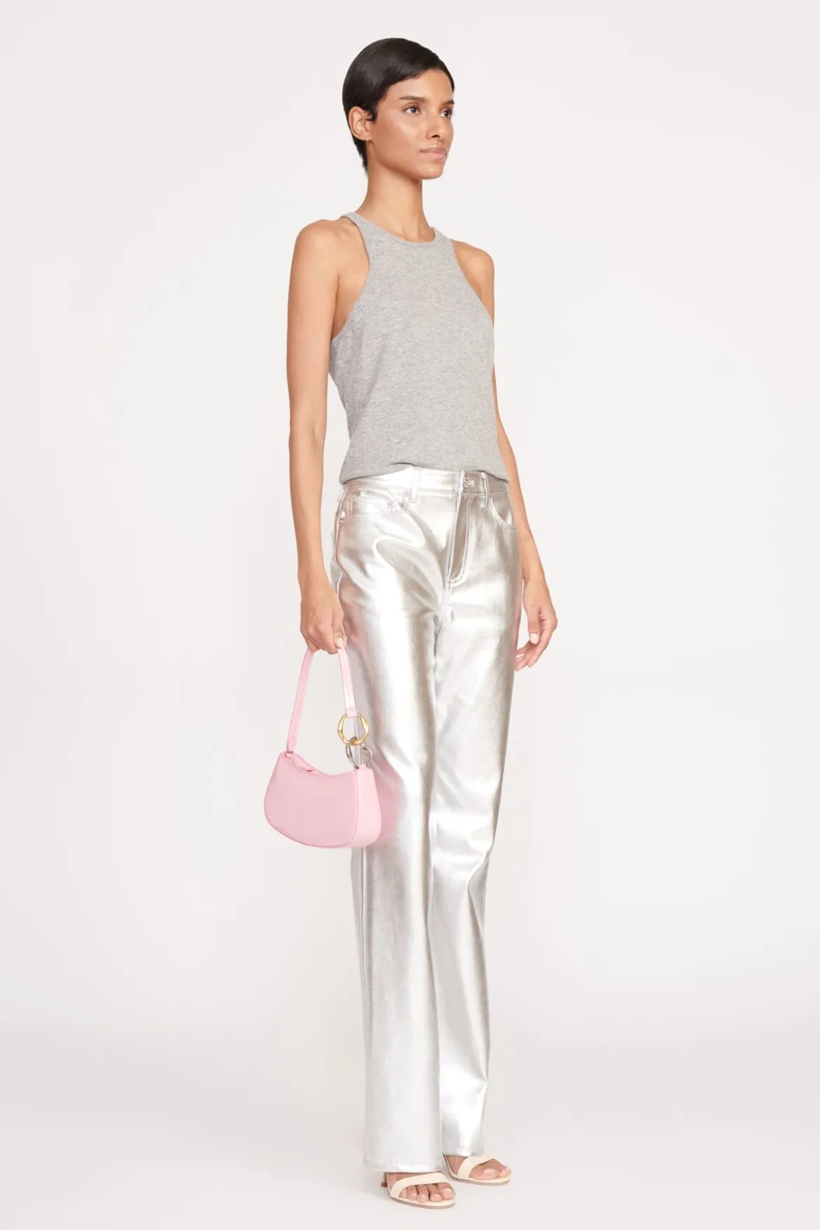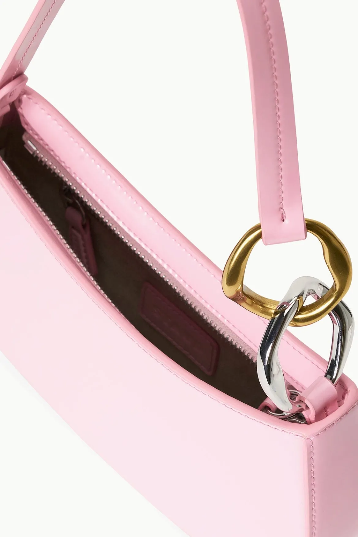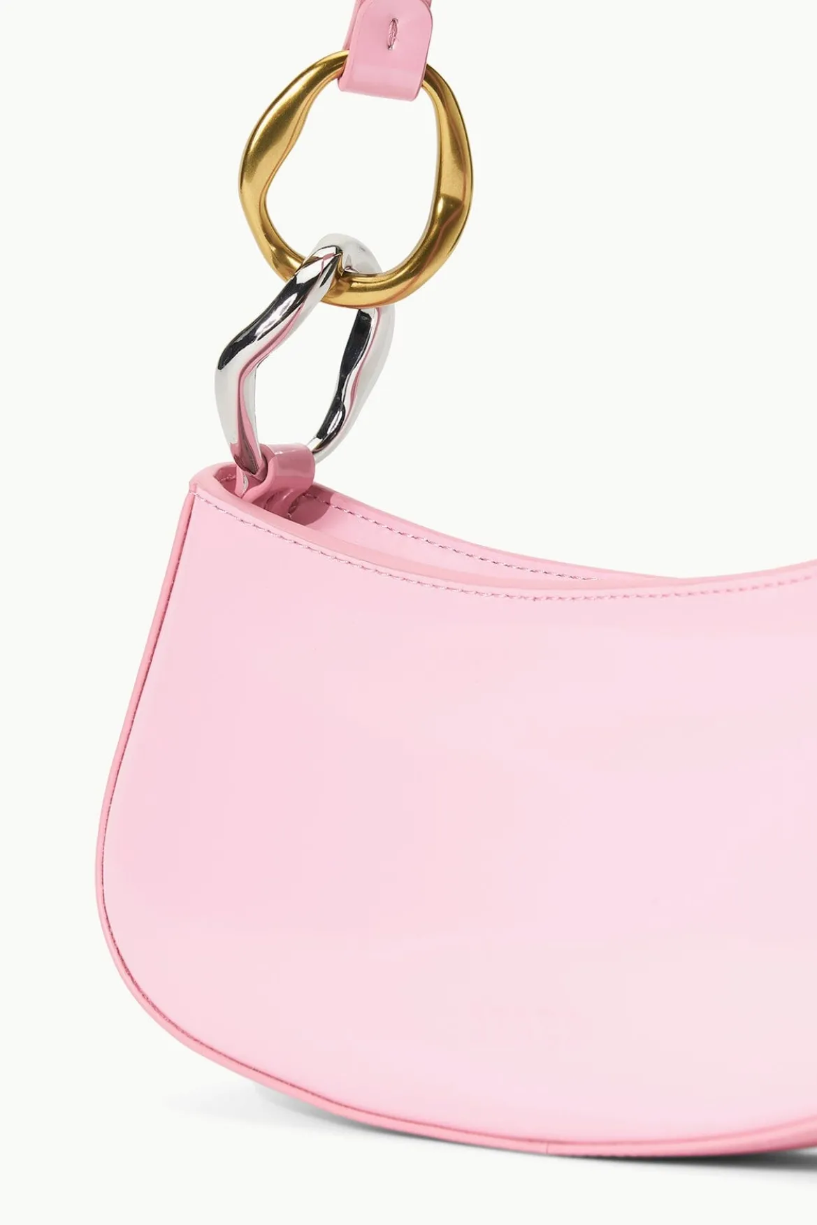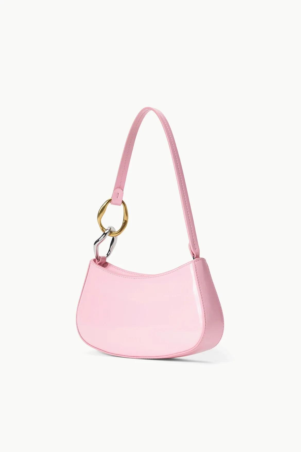The Ollie Bag is a mini shoulder bag made out of polished leather. This style features mixed metal hardware on the strap and a zip closure.