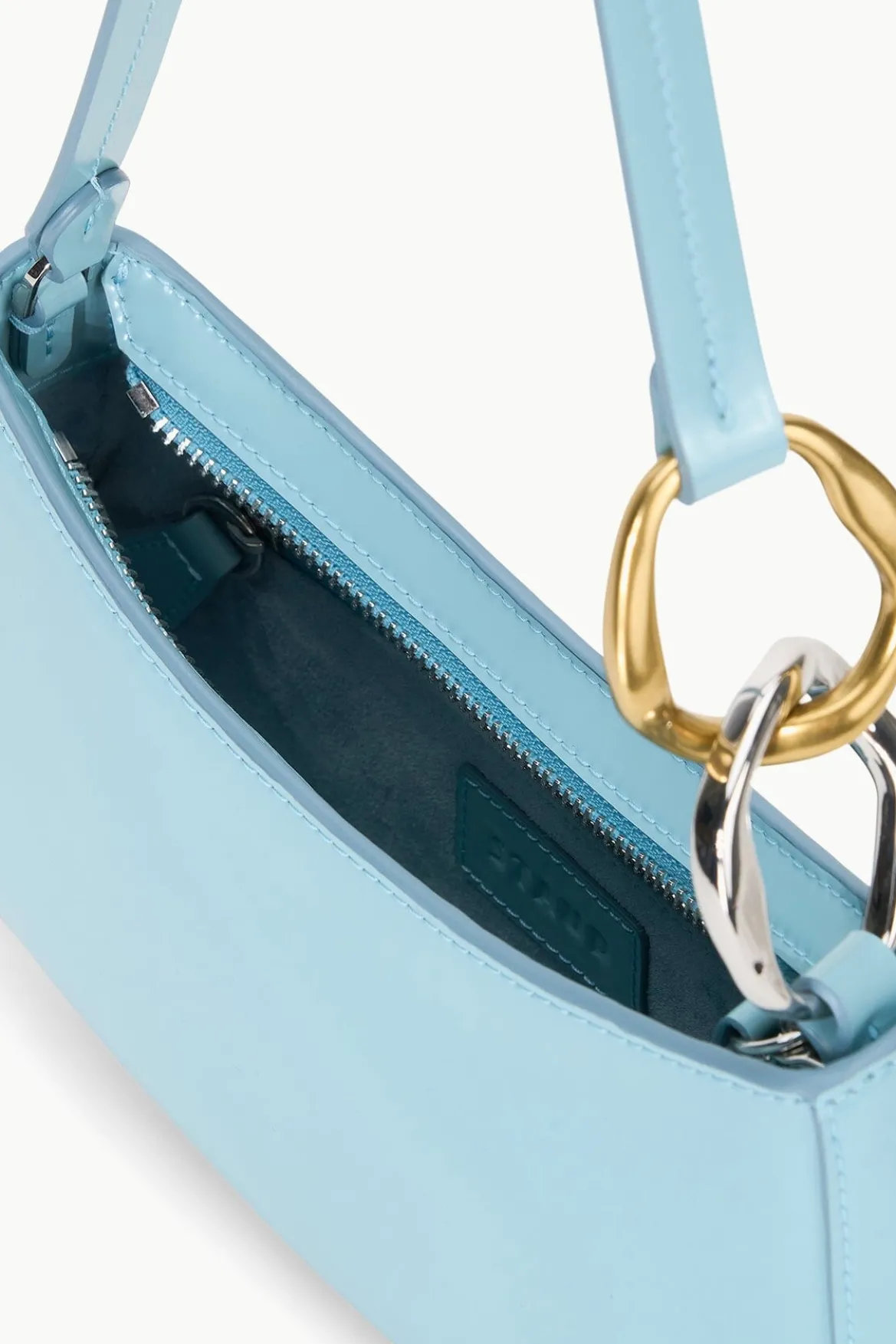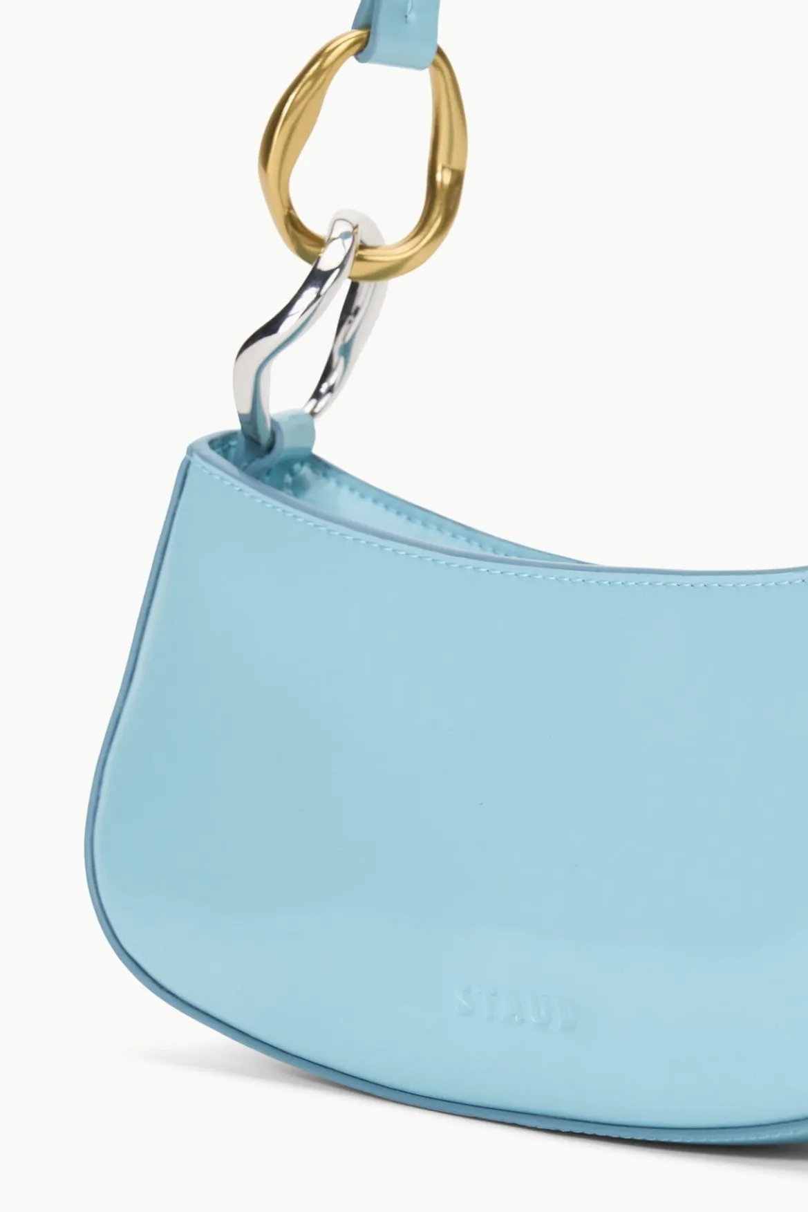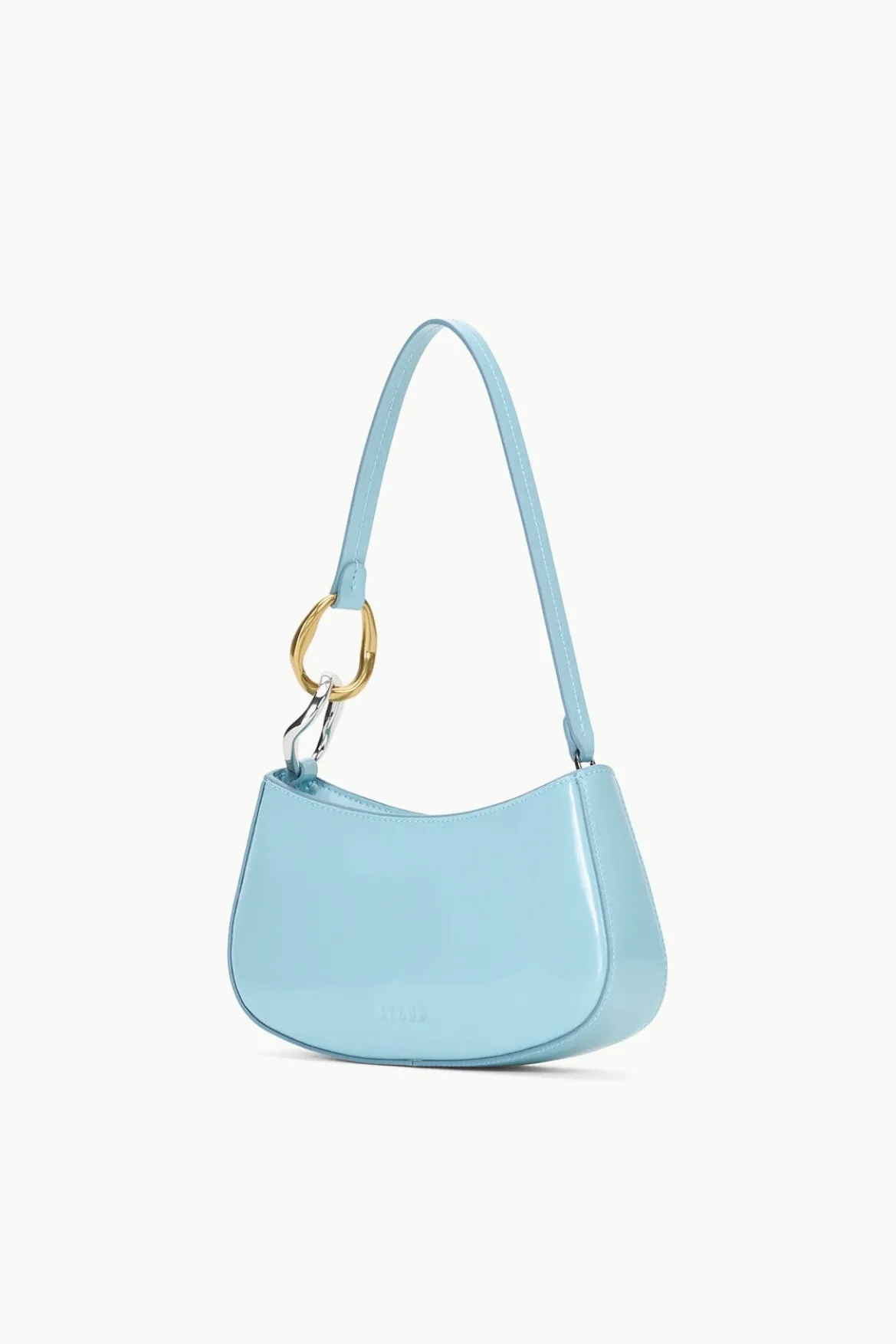 The Ollie Bag is a mini shoulder bag made out of polished leather. This style features mixed metal hardware on the strap and a zip closure.