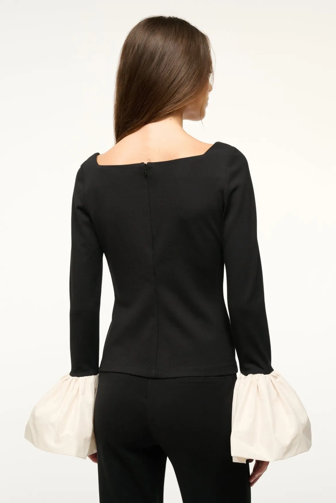 The Paige Top is a new take on our our Hawthorne Dress and is made from our comfortable ponte fabric, featuring voluminous organza cuffs for a playful occasion look.