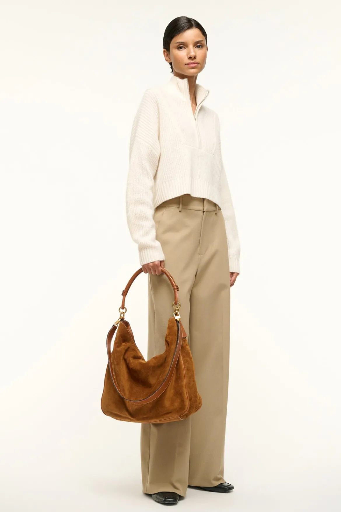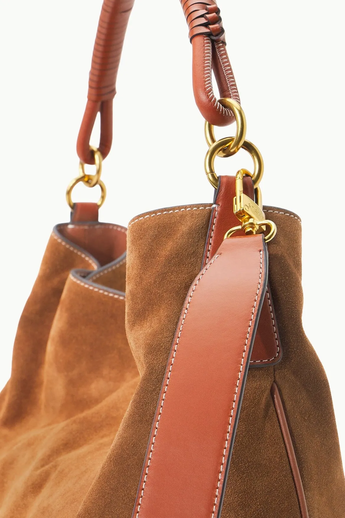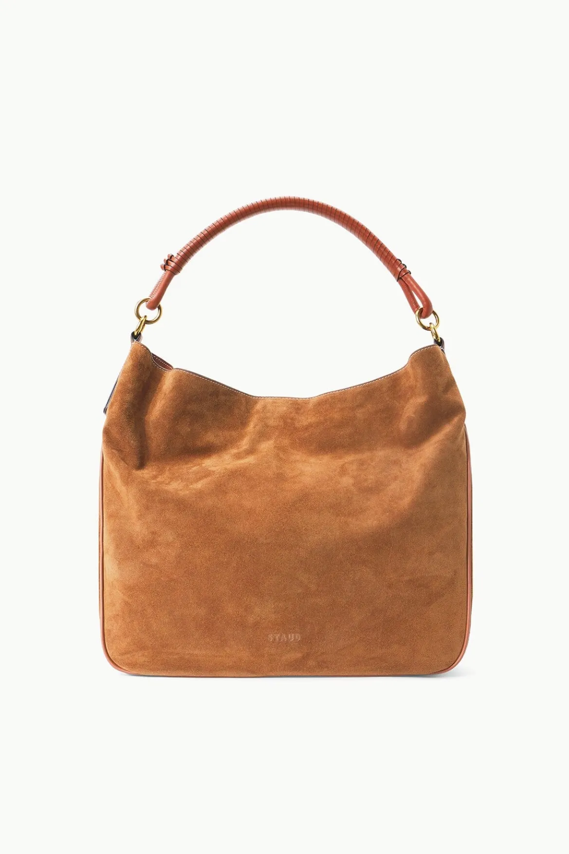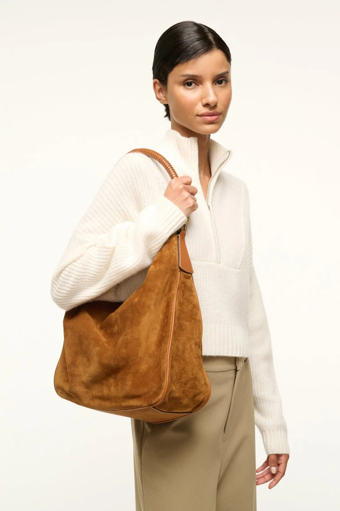 A slouchy suede hobo tote, the Perry Bag features a wrapped leather handle, metal hardware, a magnetic closure and suede lining.
