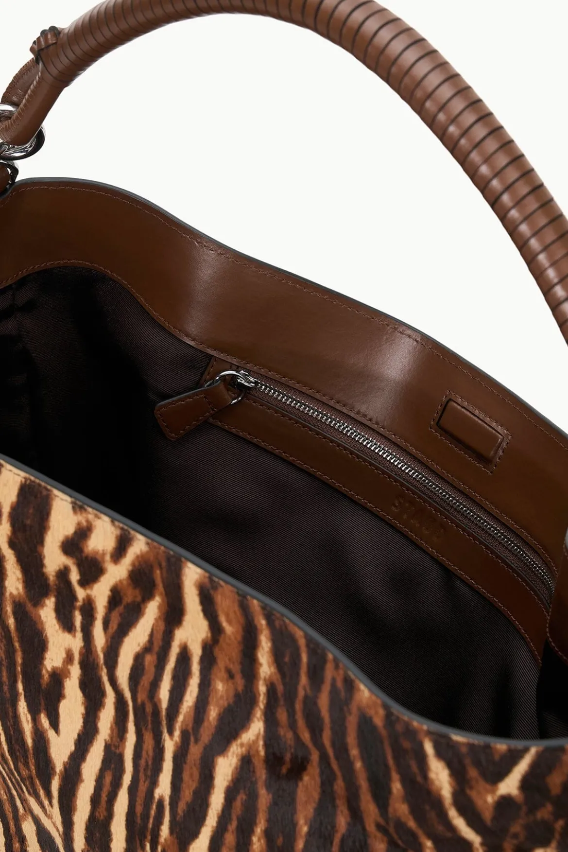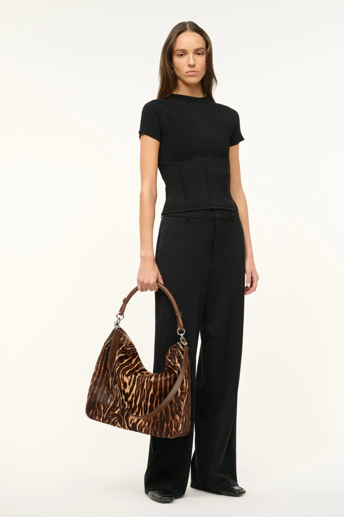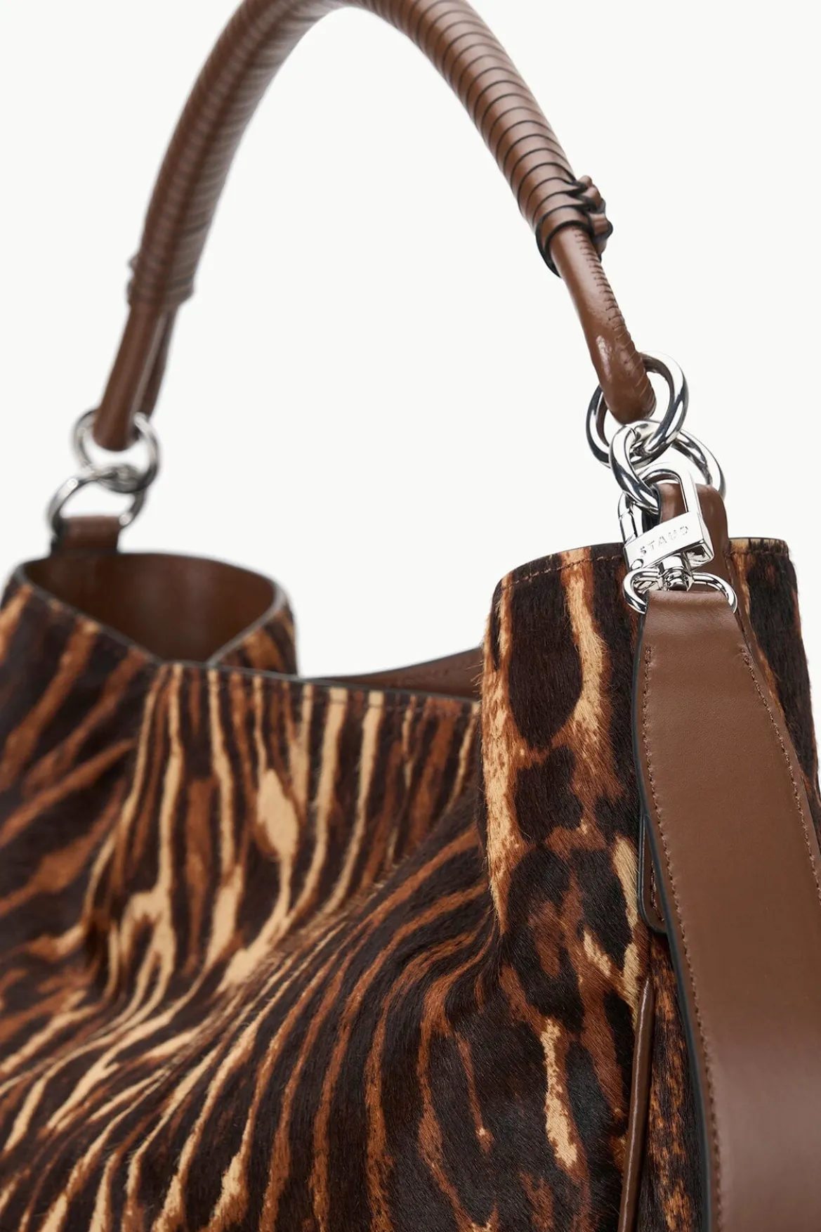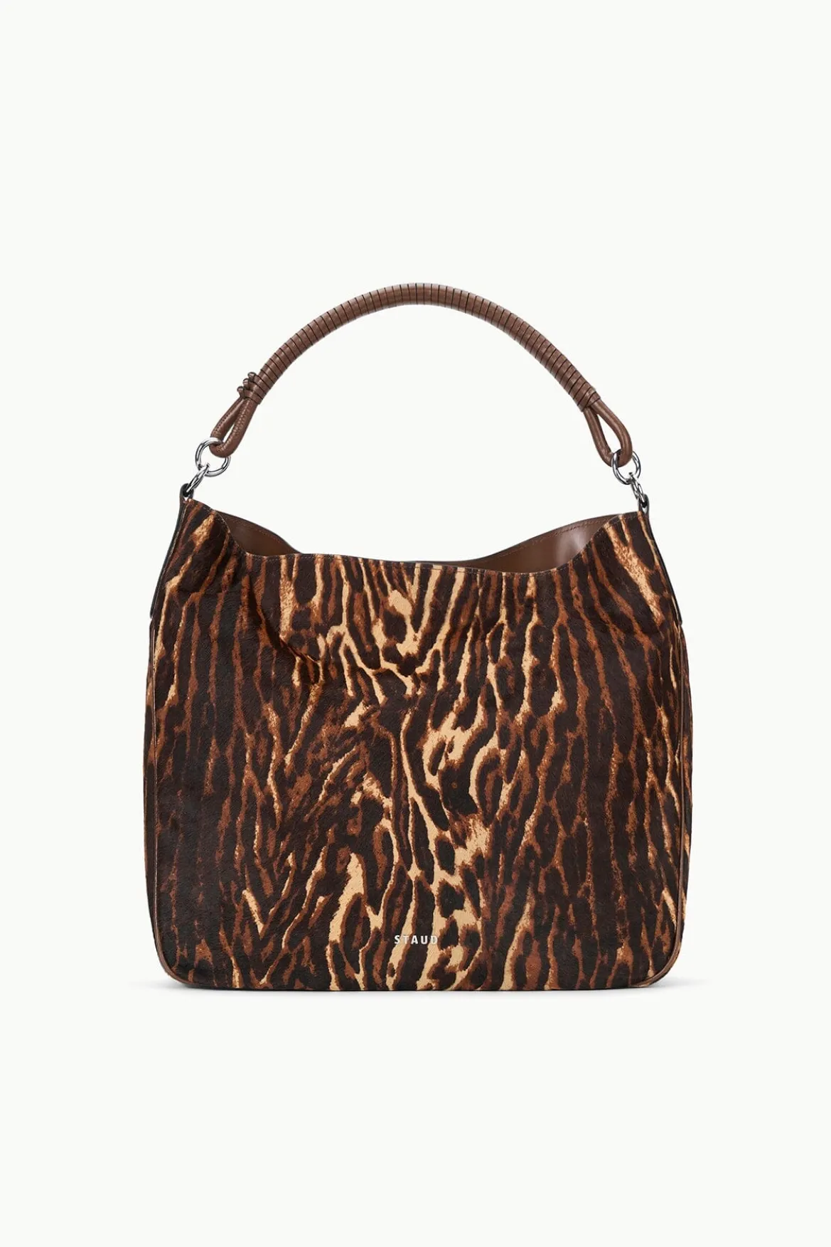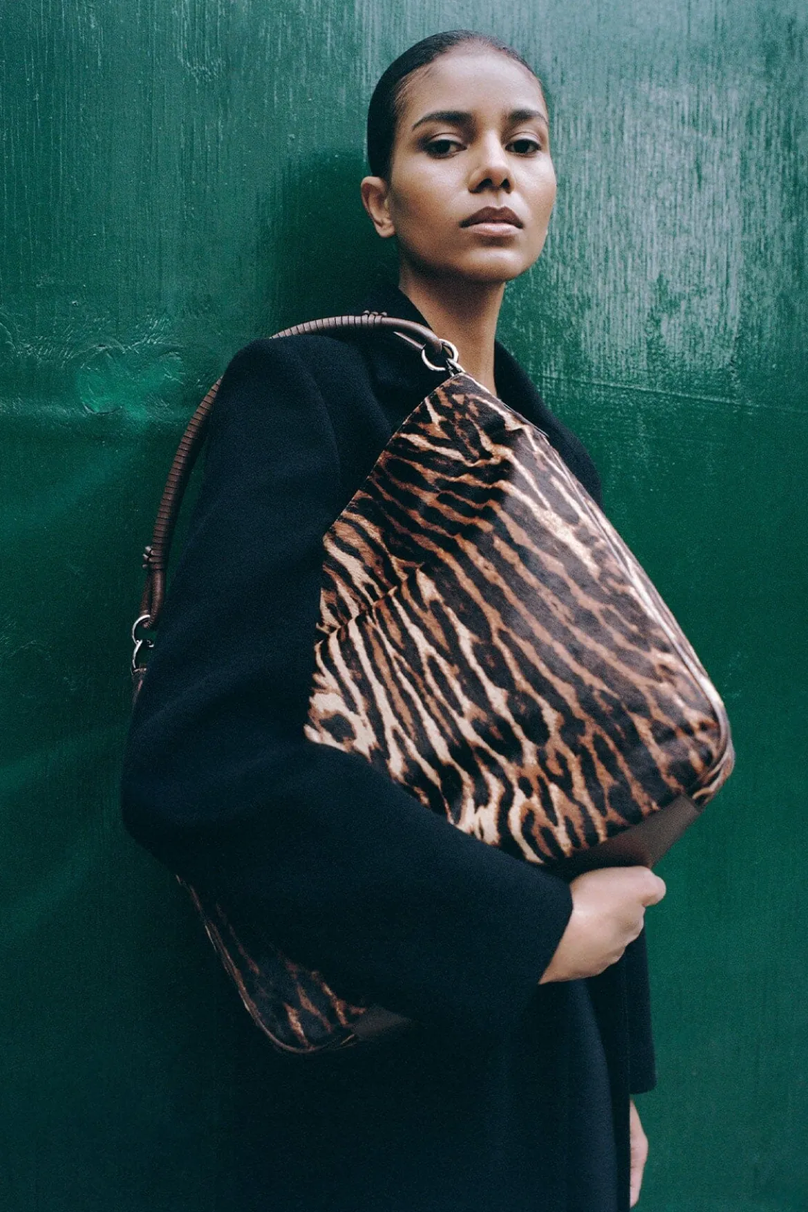 A slouchy printed haircalf hobo tote, the Perry Bag features a wrapped leather handle, a removable long shoulder strap, and a magnetic closure and suede lining.