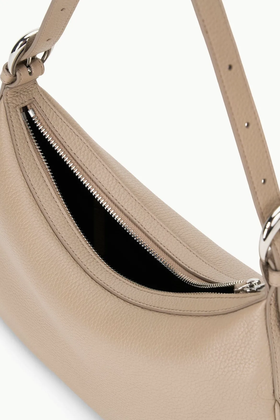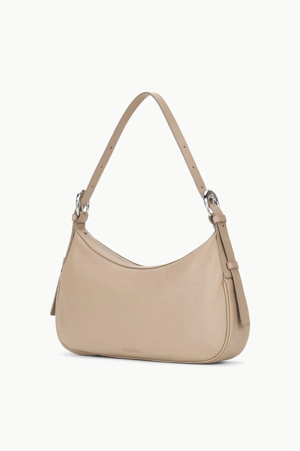 The Pine Shoulder is a pebbled leather bag with two moon shaped buckles and an adjustable shoulder strap. It features a zipper closure and an interior zipper pocket to safely store your daily essentials.
