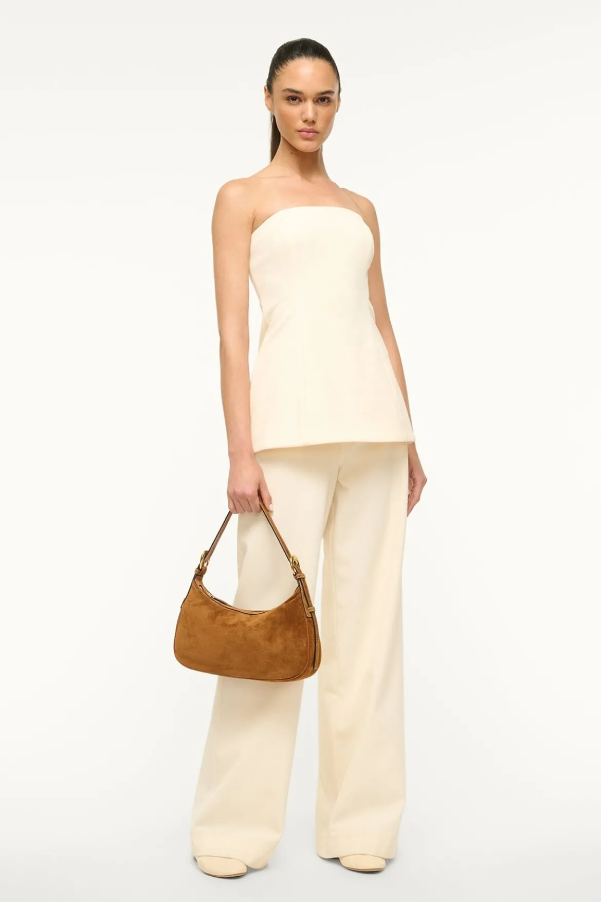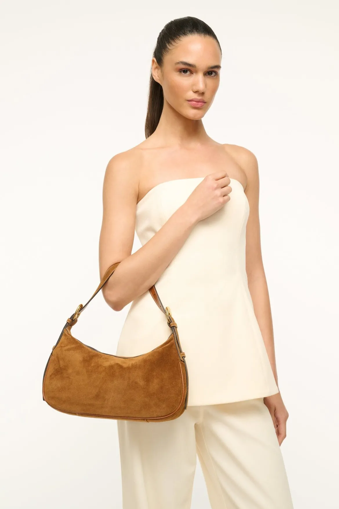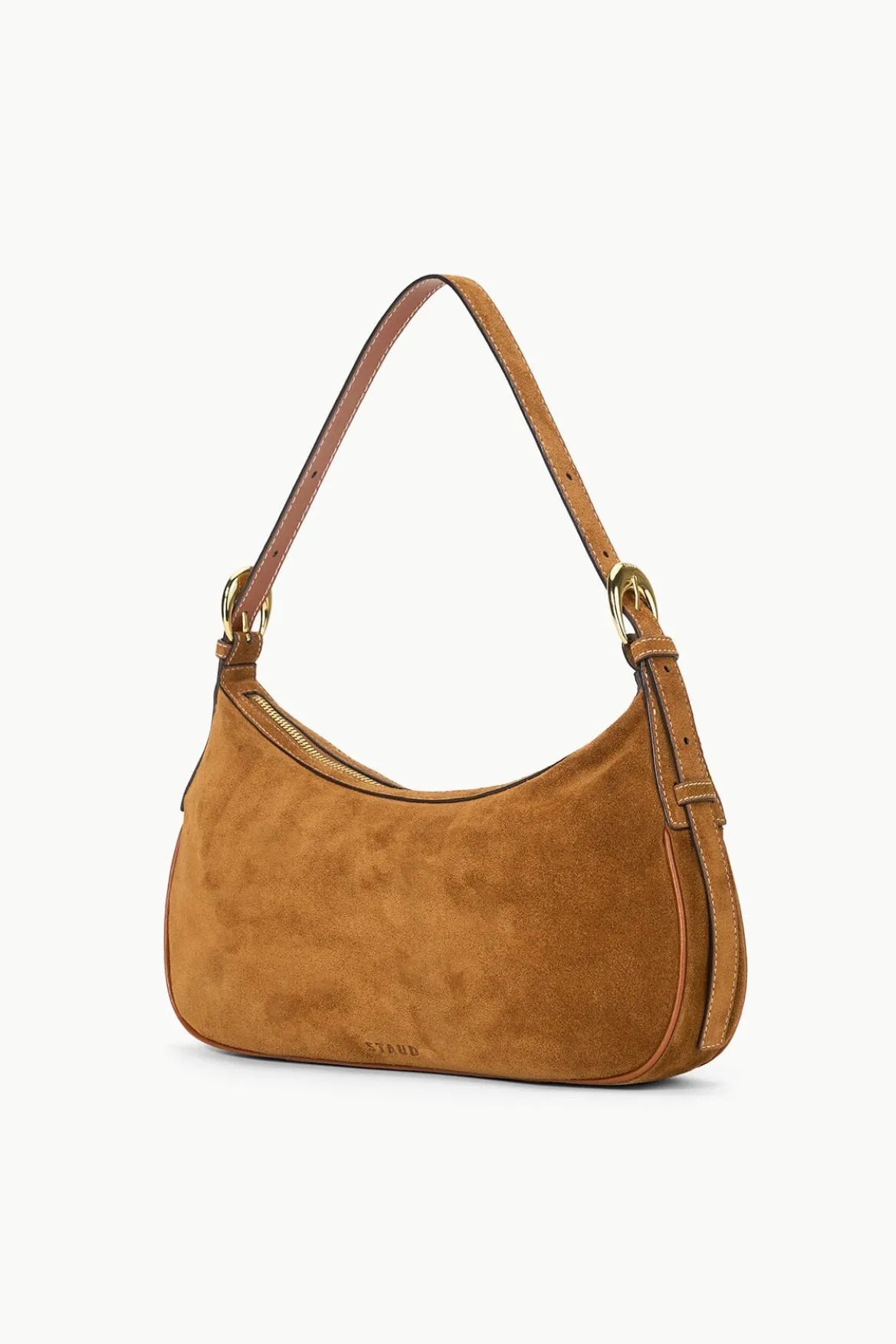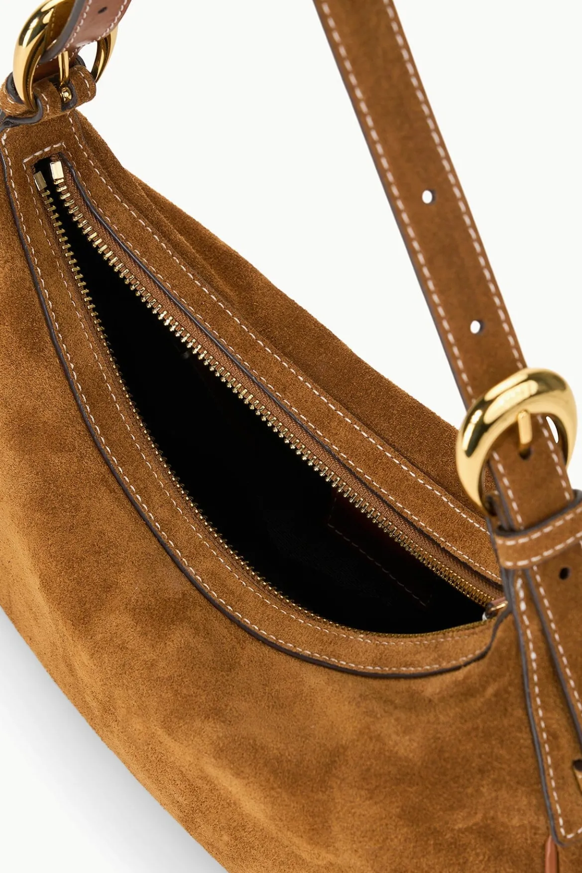 The Pine Shoulder is a soft suede bag with two moon shaped buckles and an adjustable shoulder strap. It features a zipper closure and an interior zipper pocket to safely store your daily essentials.