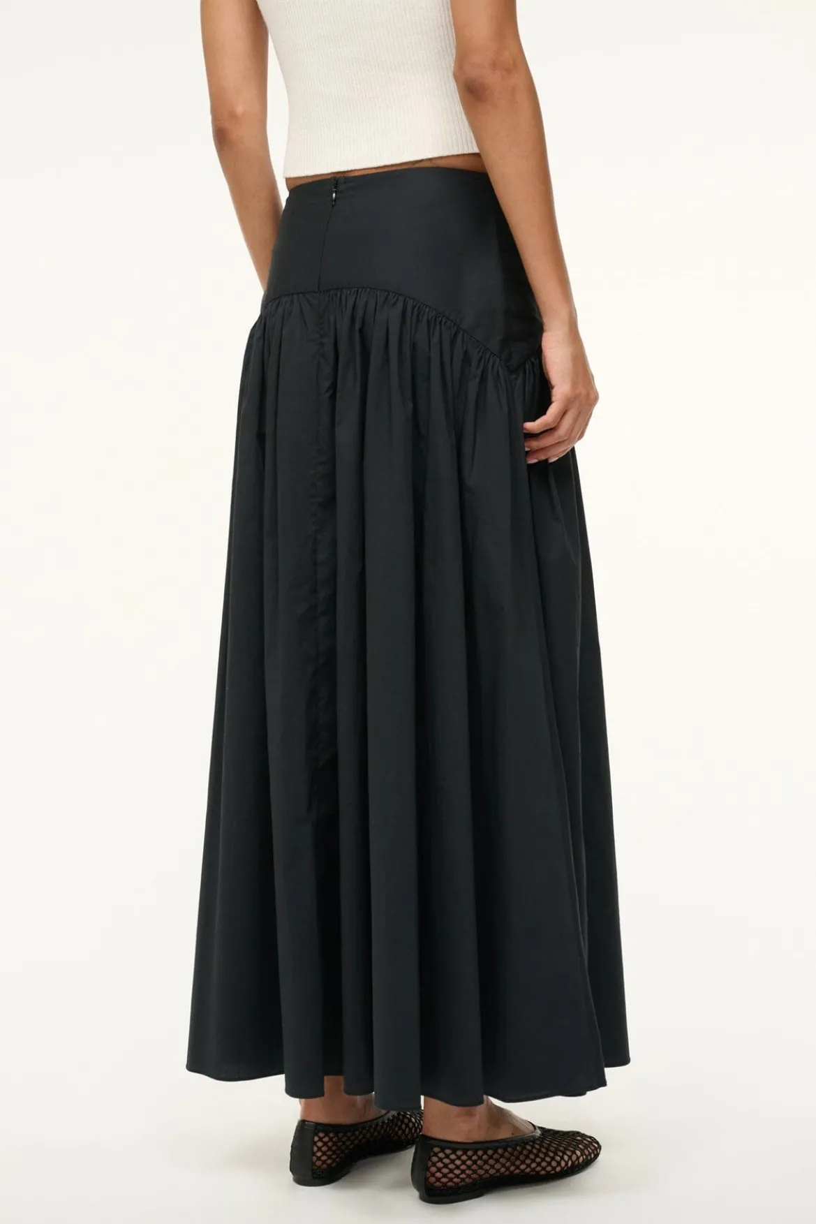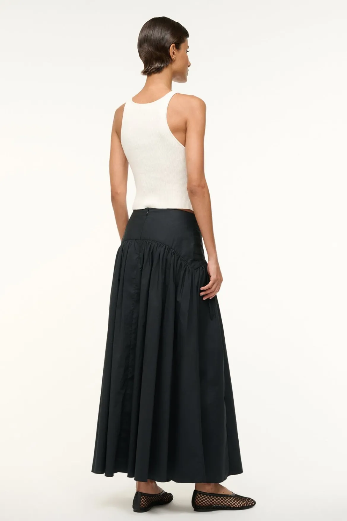 The Procida is a maxi skirt with a curved yoke at the hip and a hidden back zipper.