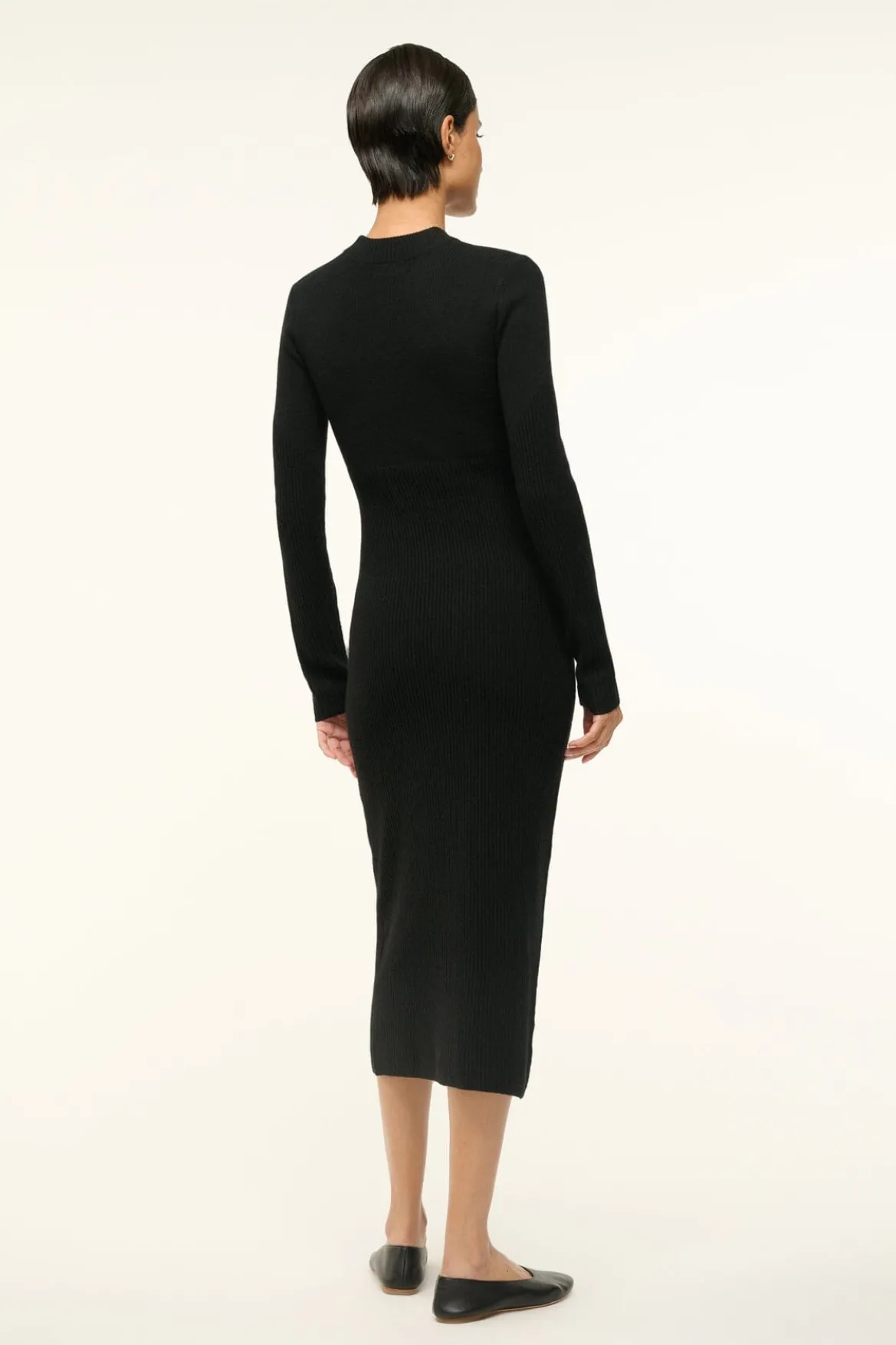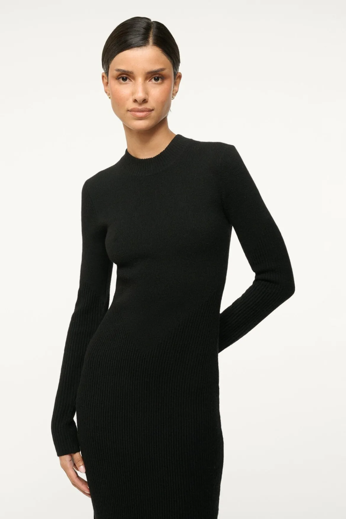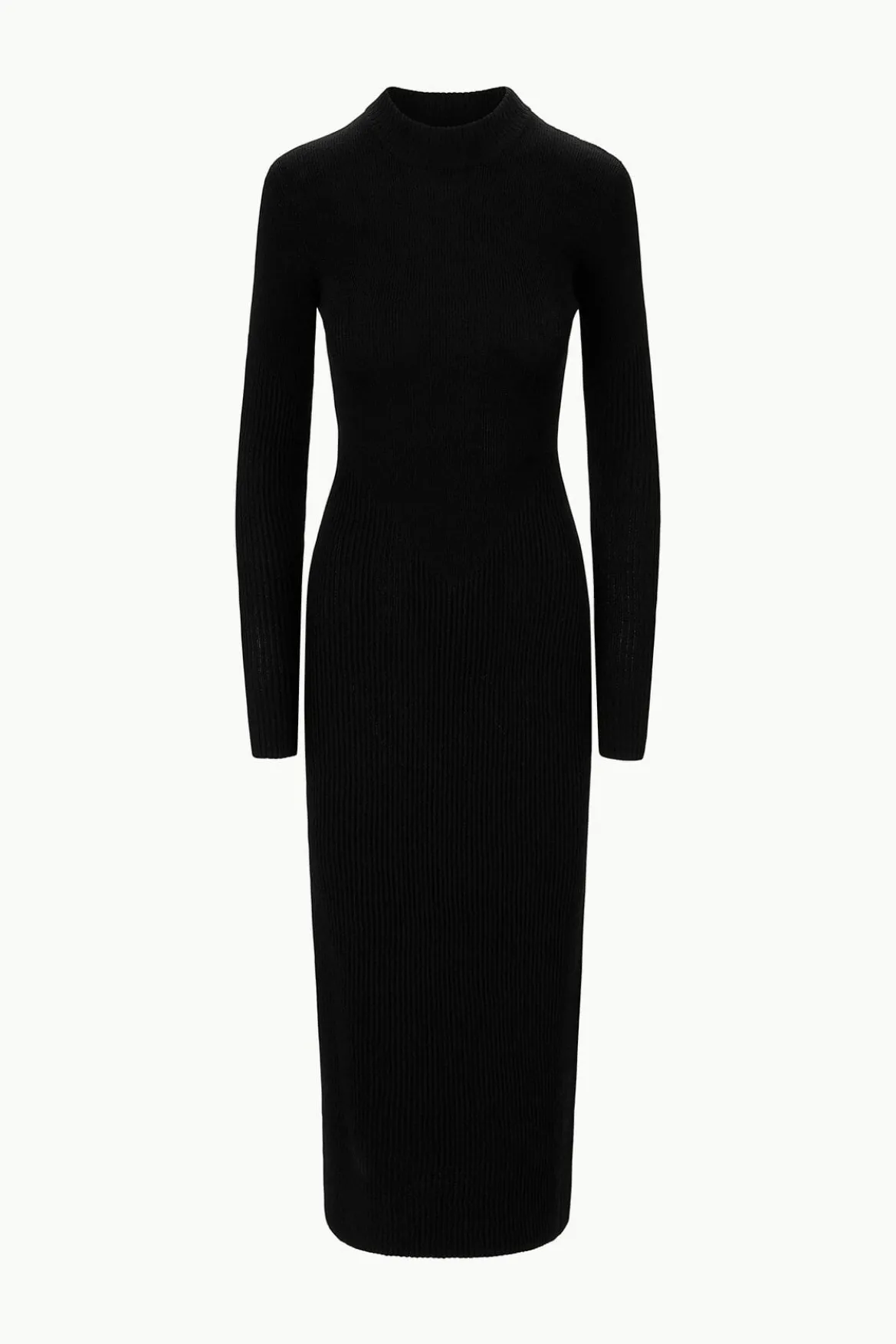The Ramona Dress is a long sleeve fitted midi dress in a soft merino knit. This style has a mock neck and has ottoman stitch detailing for a flattering fit.