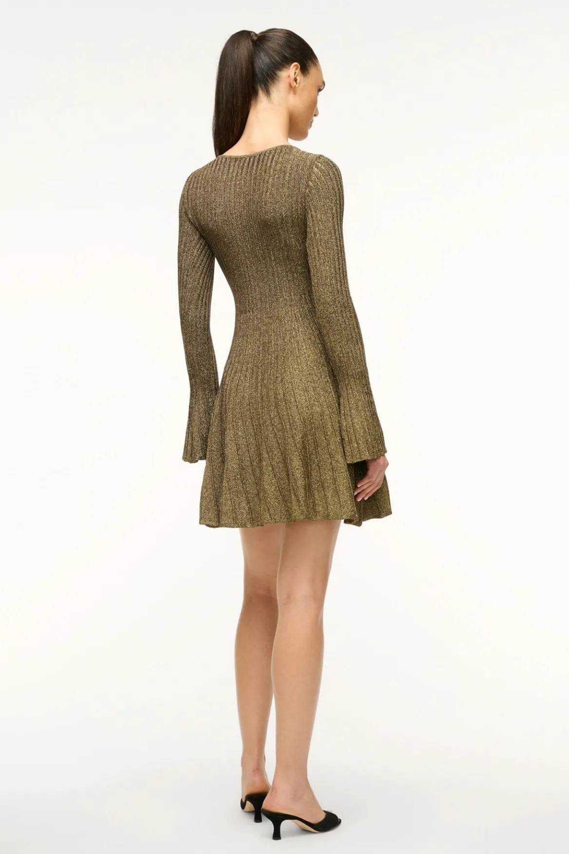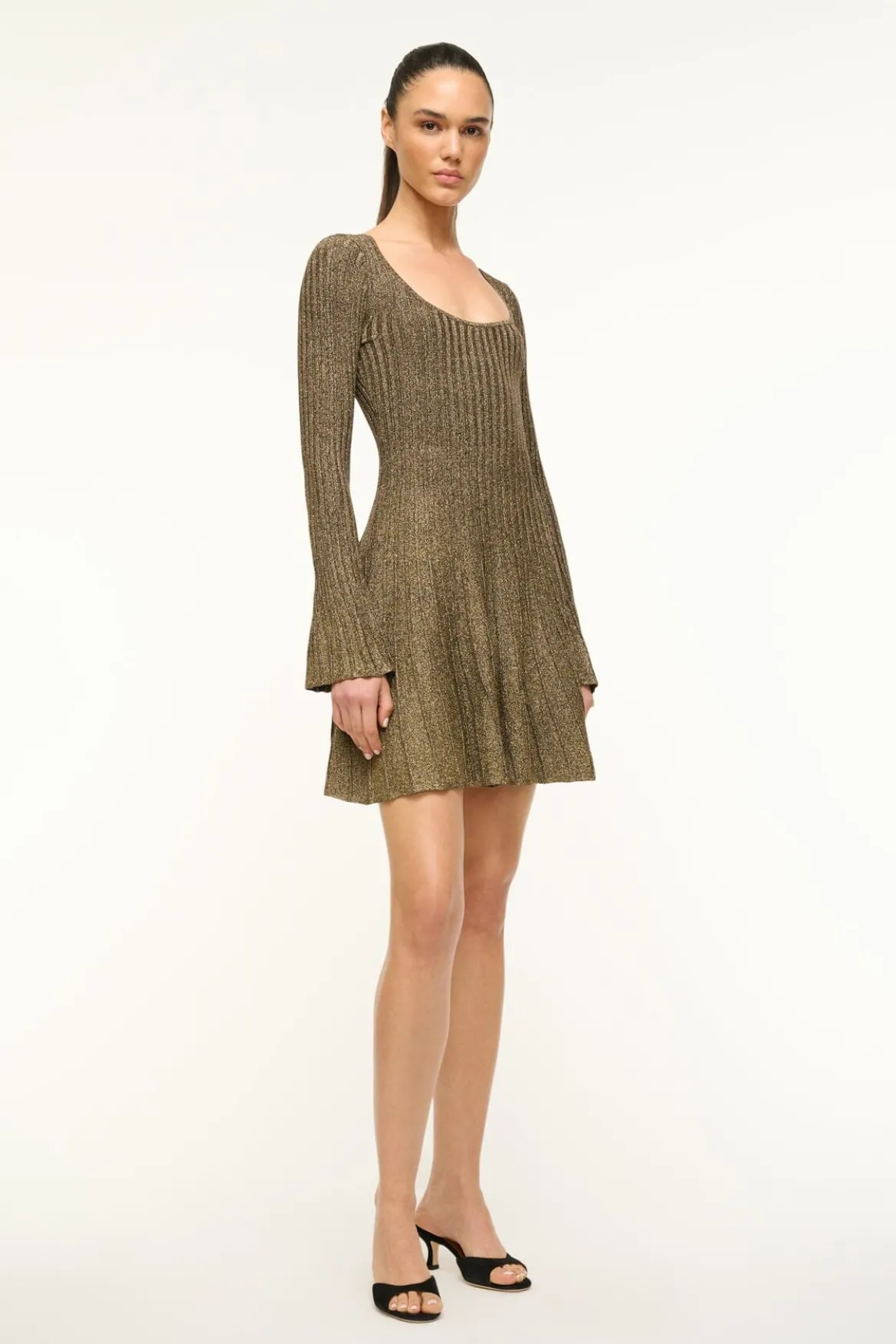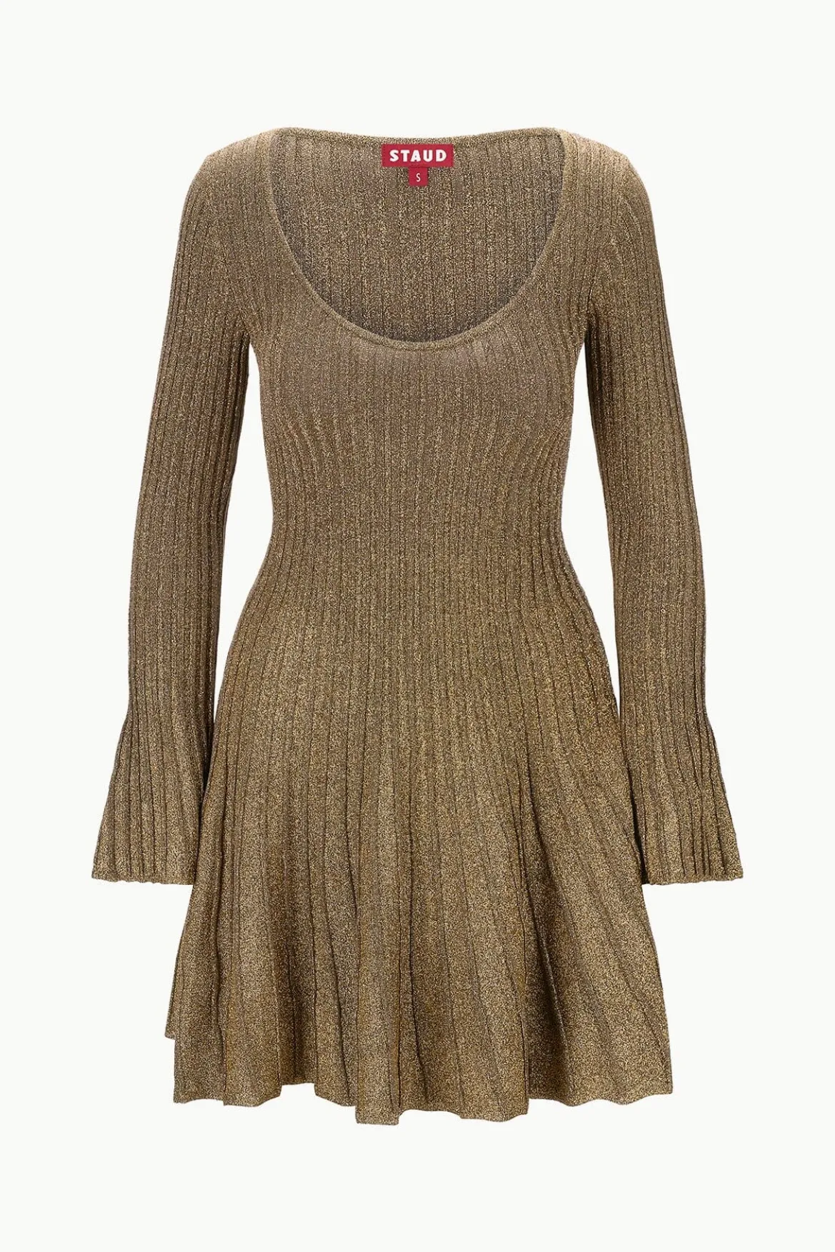 The Raquel Dress is crafted from a lurex compact knit fabric and features bell sleeves and a scoop neck.