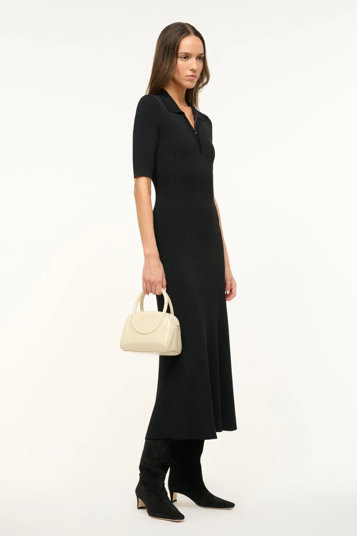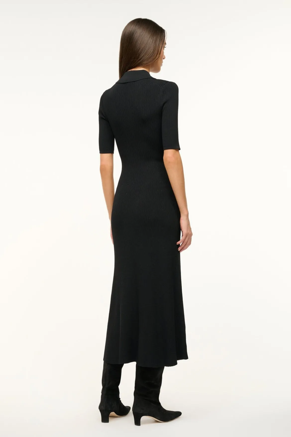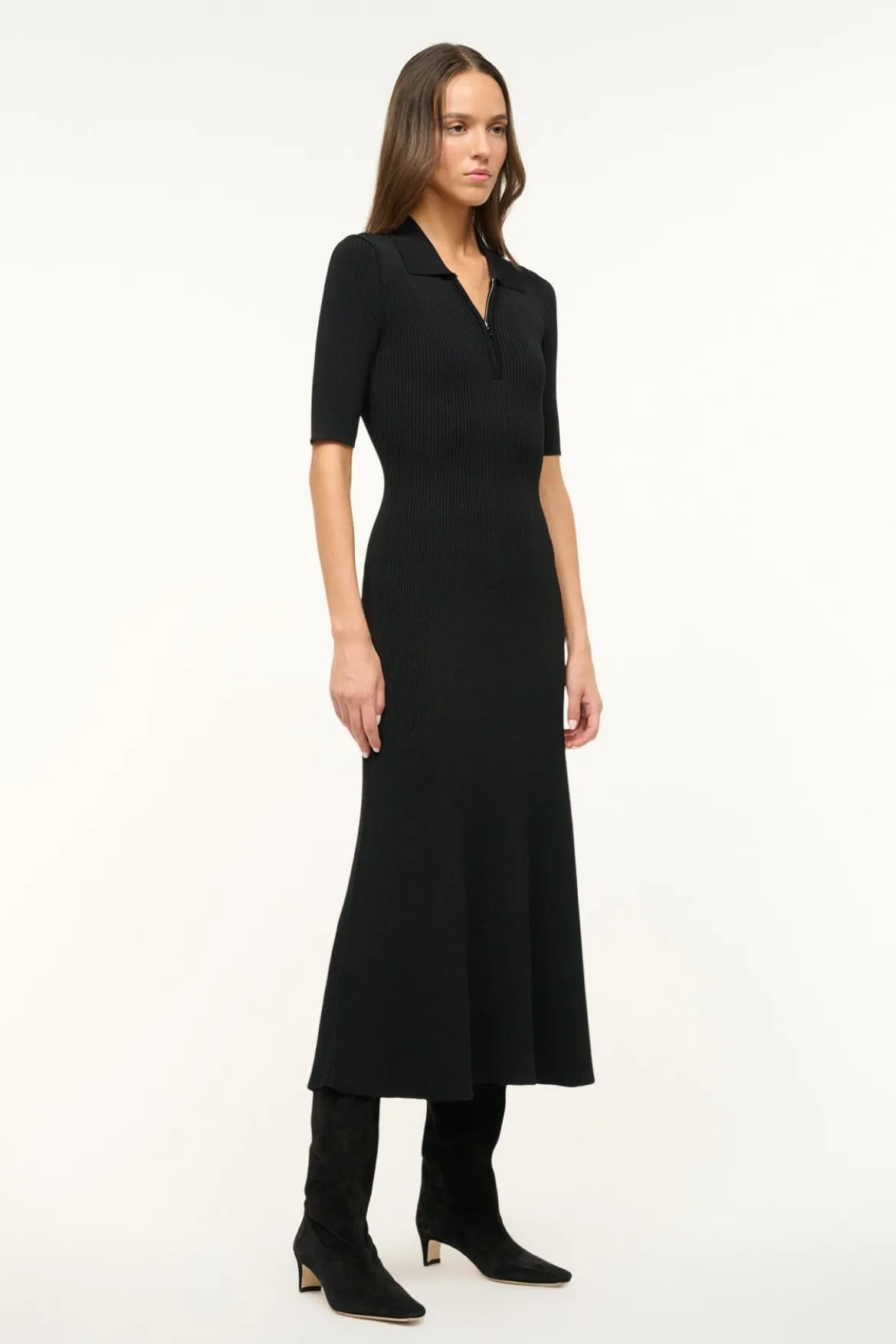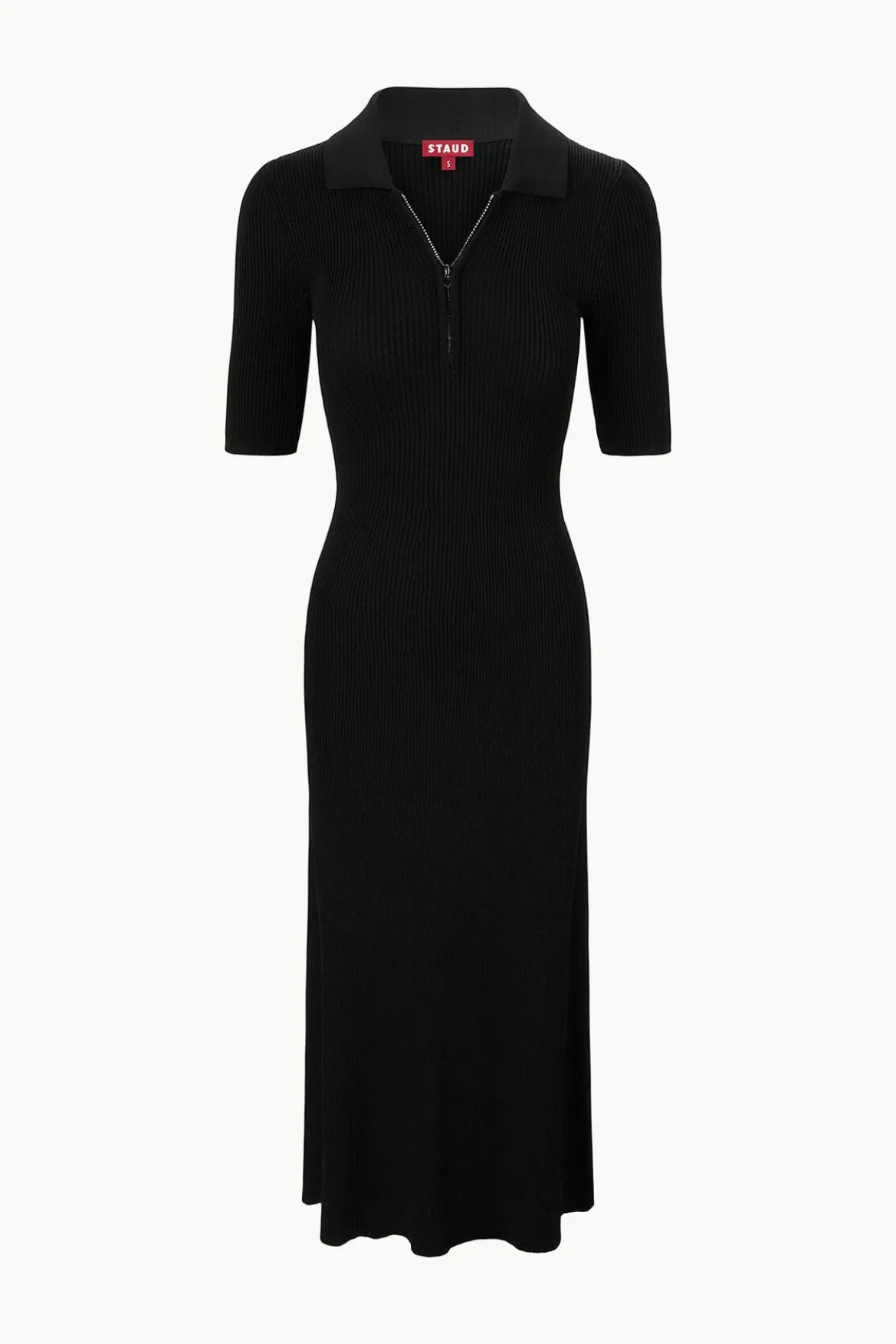 An ankle-length, short sleeve dress made from a compact rib knit fabric. The Roland features a collar and zip neckline detail.