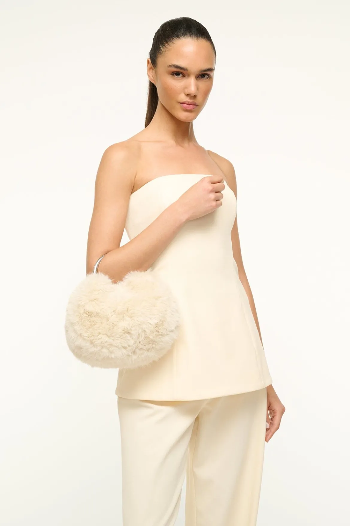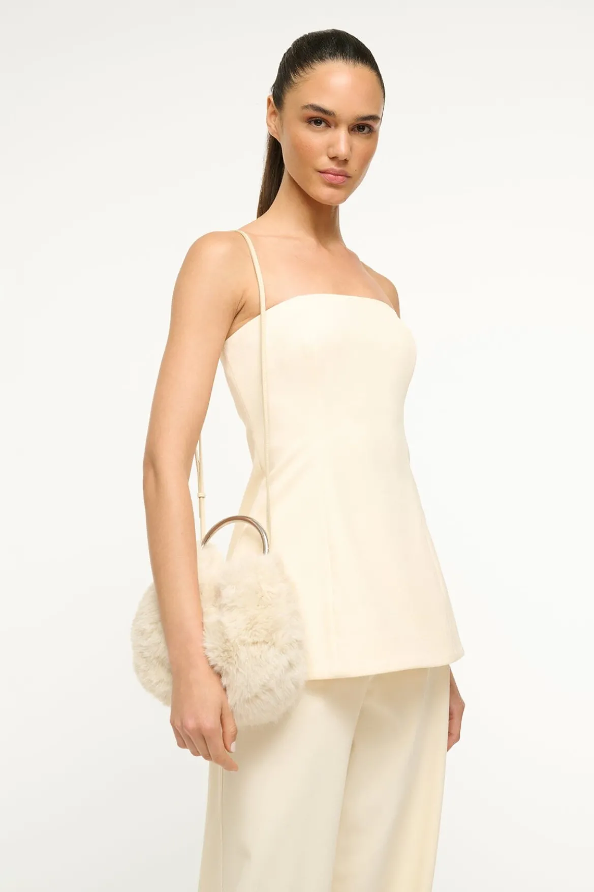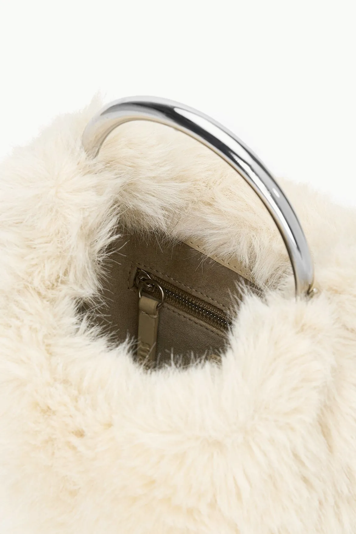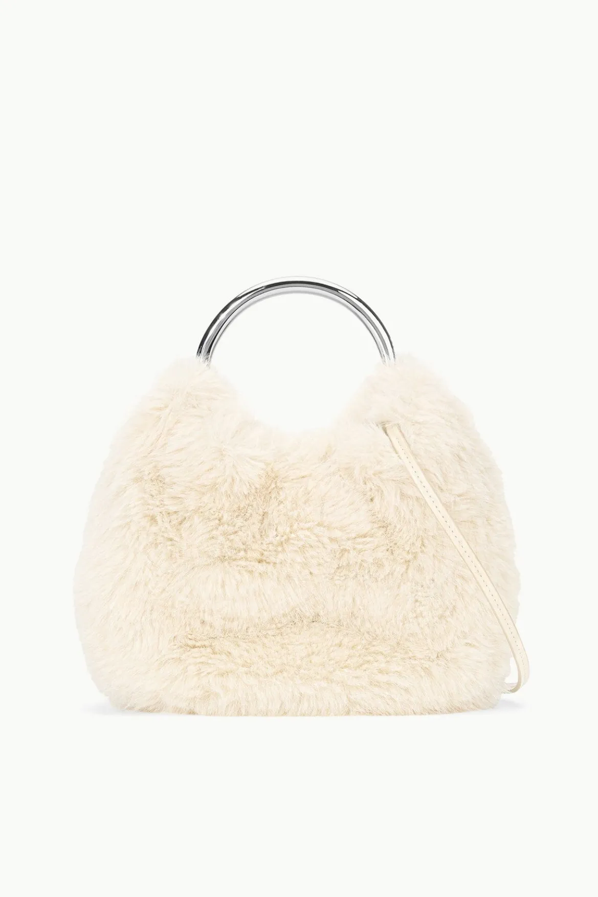 The Romeo Faux Fur Bag features a metal handle, magnetic closure and an interior pocket. It can be carried as a handheld bag or as a crossbody with the detachable long strap.