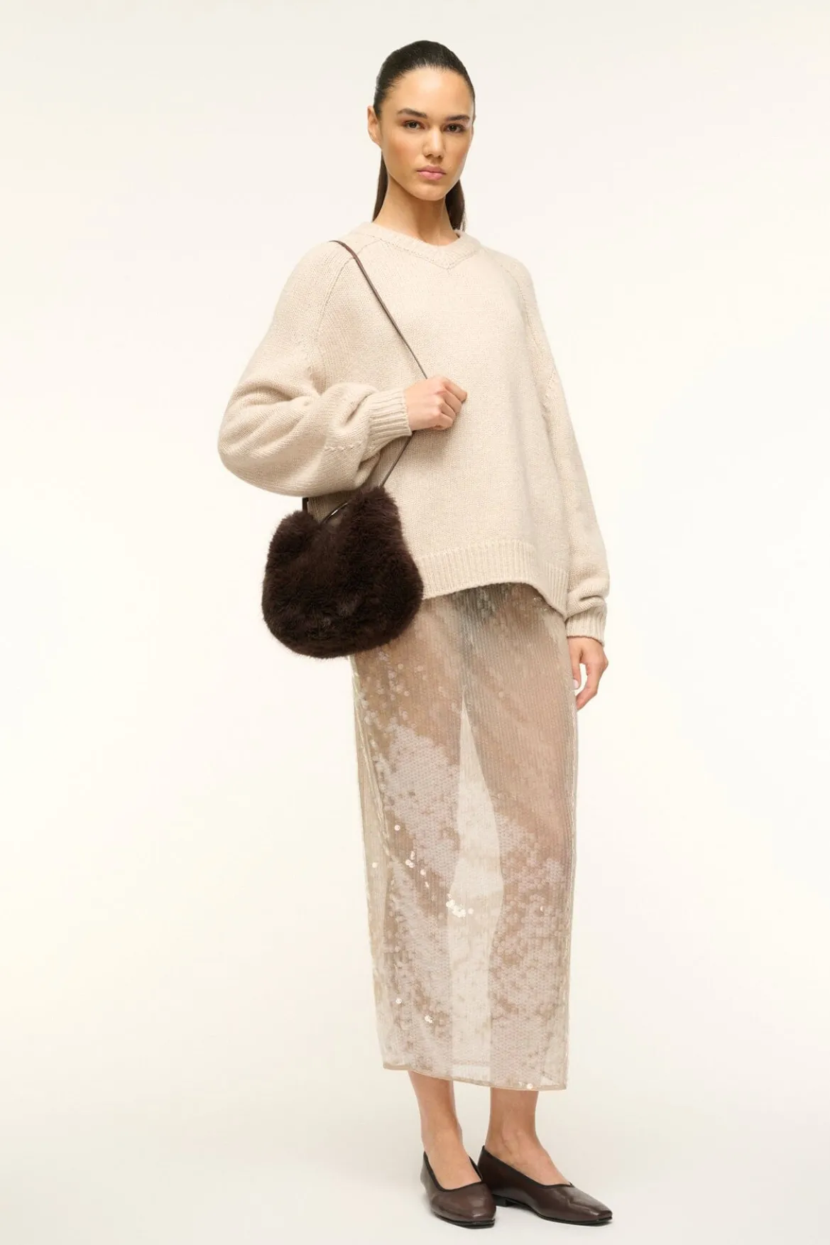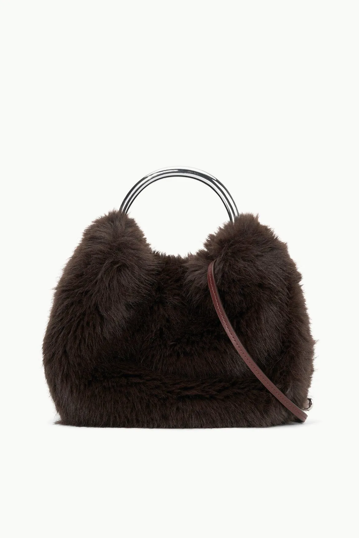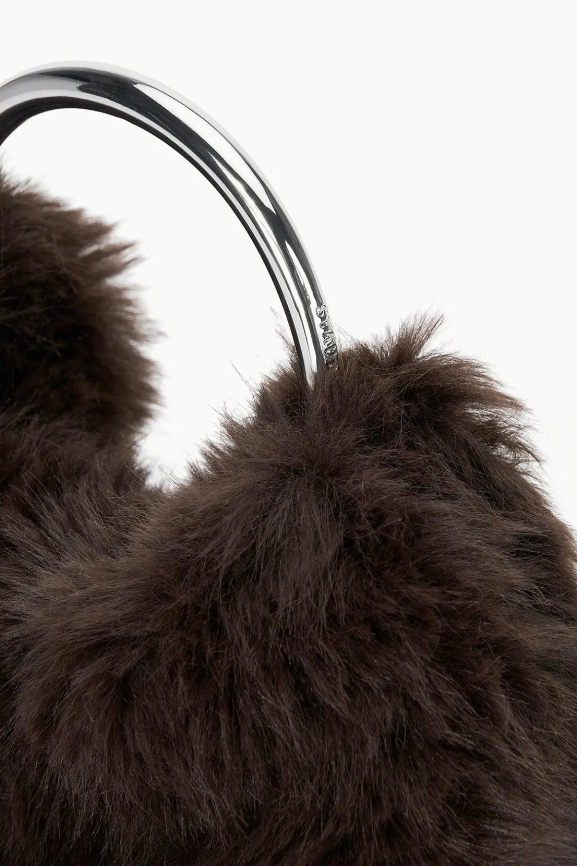 The Romeo Faux Fur Bag features a metal handle, magnetic closure and an interior pocket. It can be carried as a handheld bag or as a crossbody with the detachable long strap.