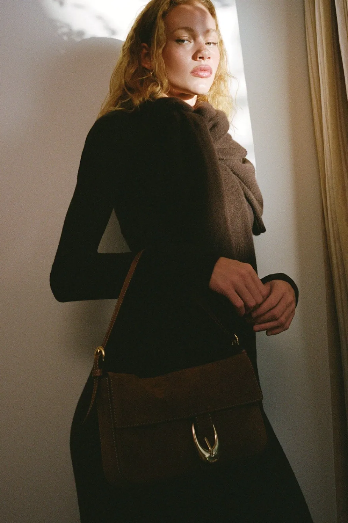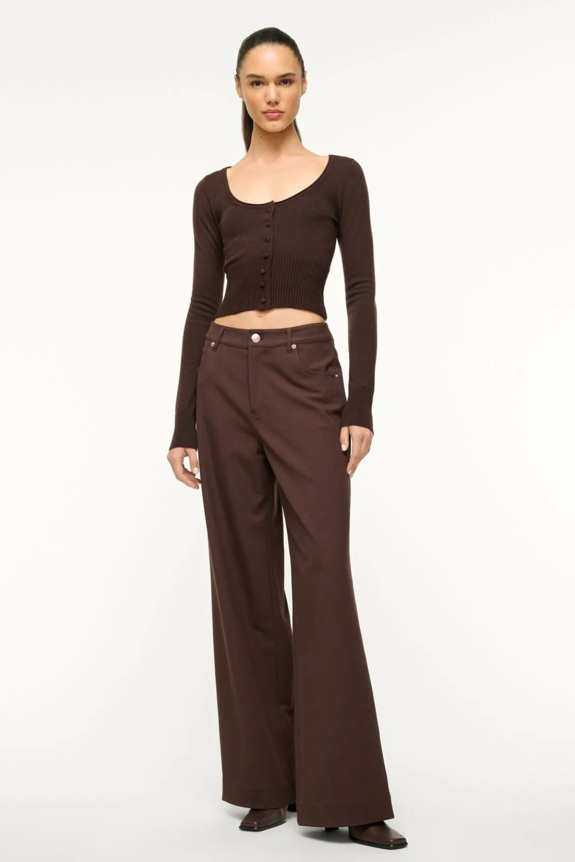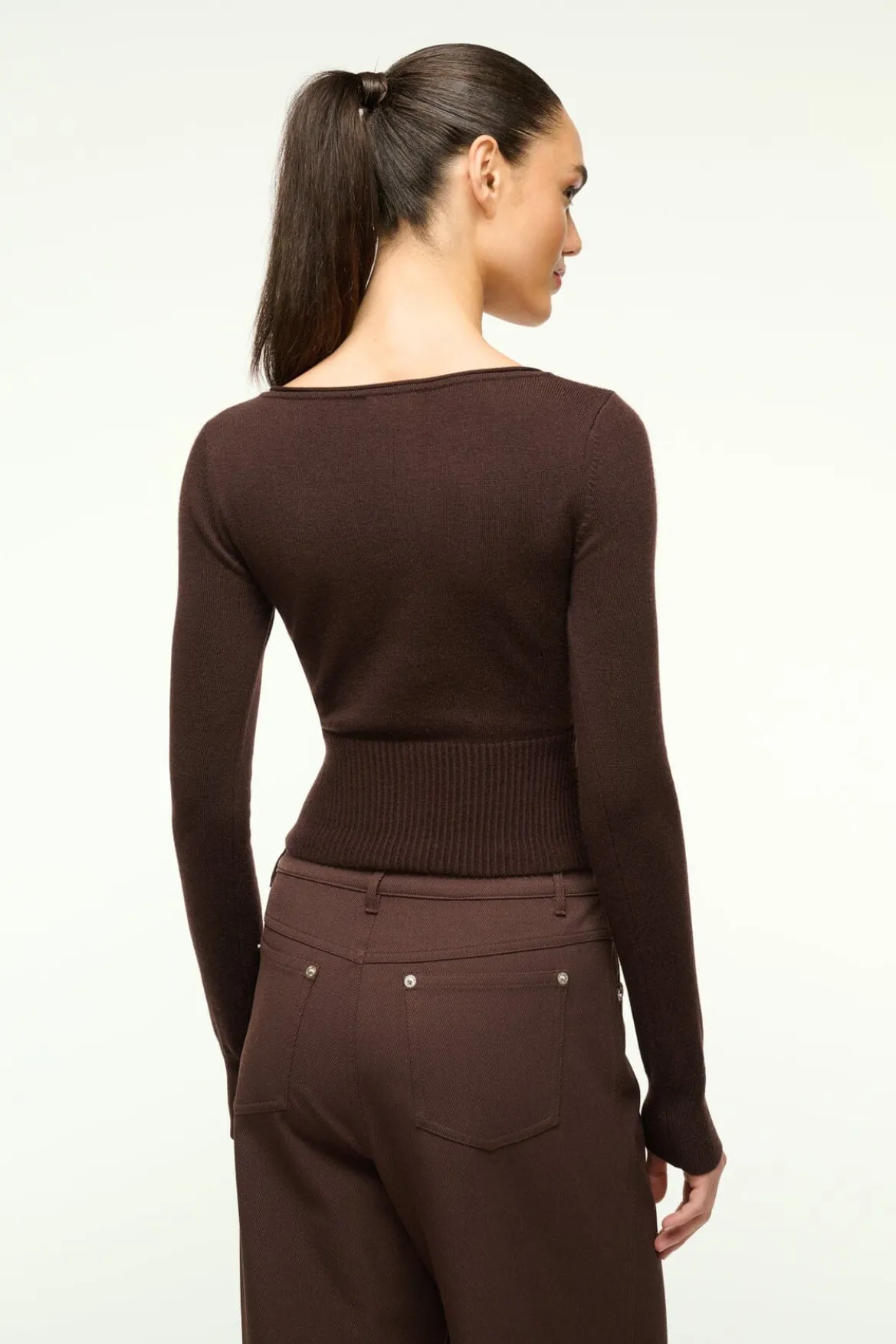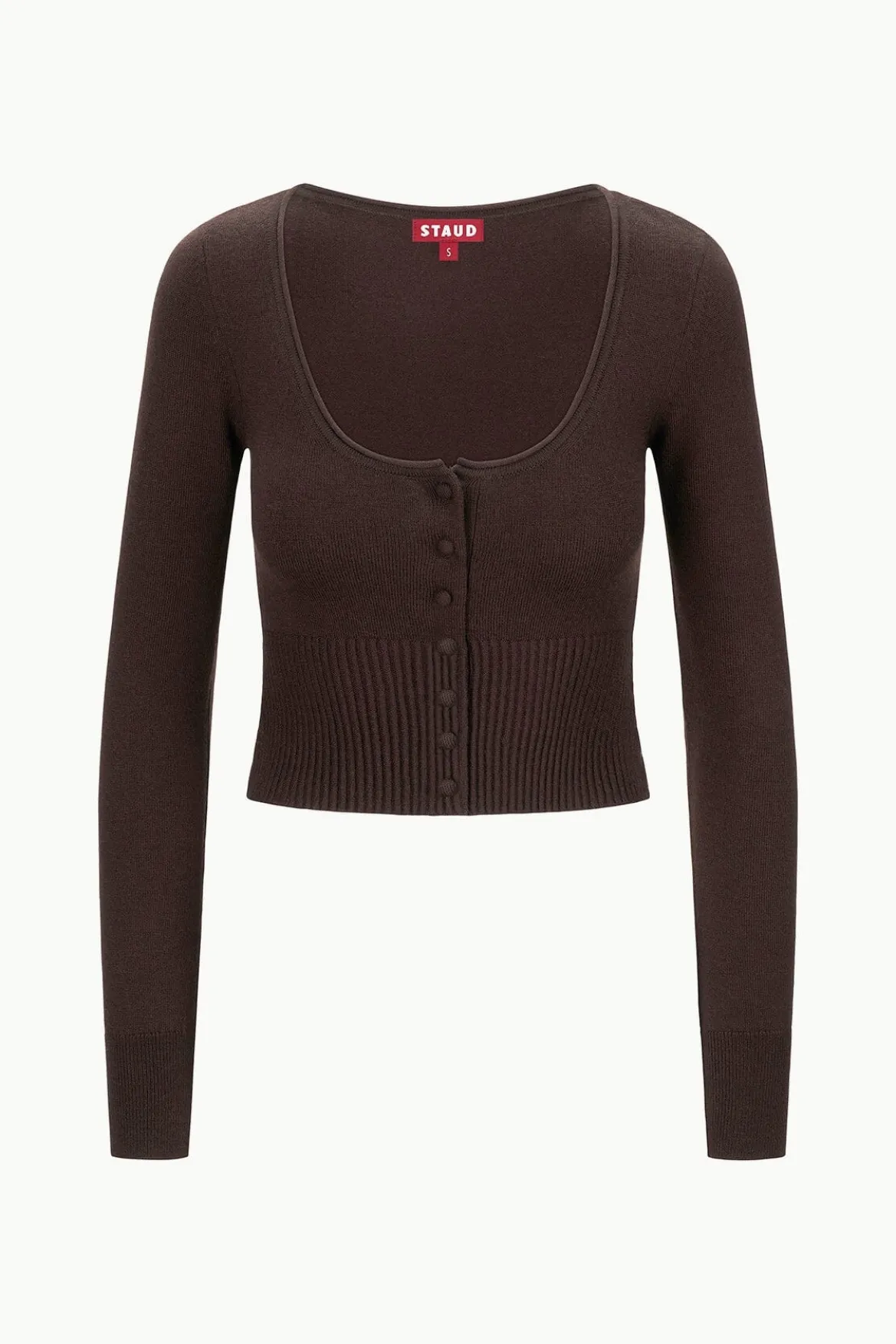 The Sabrina Sweater is a fitted scoop neck cardigan with center front buttons and ribbed waist detailing.