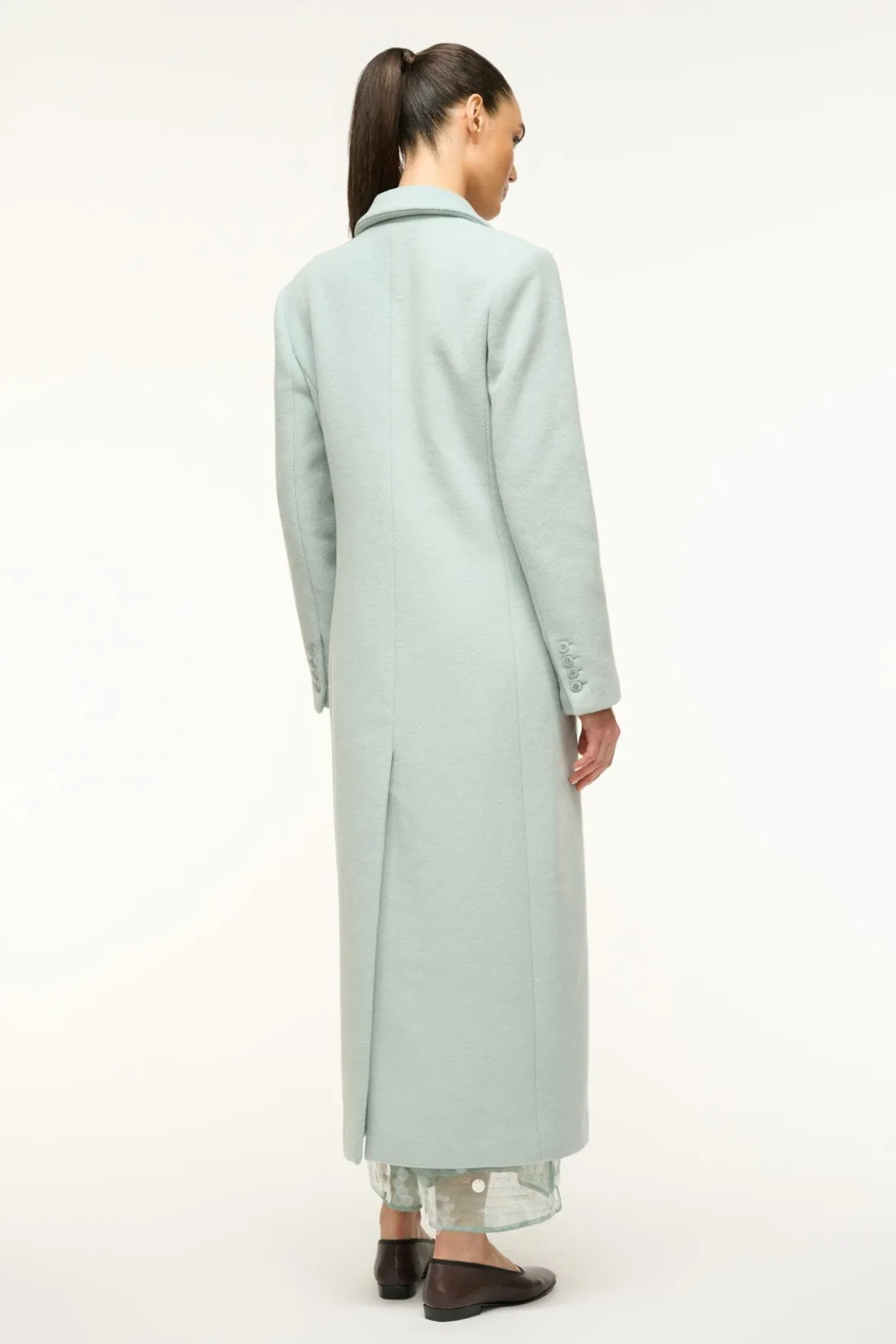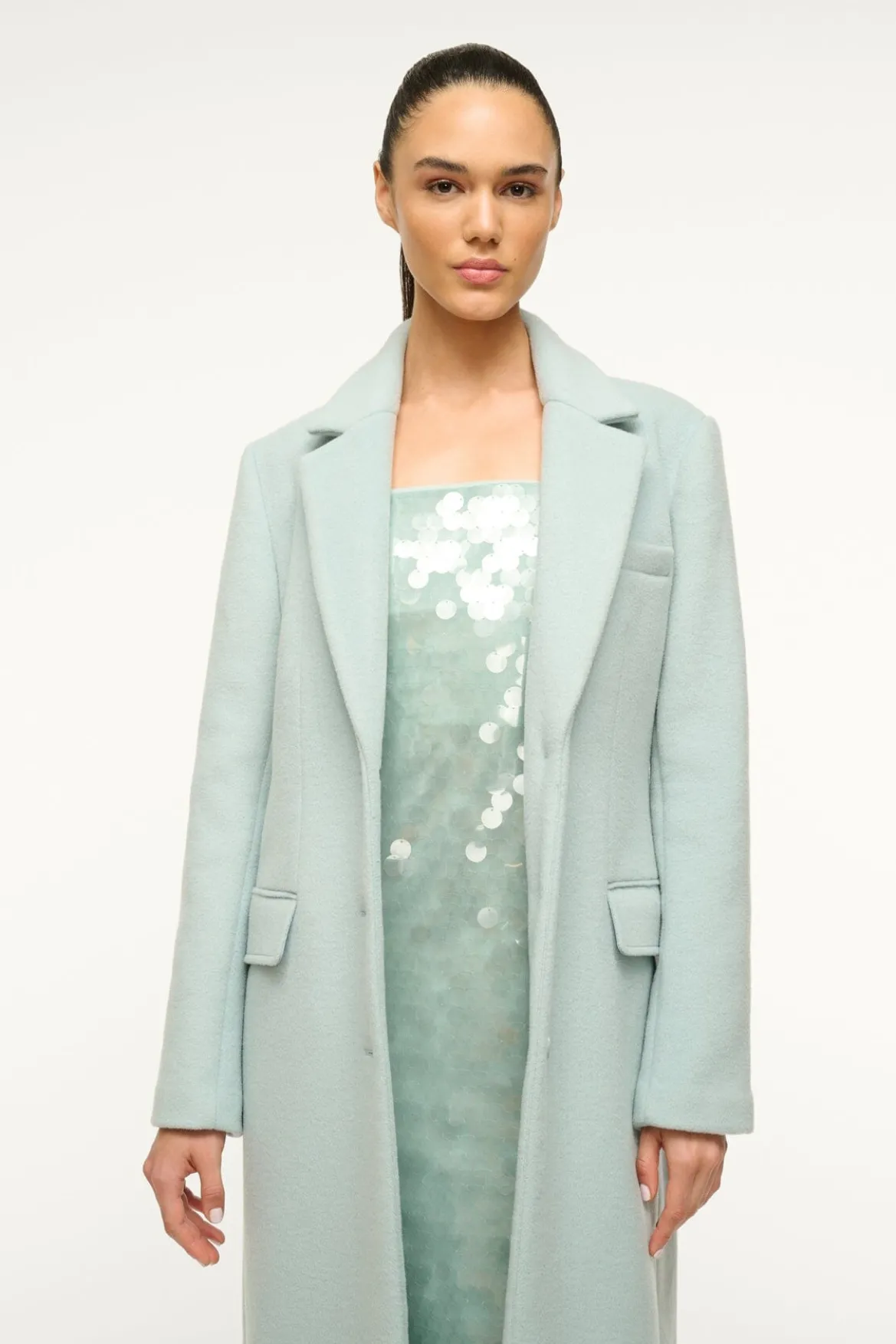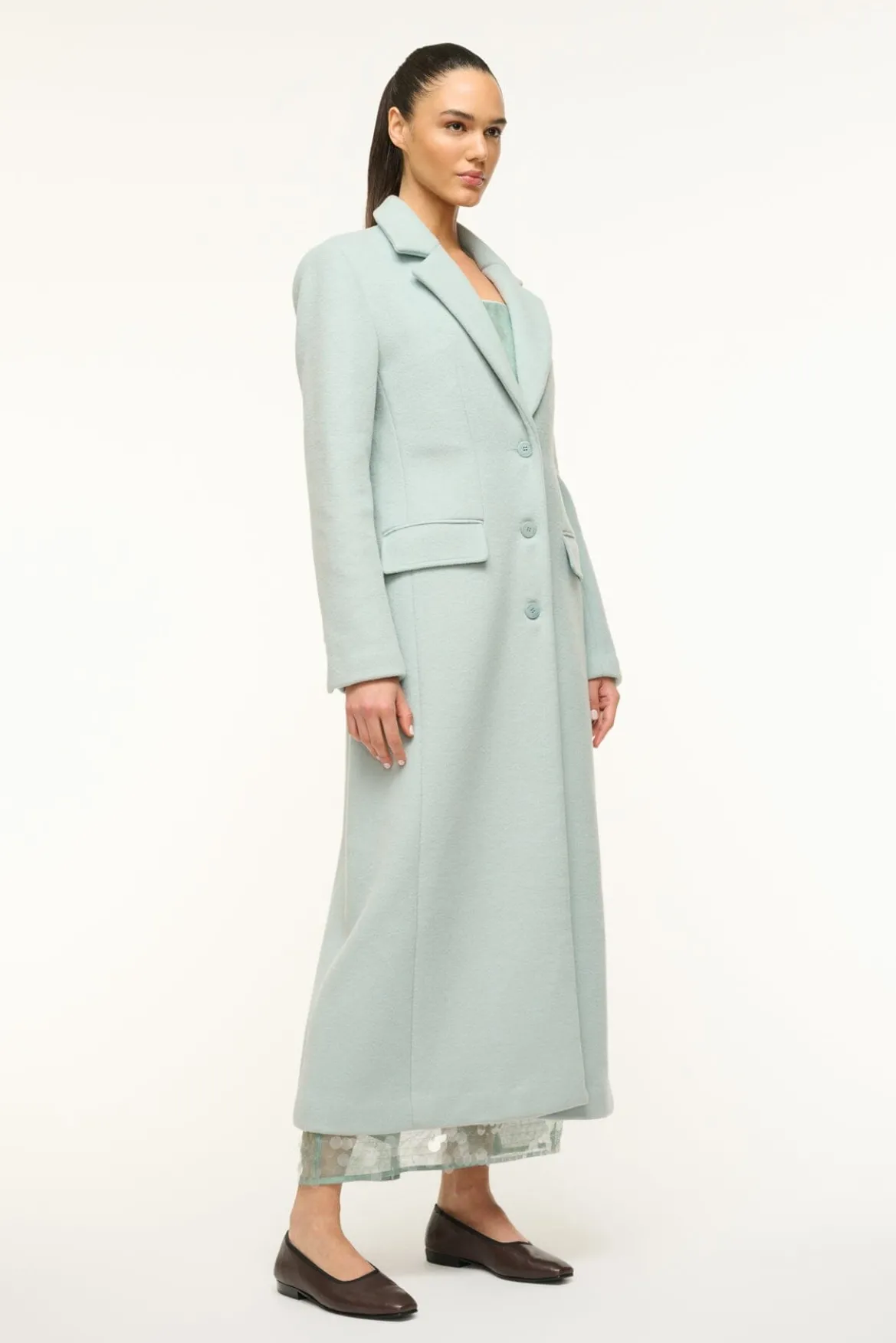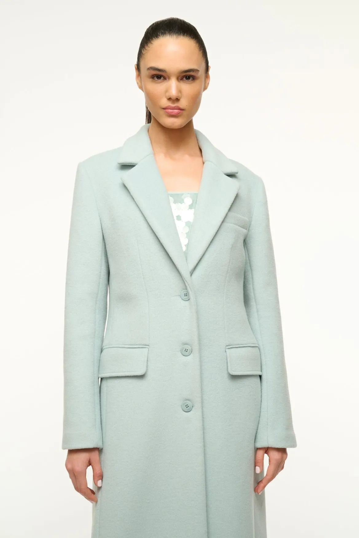 A single-breasted coat fashioned in a blazer style, the Sanza features a three button front and two flap pockets at the hips. This essential medium-weight coat is crafted from a wool blend.