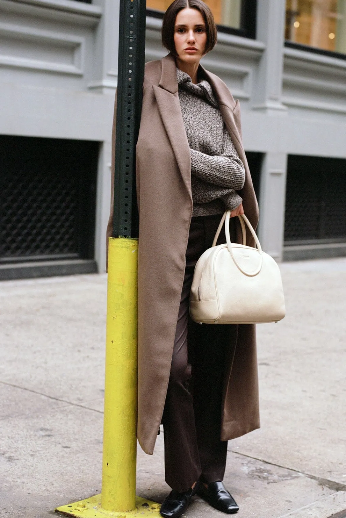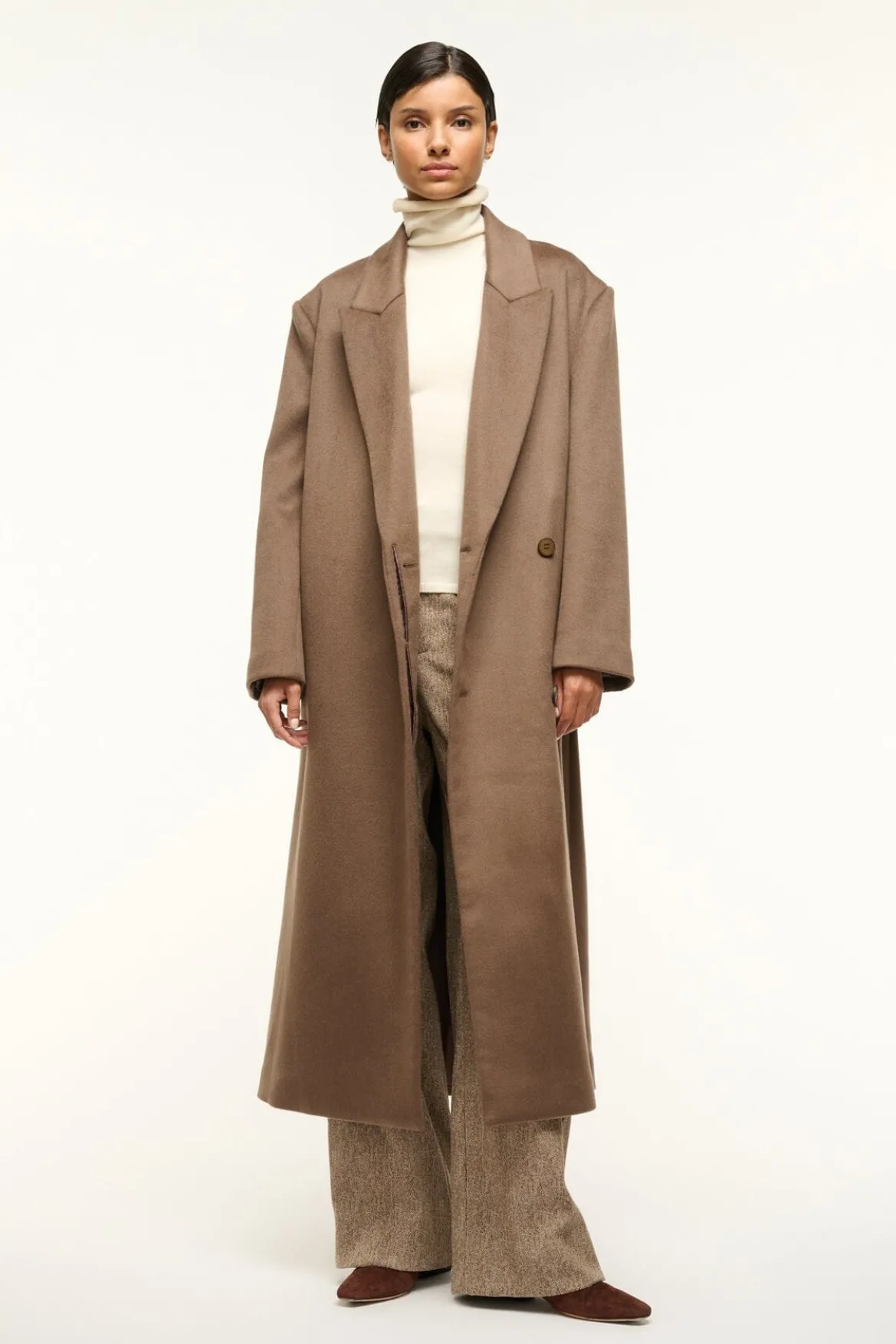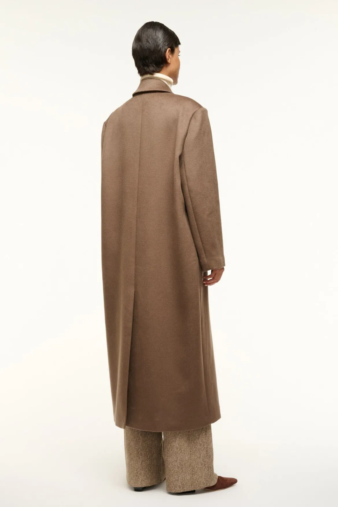 The Serge Coat is an oversized blazer-inspired coat with a crossover closure and a peaked collar.