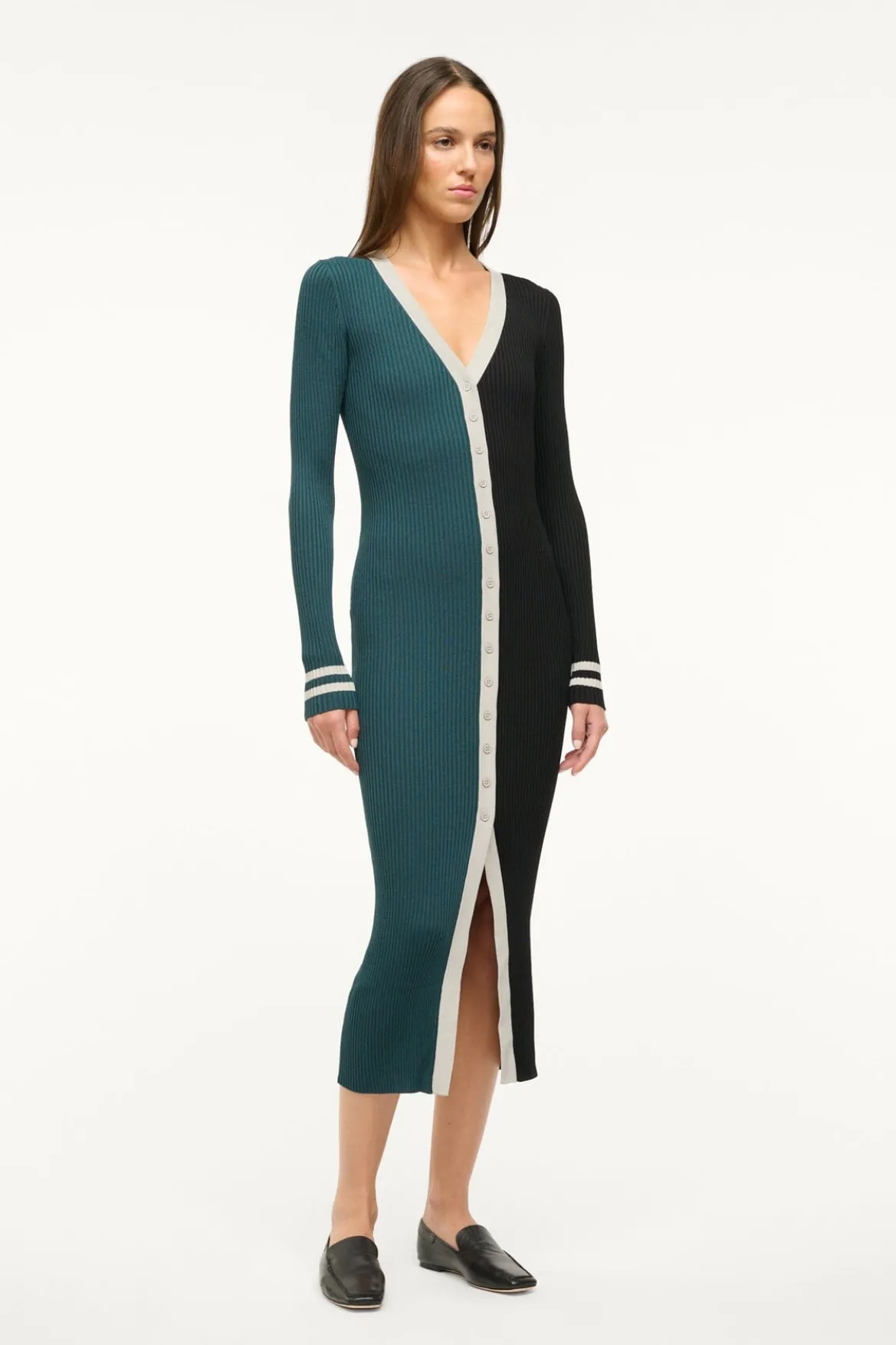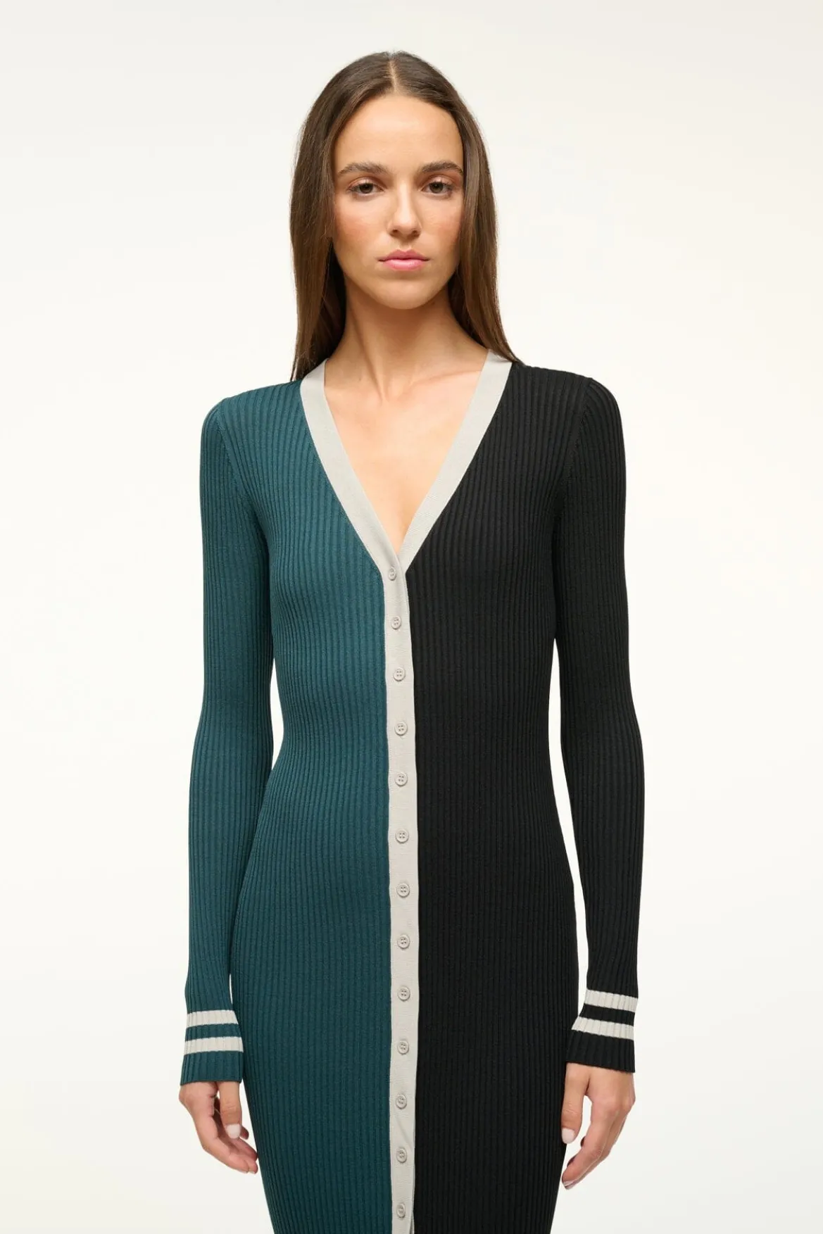 Our signature style, the Shoko Sweater, is updated to support your favorite NFL teams. The NFL STAUD Shoko Sweater is made out of our stretchy, comfortable compact rib knit fabric, and can be worn as a cardigan or a dress. This special capsule features our signature color blocked pattern and a NFL team logo on the back.