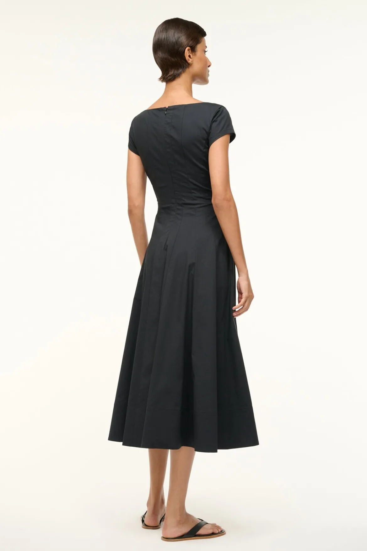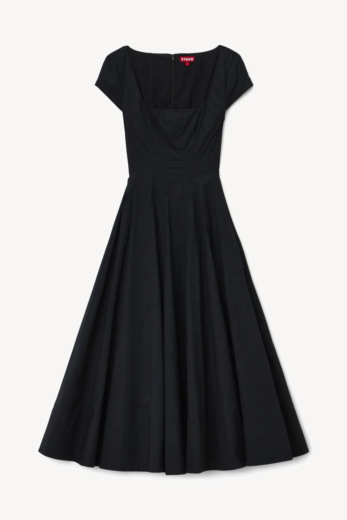 Our classic midi poplin dress in a short sleeve update. This style is fashioned after the STAUD signature Wells Dress and features the same corset-style panel construction and a-line skirt.